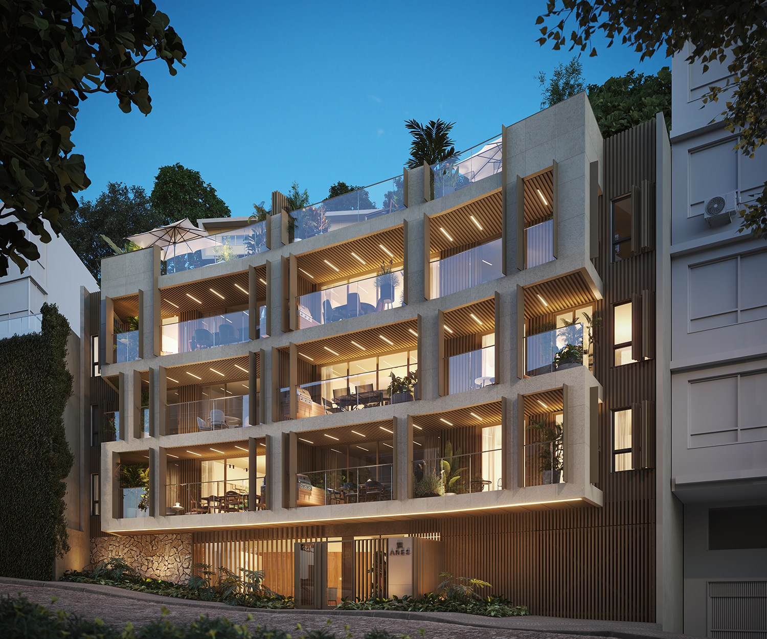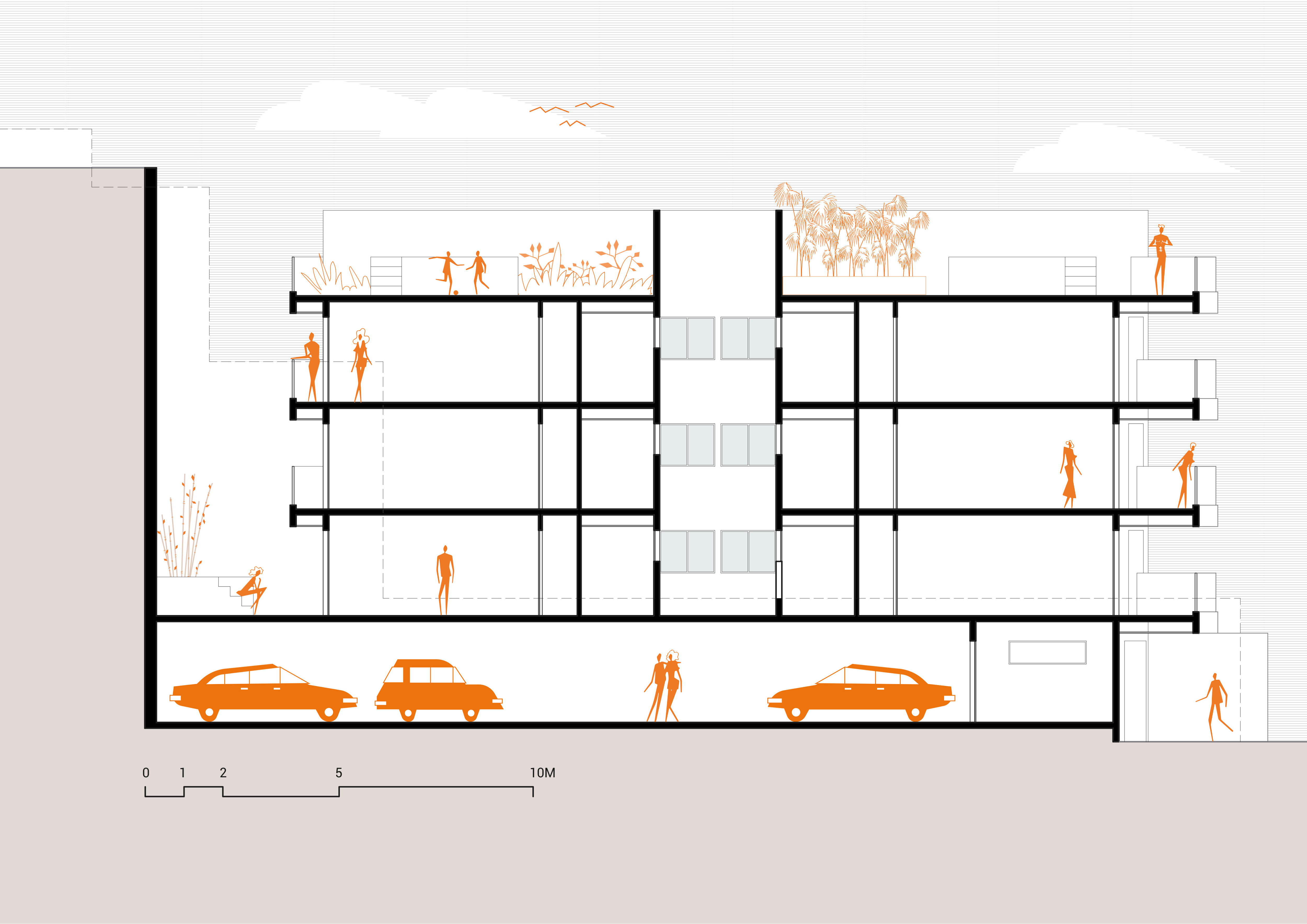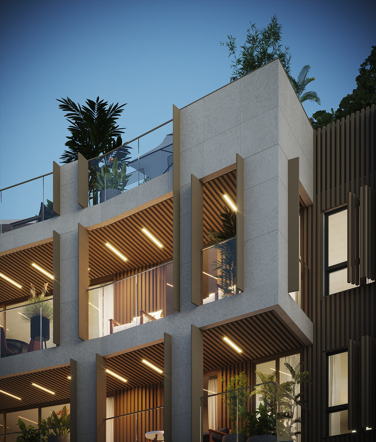 Com esses elementos em mente, as diversas linhas traçadas verticalizam a construção de forma esbelta e alinham as diferentes camadas e materiais usados no projeto ao criar um tecido que abrigue o morar no interior do edifício. O uso de elementos ripados em tom escuro protegem a chegada da rua e aquecem o interior das casas, além de promover a integridade visual do edifício. Ao mesmo tempo, o ritmo dos brises das varandas emoldura a vista por seus espaços vazados e filtra a relação com a rua através de uma camada clara e iluminada.