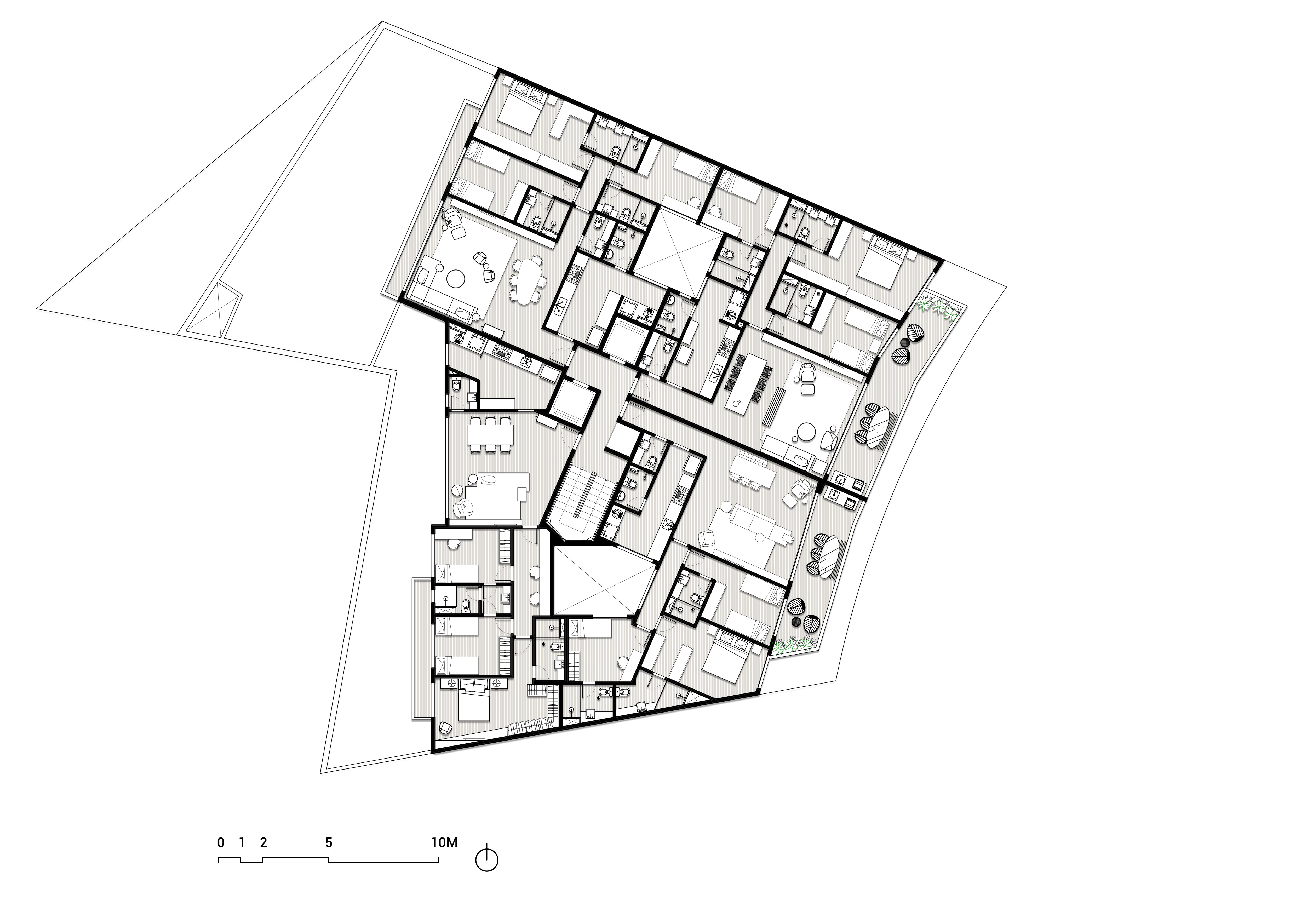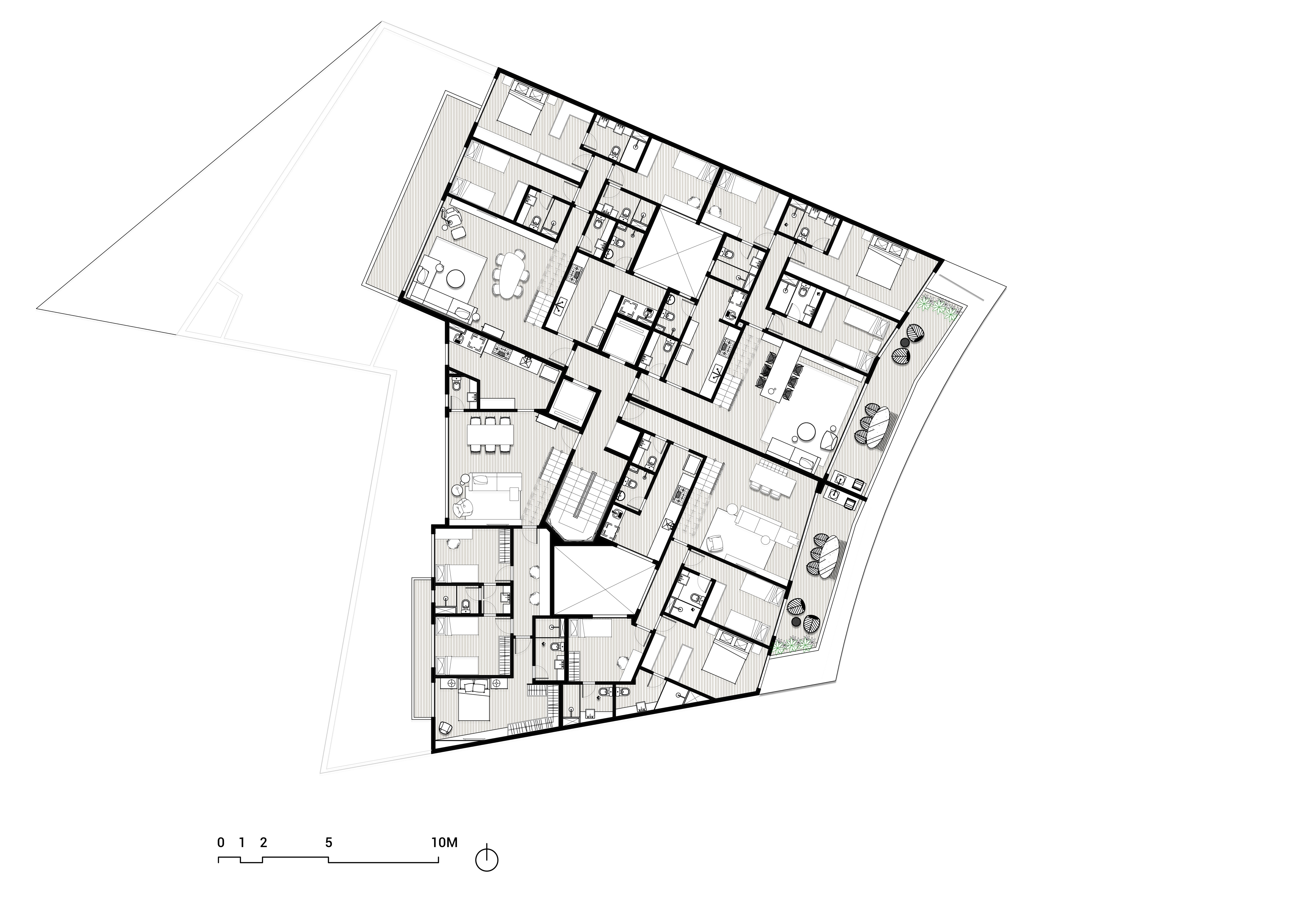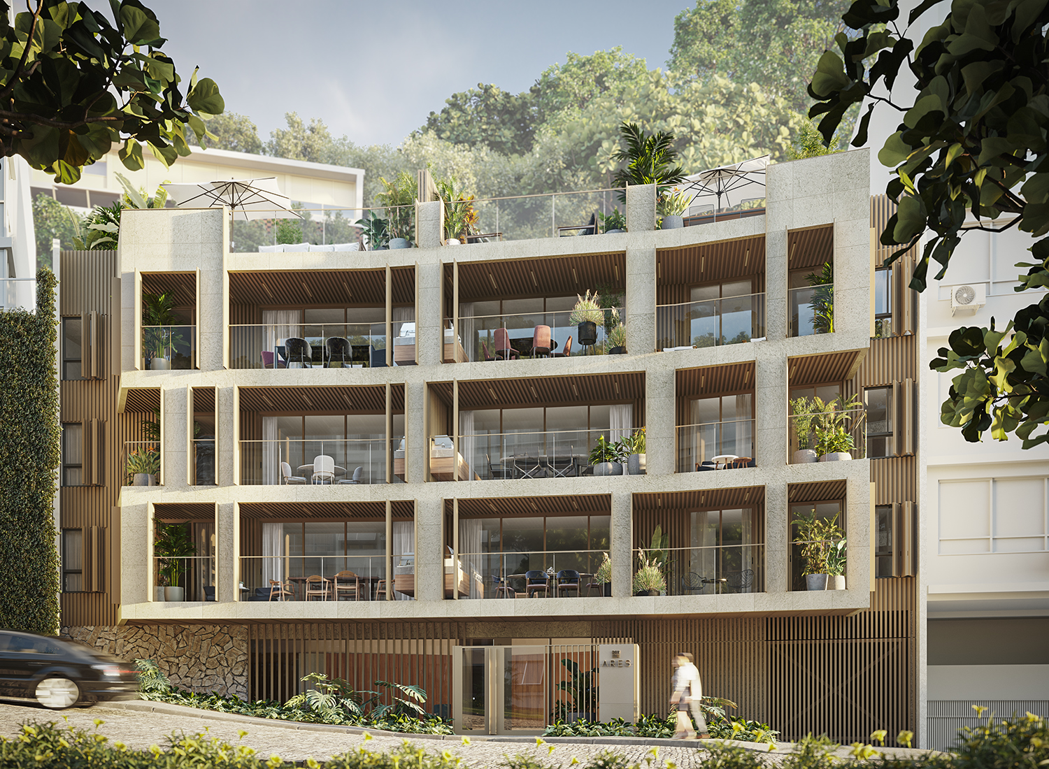 Com esses elementos em mente, as diversas linhas traçadas verticalizam a construção de forma esbelta e alinham as diferentes camadas e materiais usados no projeto ao criar um tecido que abrigue o morar no interior do edifício. O uso de elementos ripados em tom escuro protegem a chegada da rua e aquecem o interior das casas, além de promover a integridade visual do edifício. Ao mesmo tempo, o ritmo dos brises das varandas emoldura a vista por seus espaços vazados e filtra a relação com a rua através de uma camada clara e iluminada.