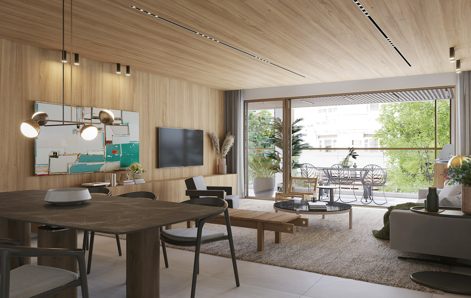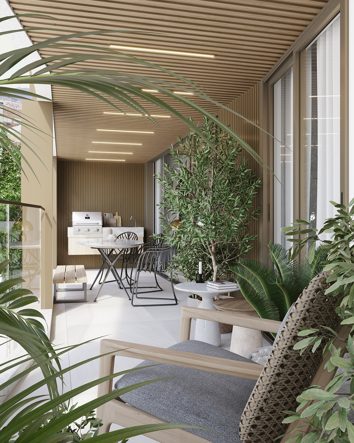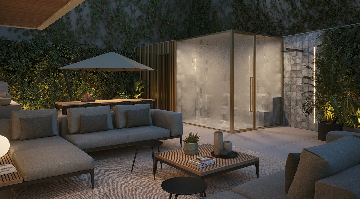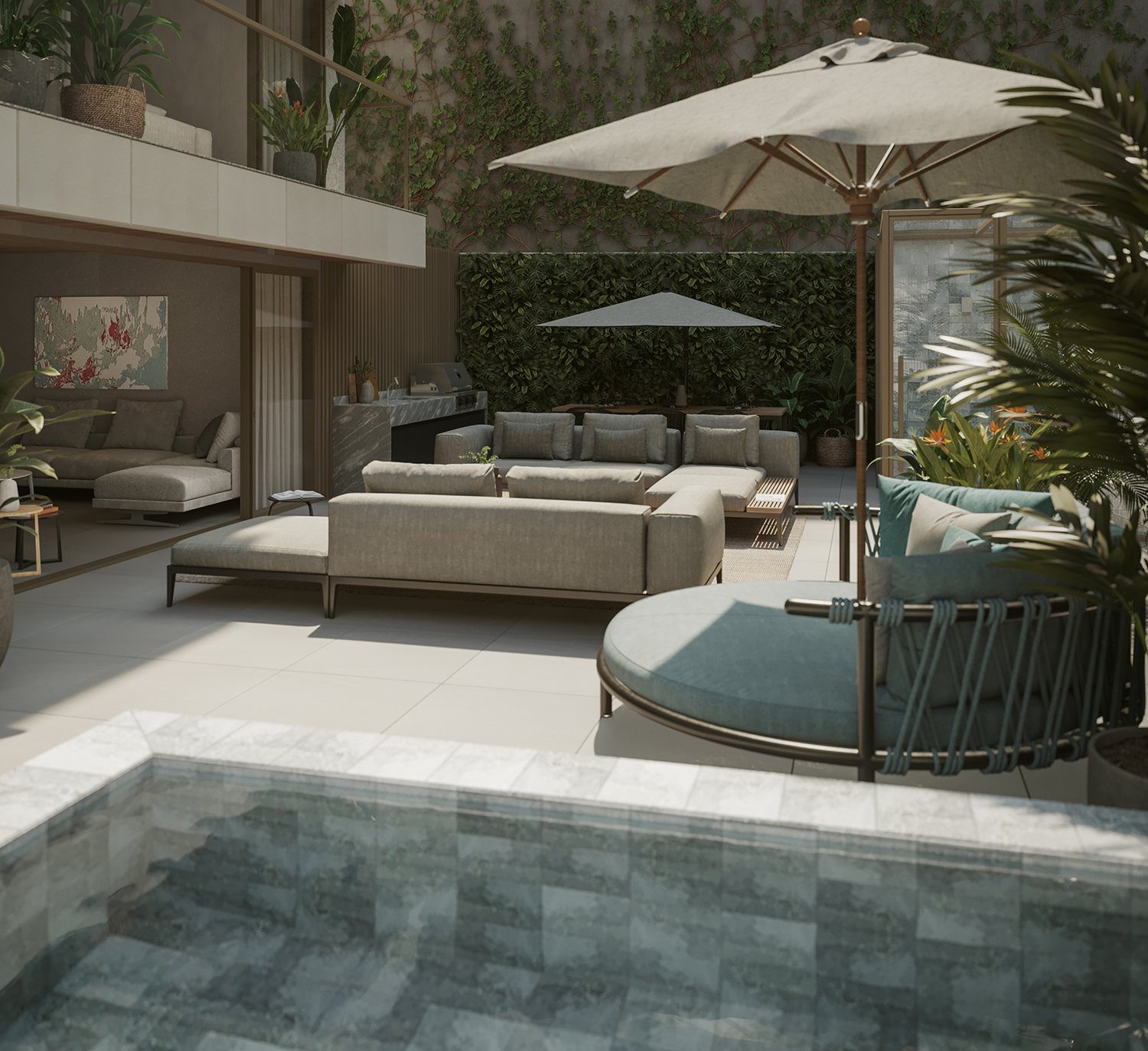 A abertura prolongada dos ambientes internos, sobretudo da sala, para as varandas é um dos grandes diferenciais do projeto. Com a melhor integração entre espaço interno e espaço externo, a moradia parece não apenas mais ampla como mais iluminada. A mesma intenção ocorre ao longo do edifício, com a criação de diversos espaços livres para o encontro e o convívio, como jardins e terraços dentro das unidades. A possibilidade de estreitar nossa relação diária com a luz, o céu, o vento, ou seja, o ar livre em geral, é um dos pontos mais especiais da arquitetura, e está alinhado com a busca pela tranquilidade e abrigo no morar atual.