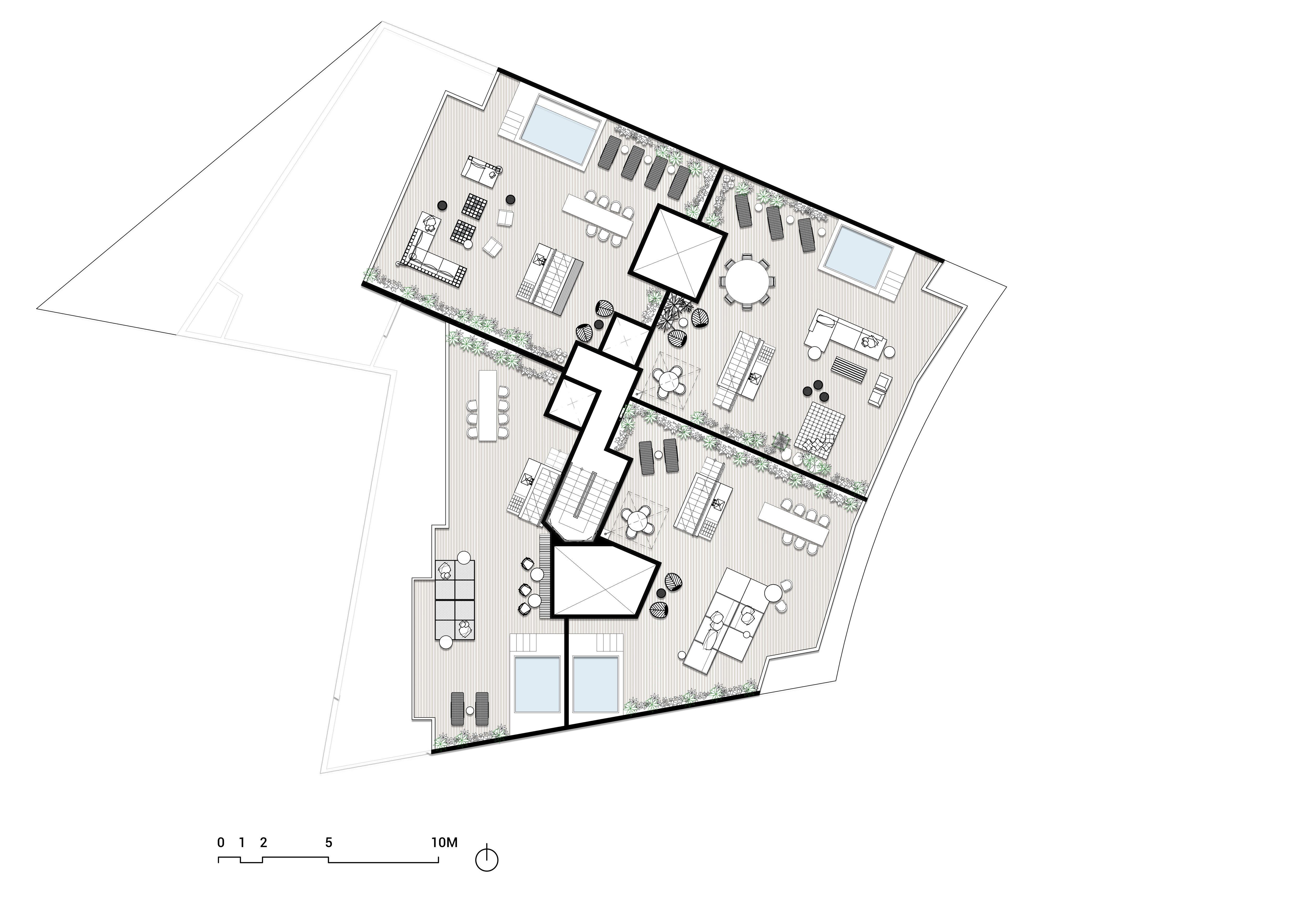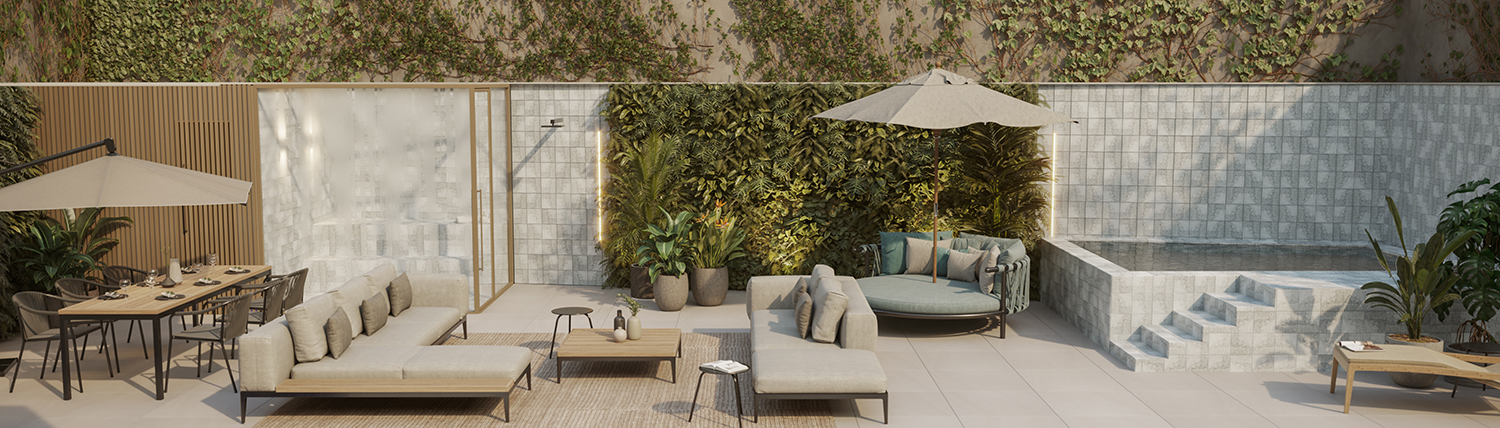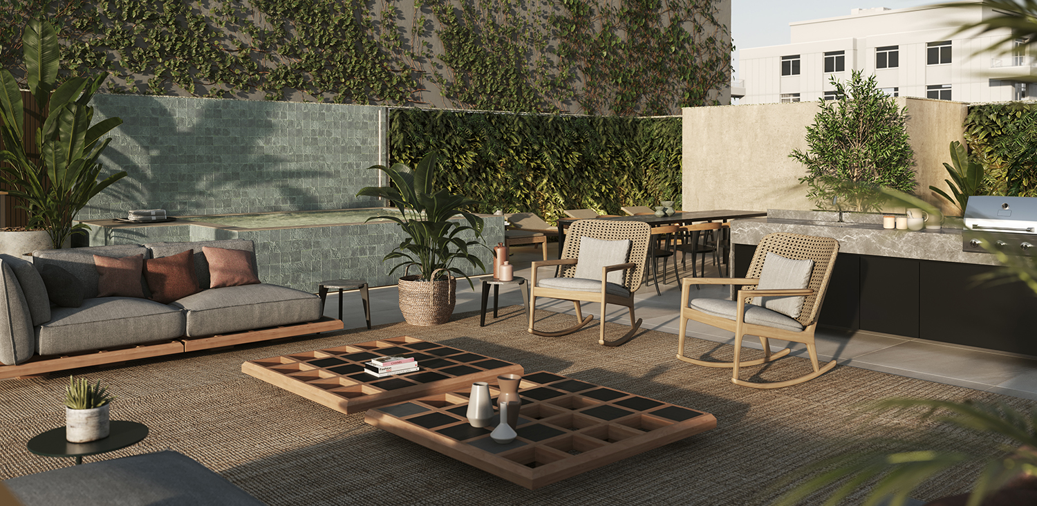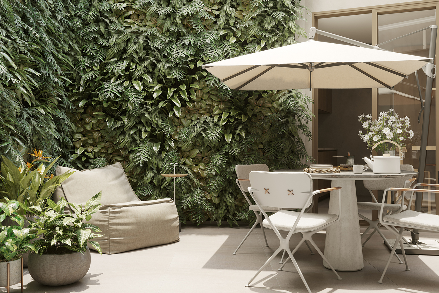 A abertura prolongada dos ambientes internos, sobretudo da sala, para as varandas é um dos grandes diferenciais do projeto. Com a melhor integração entre espaço interno e espaço externo, a moradia parece não apenas mais ampla como mais iluminada. A mesma intenção ocorre ao longo do edifício, com a criação de diversos espaços livres para o encontro e o convívio, como jardins e terraços dentro das unidades. A possibilidade de estreitar nossa relação diária com a luz, o céu, o vento, ou seja, o ar livre em geral, é um dos pontos mais especiais da arquitetura, e está alinhado com a busca pela tranquilidade e abrigo no morar atual.
