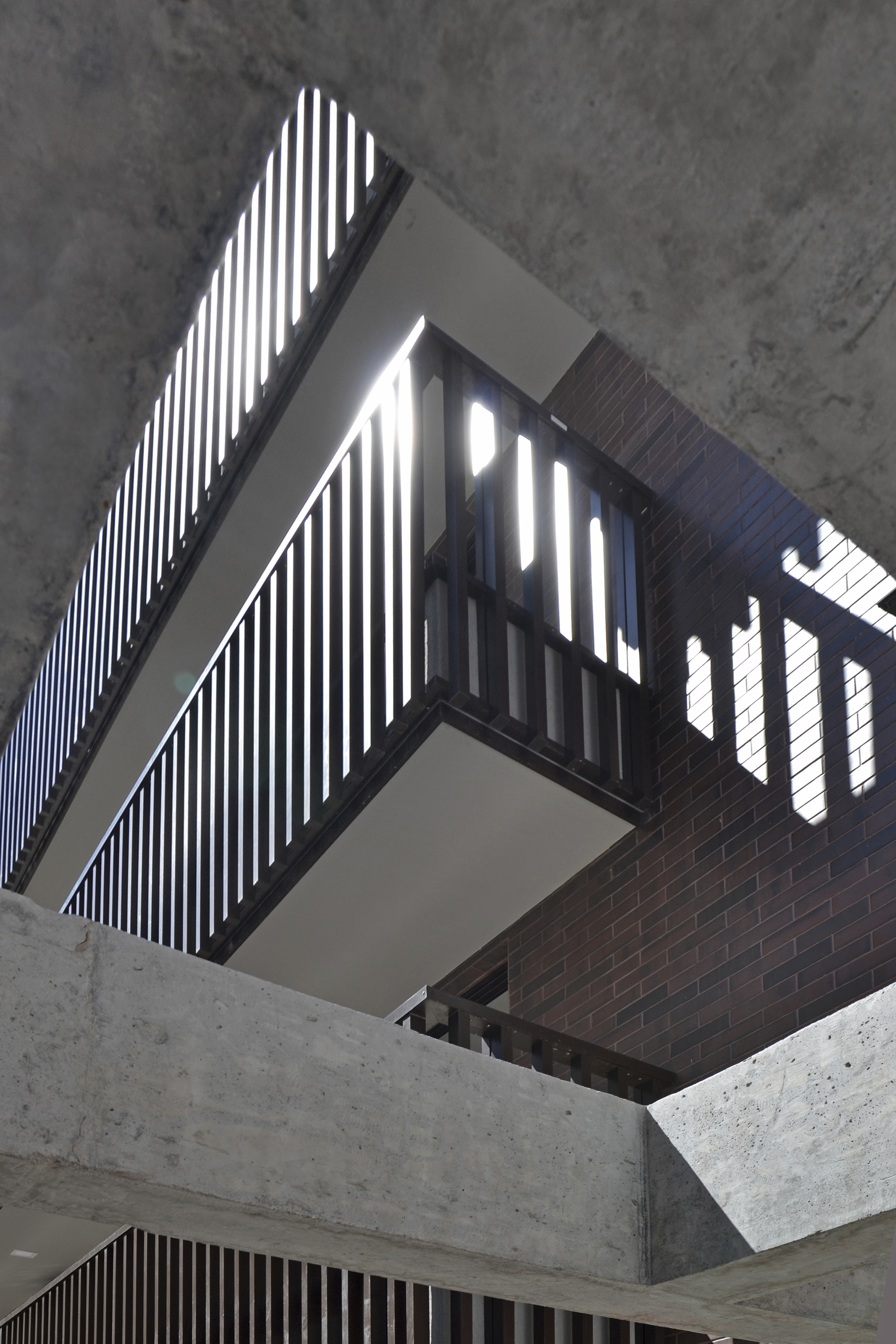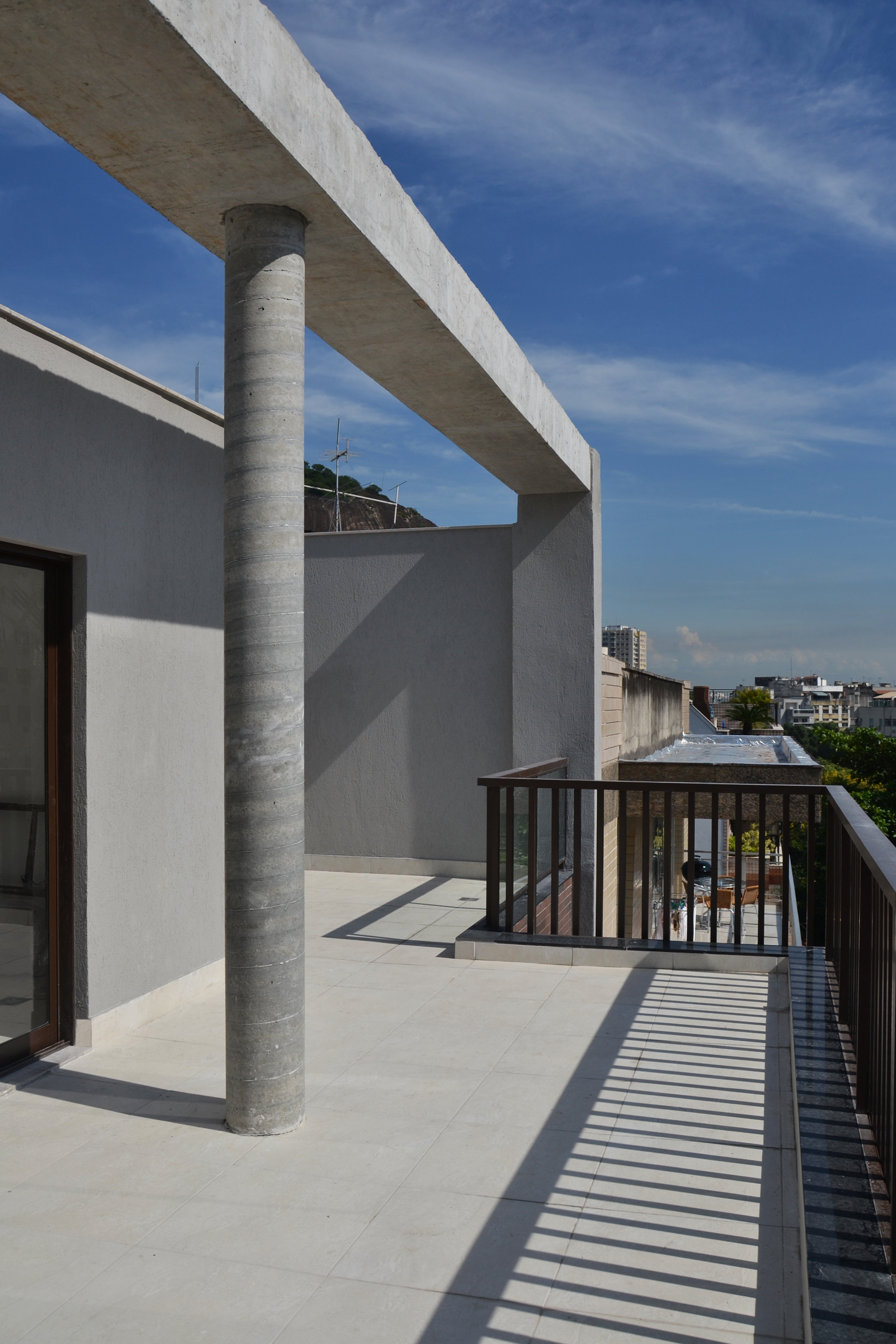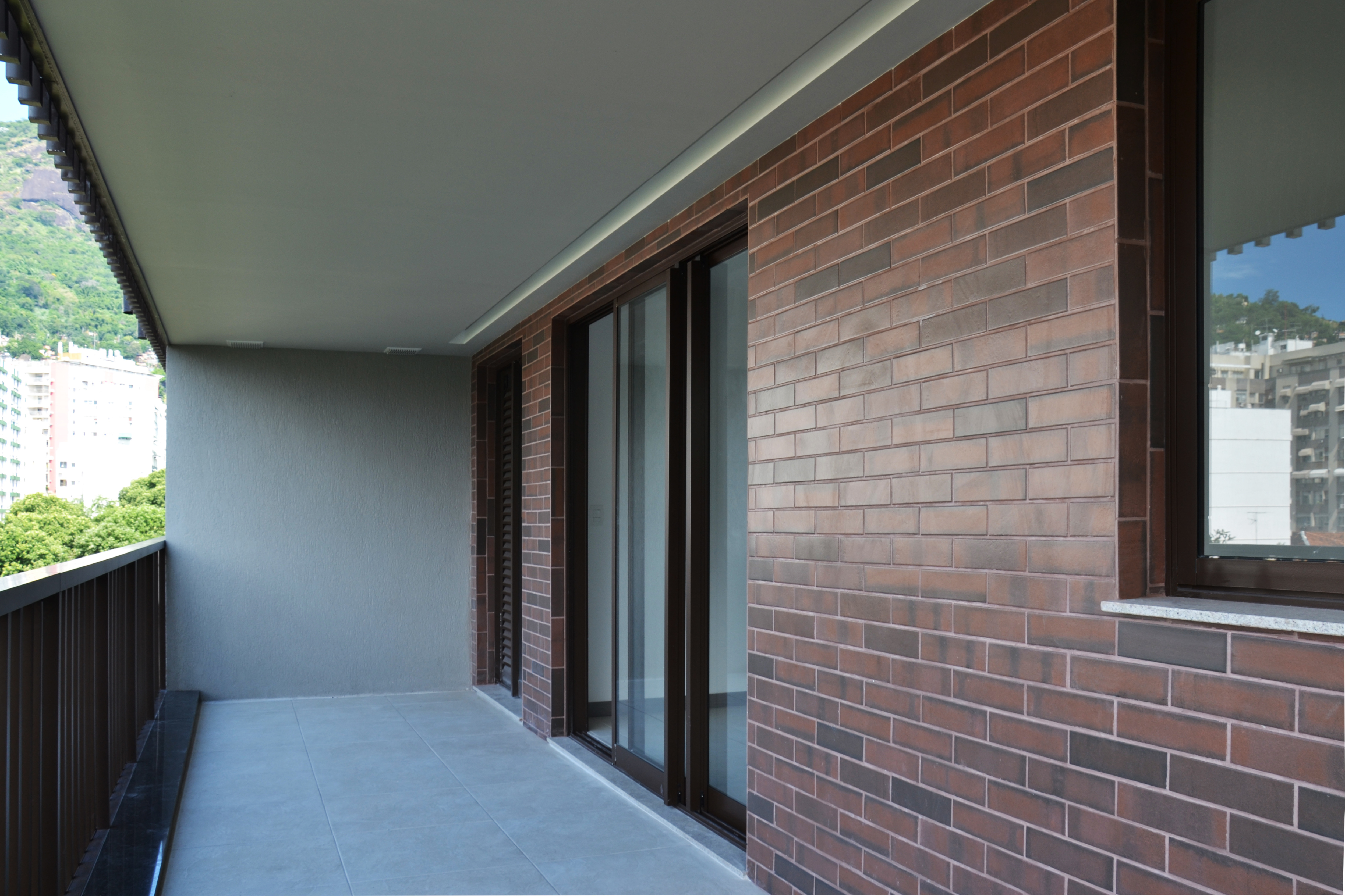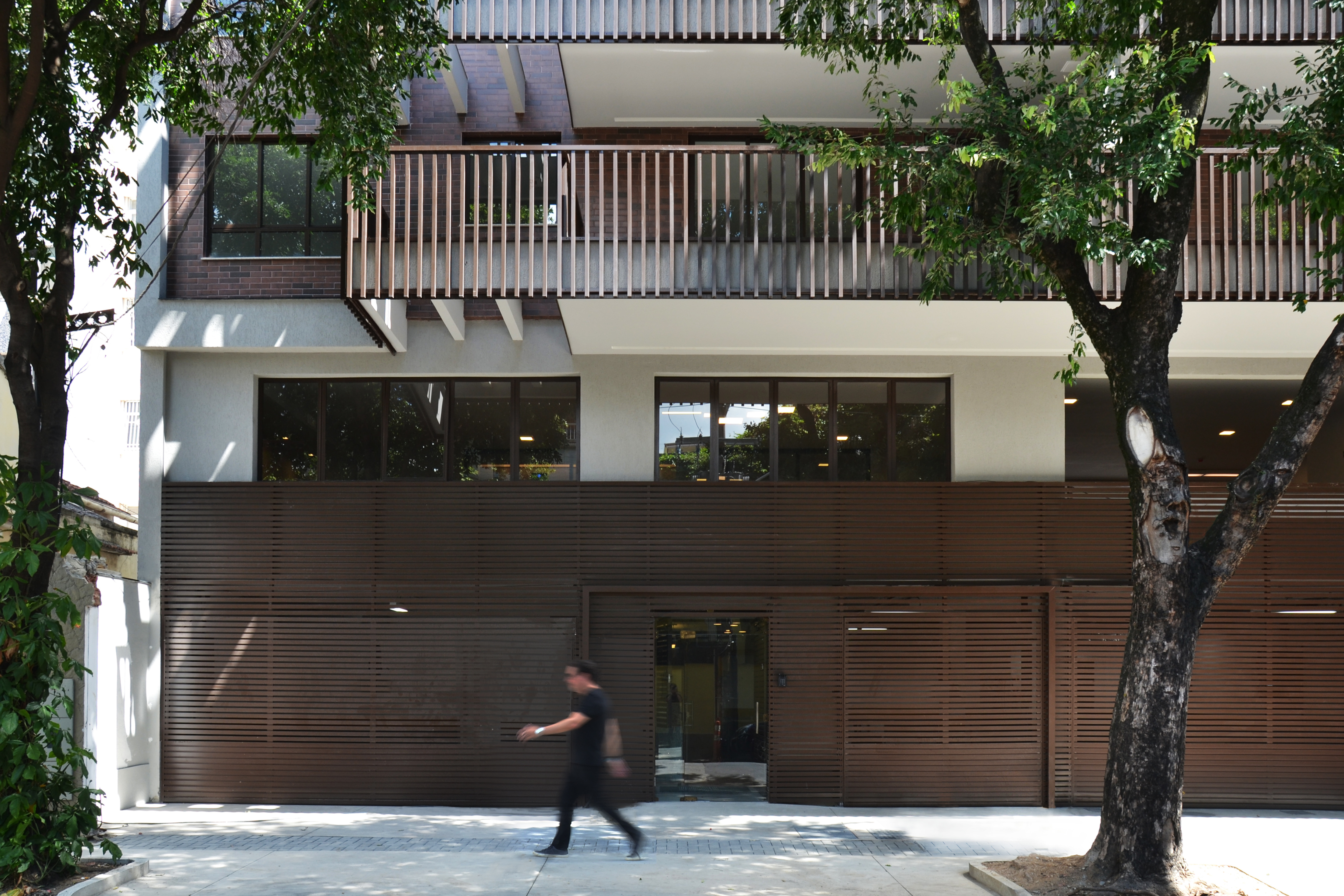 Na fachada, houve um resgate aos elementos modernistas com as litocerâmicas tradicionais e o concreto aparente. Esses materiais estão dispostos de forma a não fragmentar os diversos elementos compositivos da fachada, mas torna-los volumes inteiros. A escala do edifício, com apenas sete pavimentos, também foi um fator decisivo de projeto, pois permite a percepção dos detalhes presentes na fachada.