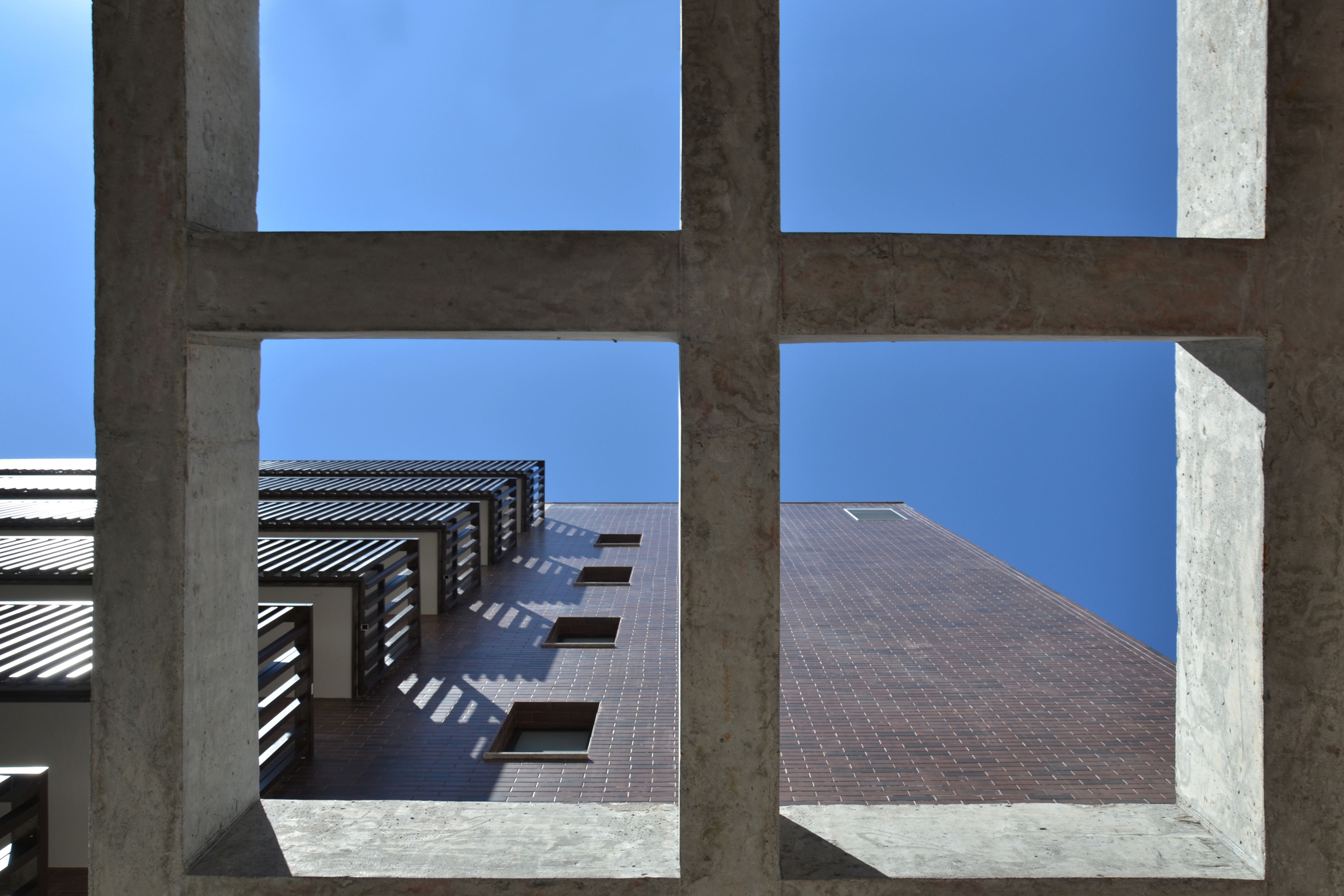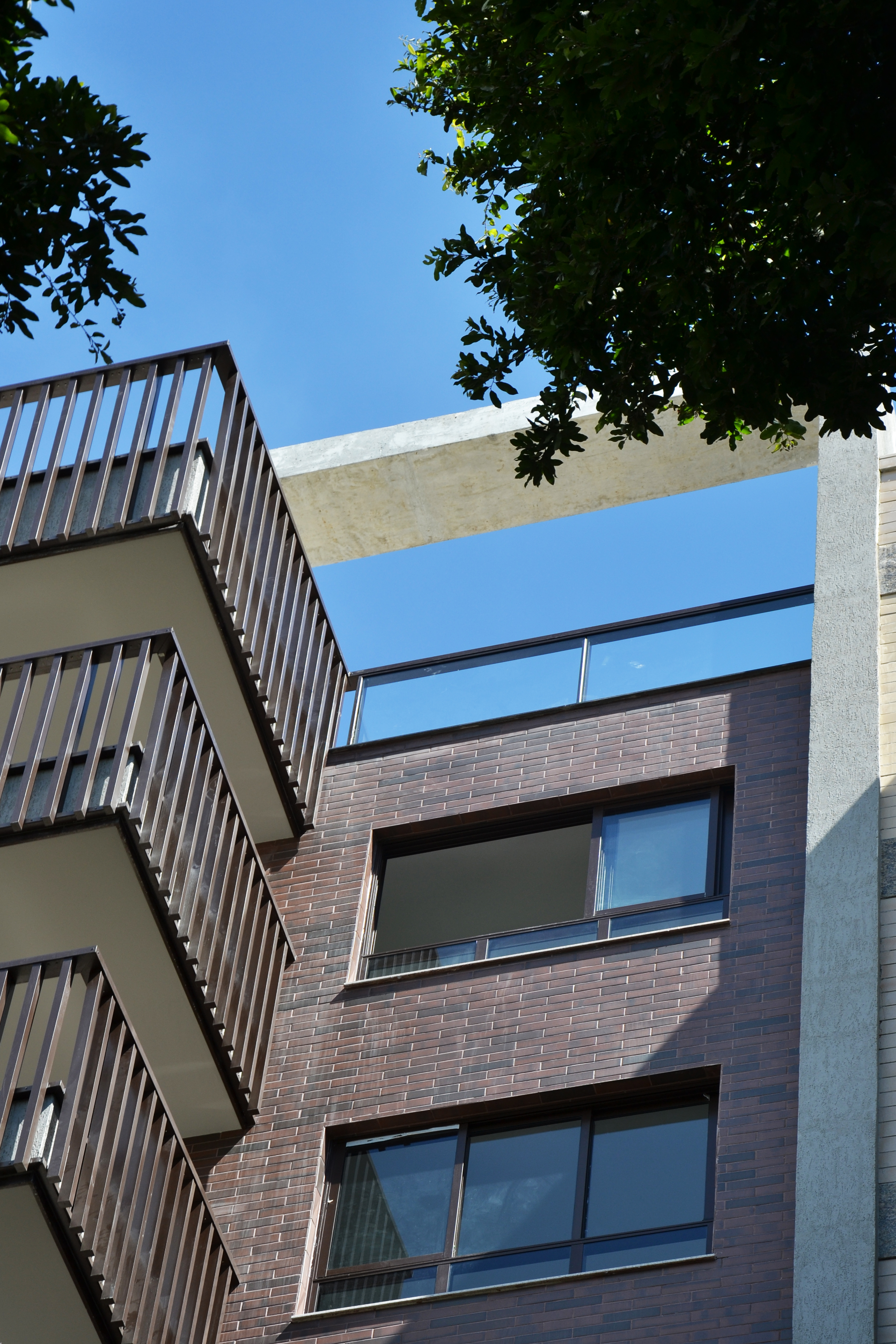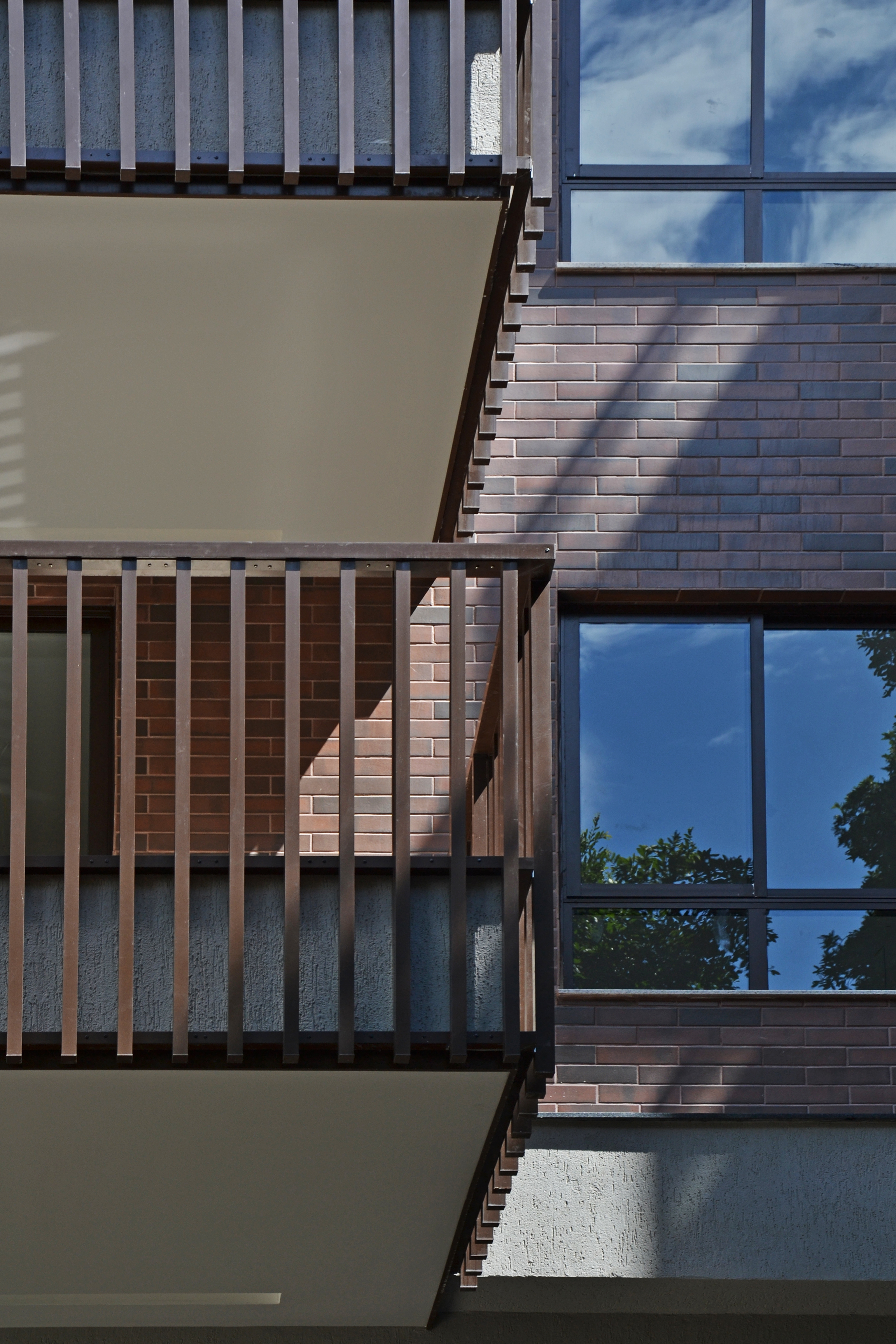 Na fachada, houve um resgate aos elementos modernistas com as litocerâmicas tradicionais e o concreto aparente. Esses materiais estão dispostos de forma a não fragmentar os diversos elementos compositivos da fachada, mas torna-los volumes inteiros. A escala do edifício, com apenas sete pavimentos, também foi um fator decisivo de projeto, pois permite a percepção dos detalhes presentes na fachada.