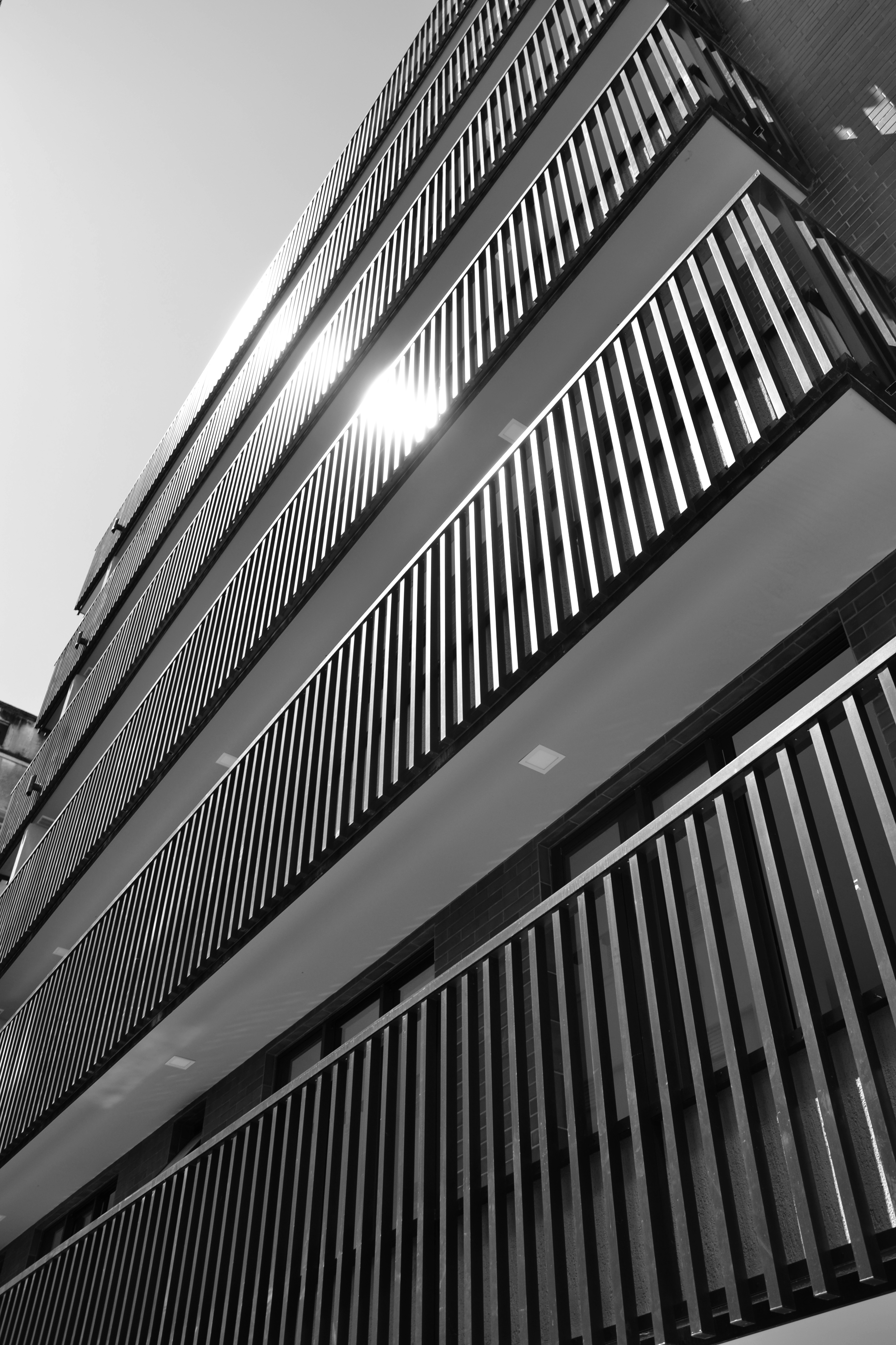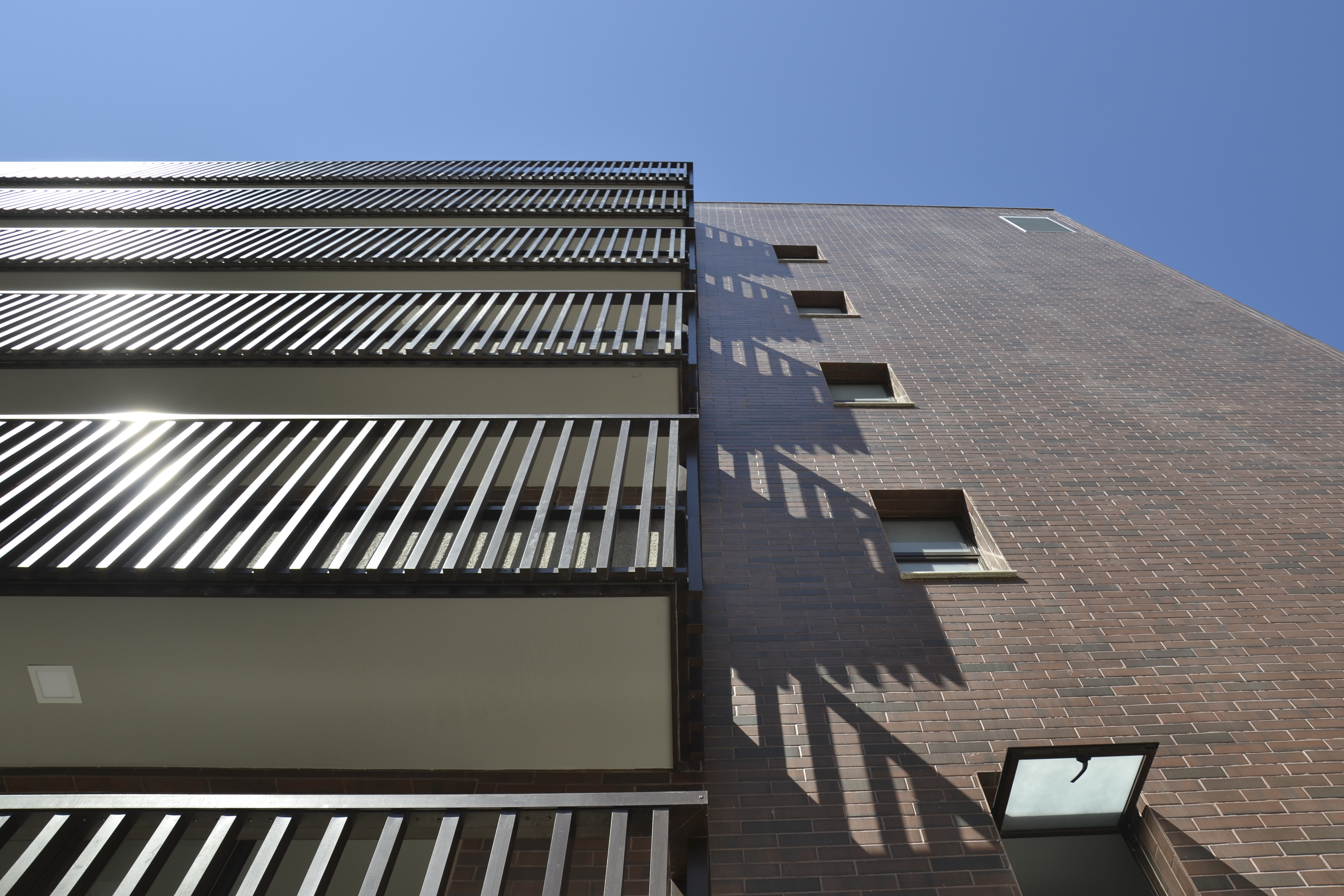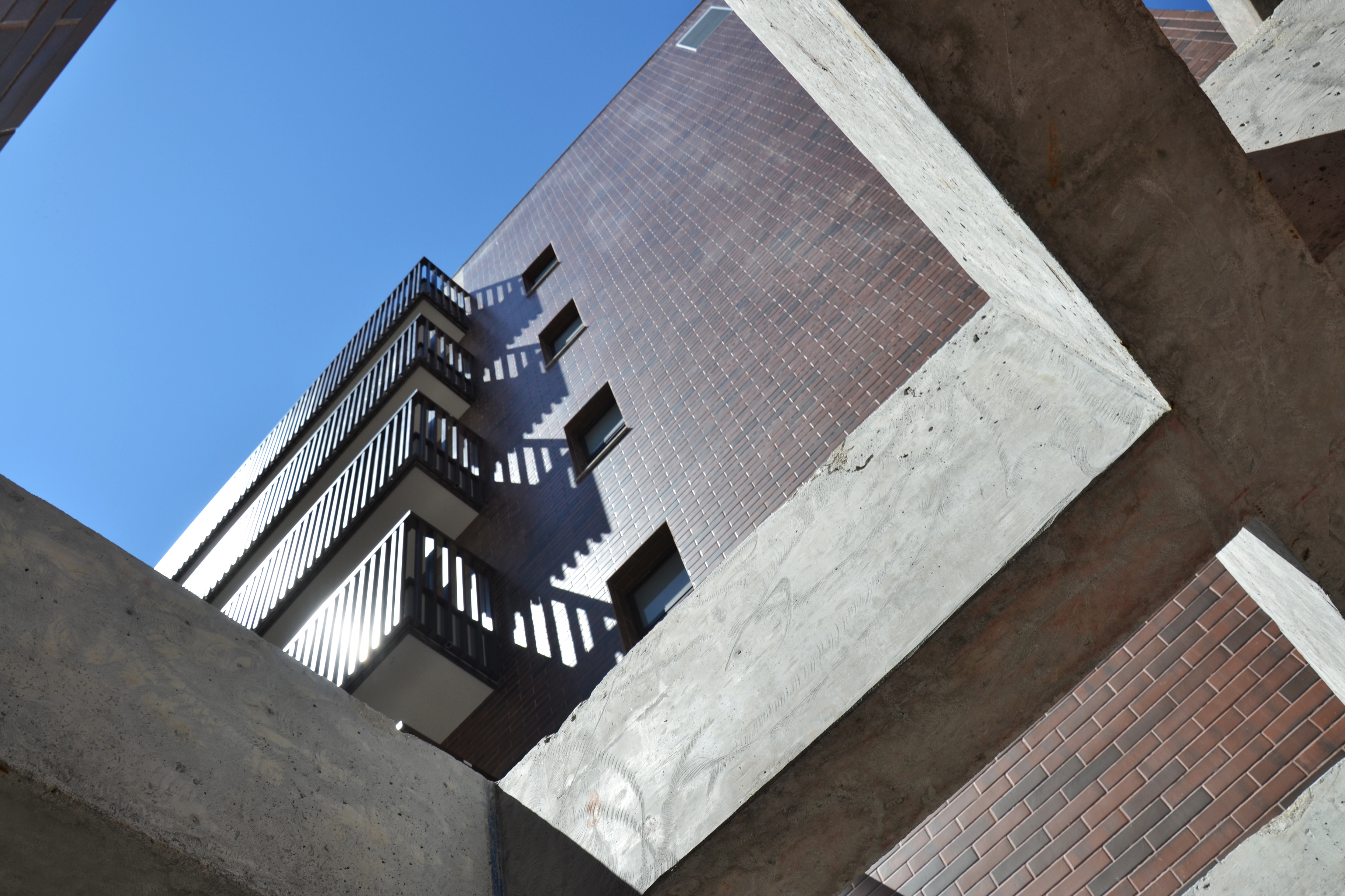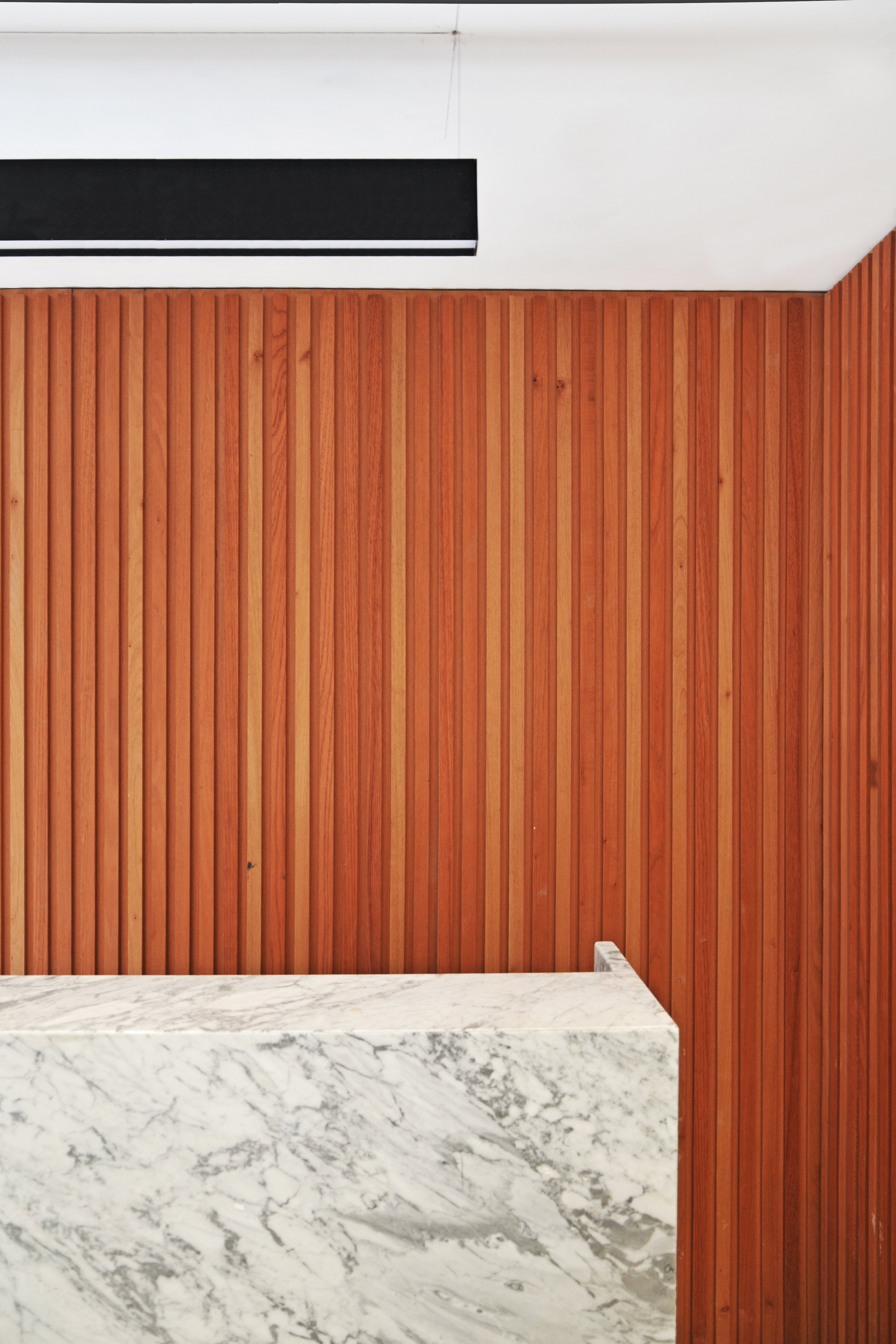 Na fachada, houve um resgate aos elementos modernistas com as litocerâmicas tradicionais e o concreto aparente. Esses materiais estão dispostos de forma a não fragmentar os diversos elementos compositivos da fachada, mas torna-los volumes inteiros. A escala do edifício, com apenas sete pavimentos, também foi um fator decisivo de projeto, pois permite a percepção dos detalhes presentes na fachada.