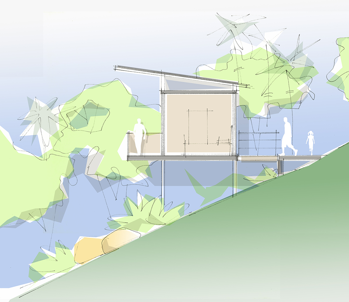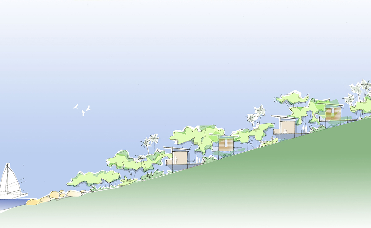 Todas as edificações foram implantadas integrando-se ao relevo e a natureza exuberante da ilha. A principal premissa é a de não interferir diretamente no terreno, respeitando a natureza de todas as formas possíveis, tanto nas edificações quanto nos percursos de conexão entre os vários pavilhões e bangalôs.
