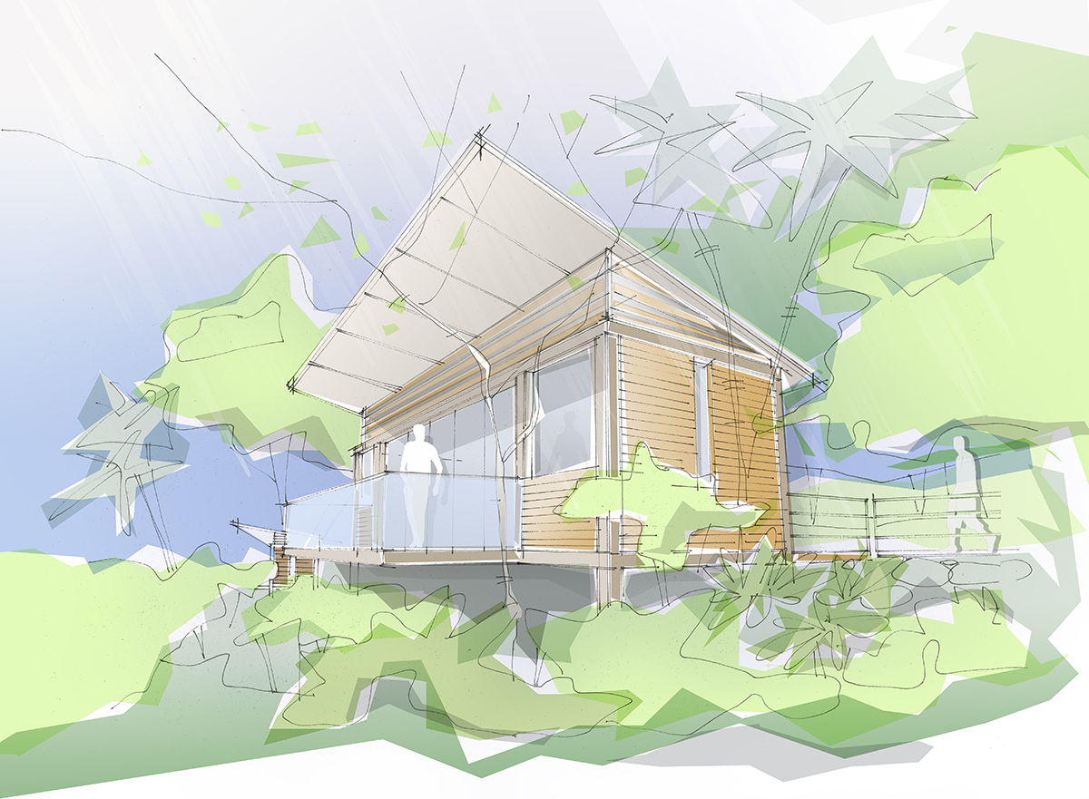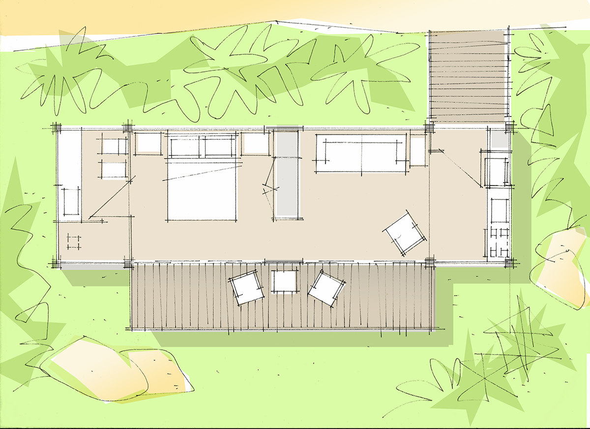 Nos bangalôs optou-se pela estrutura metálica que permite a fácil execução e logística na ilha, assim como um menor impacto em sua montagem. Estes se elevam evitando o contato direto com o solo a fim de preservar a fauna e flora locais. Painéis de vedação em madeira e vidro completam o sistema construtivo, assim como são definidos telhados ventilados para amenizar as temperaturas internas e consumir menos energia. Na planta de cada unidade a abordagem do design do quarto vem do conceito “casa autônoma”, cobrindo as necessidades básicas do hóspede e promovendo o contato com a natureza e o meio ambiente, através de uma ampla varanda voltada para o verde do mar da Costa Sul do estado do Rio de Janeiro.
