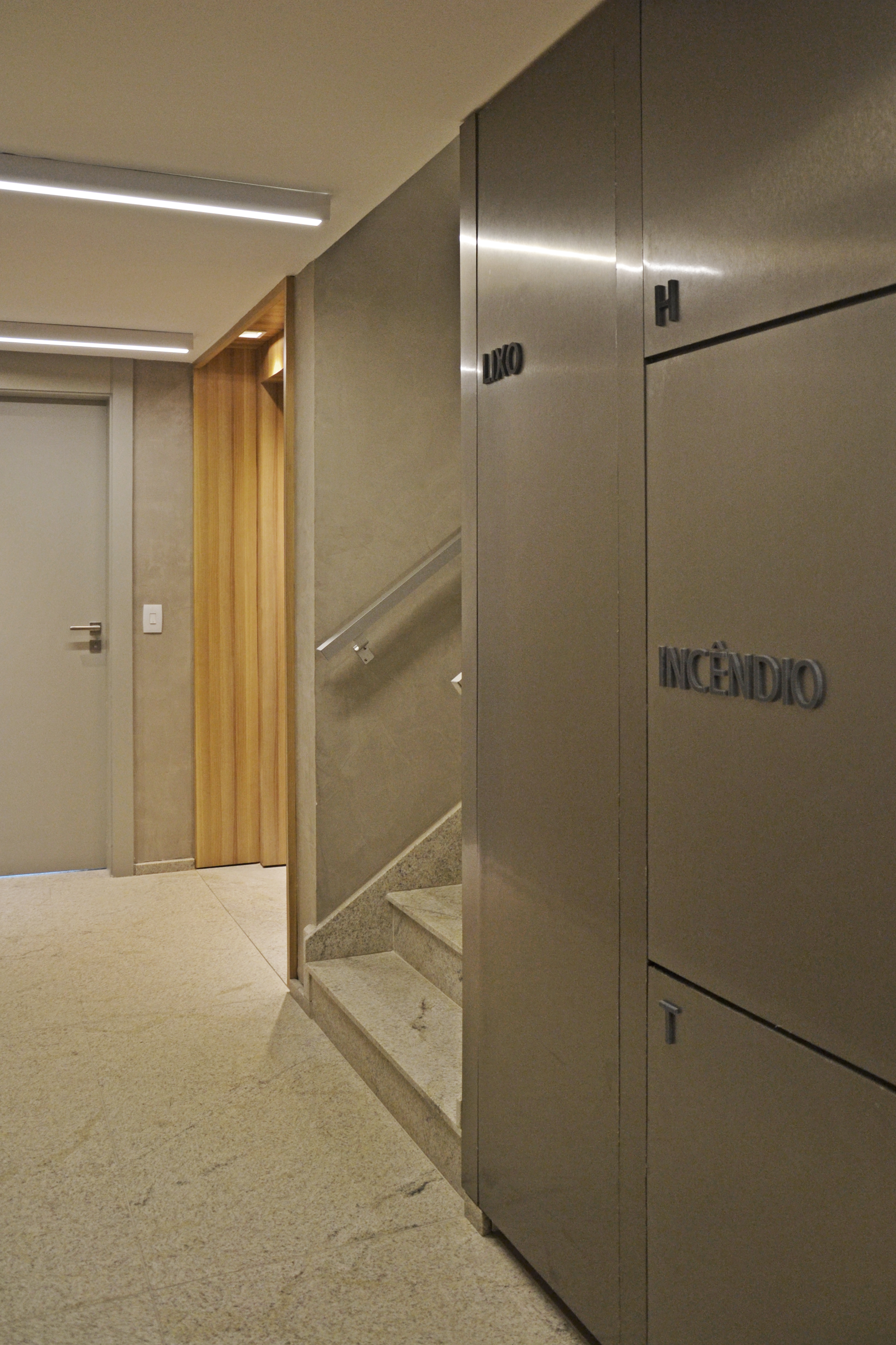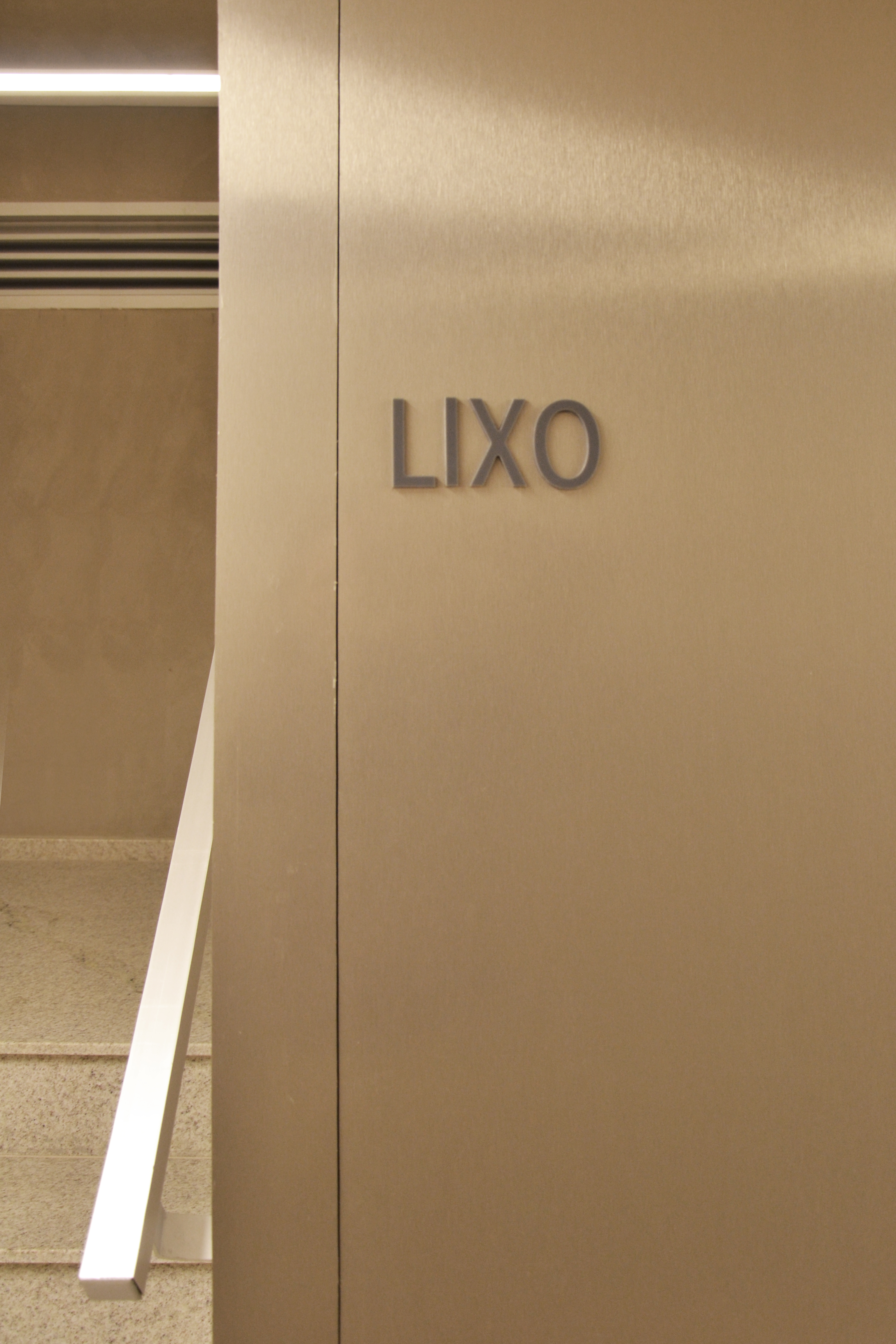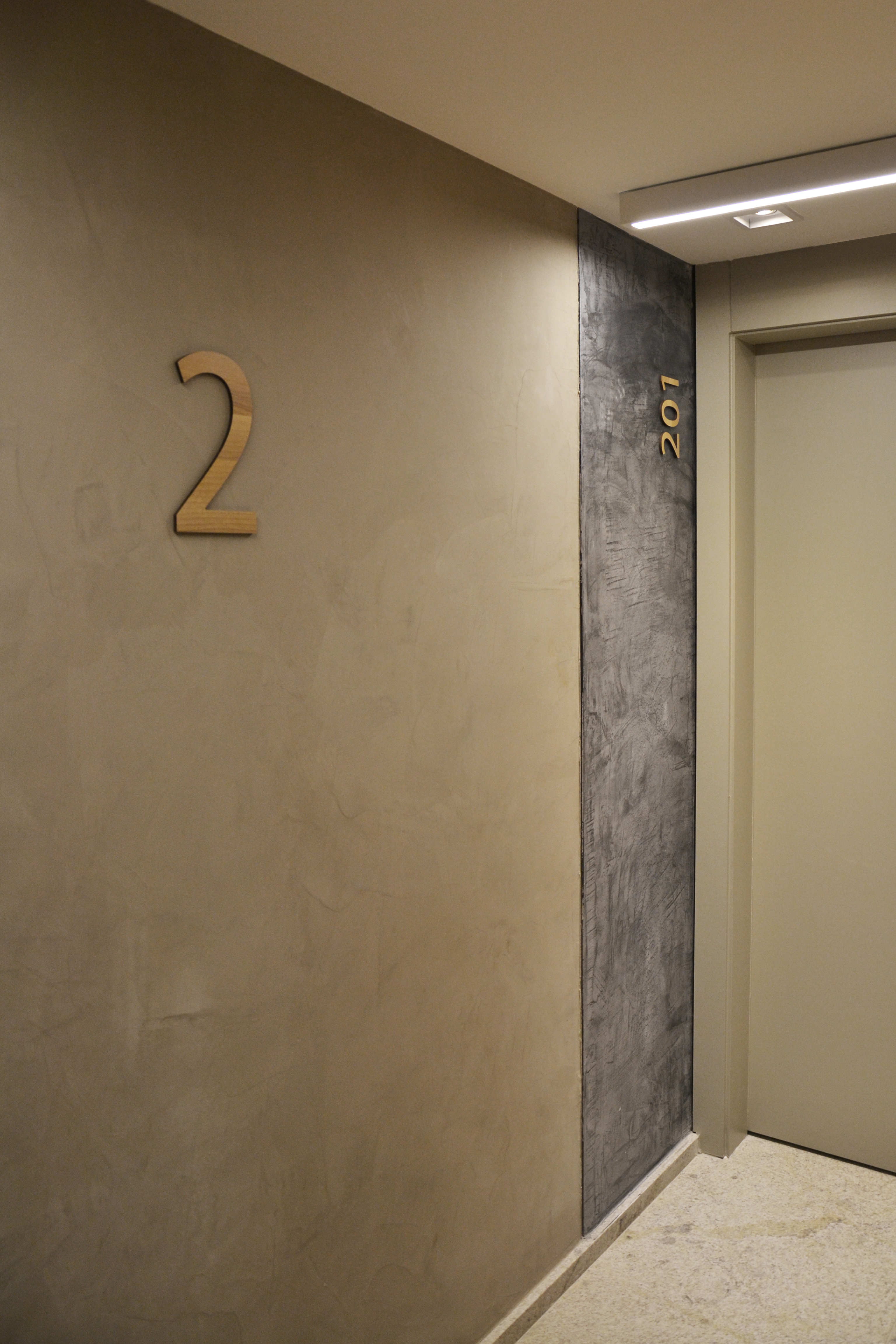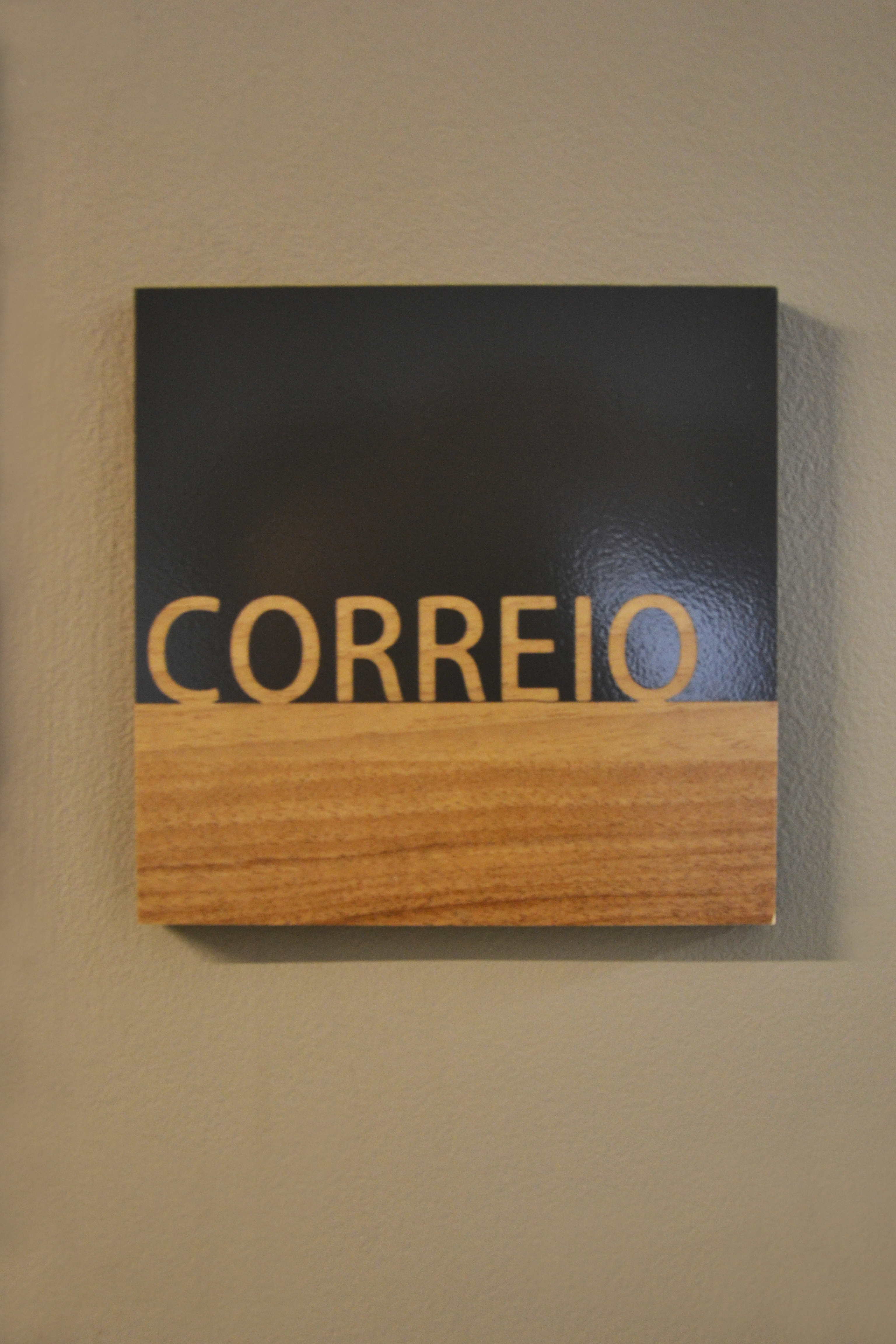 Por isso, optamos por uma sinalização com o mínimo de interferência na arquitetura, utilizando apenas letras destacadas com a mesma madeira das paredes nos corredores dos andares. Para indicar os apartamentos, a mesma textura foi mantida, mas sobre um fundo de cimento escuro, ideal para destacar o número da unidade de maneira sofisticada e simples.