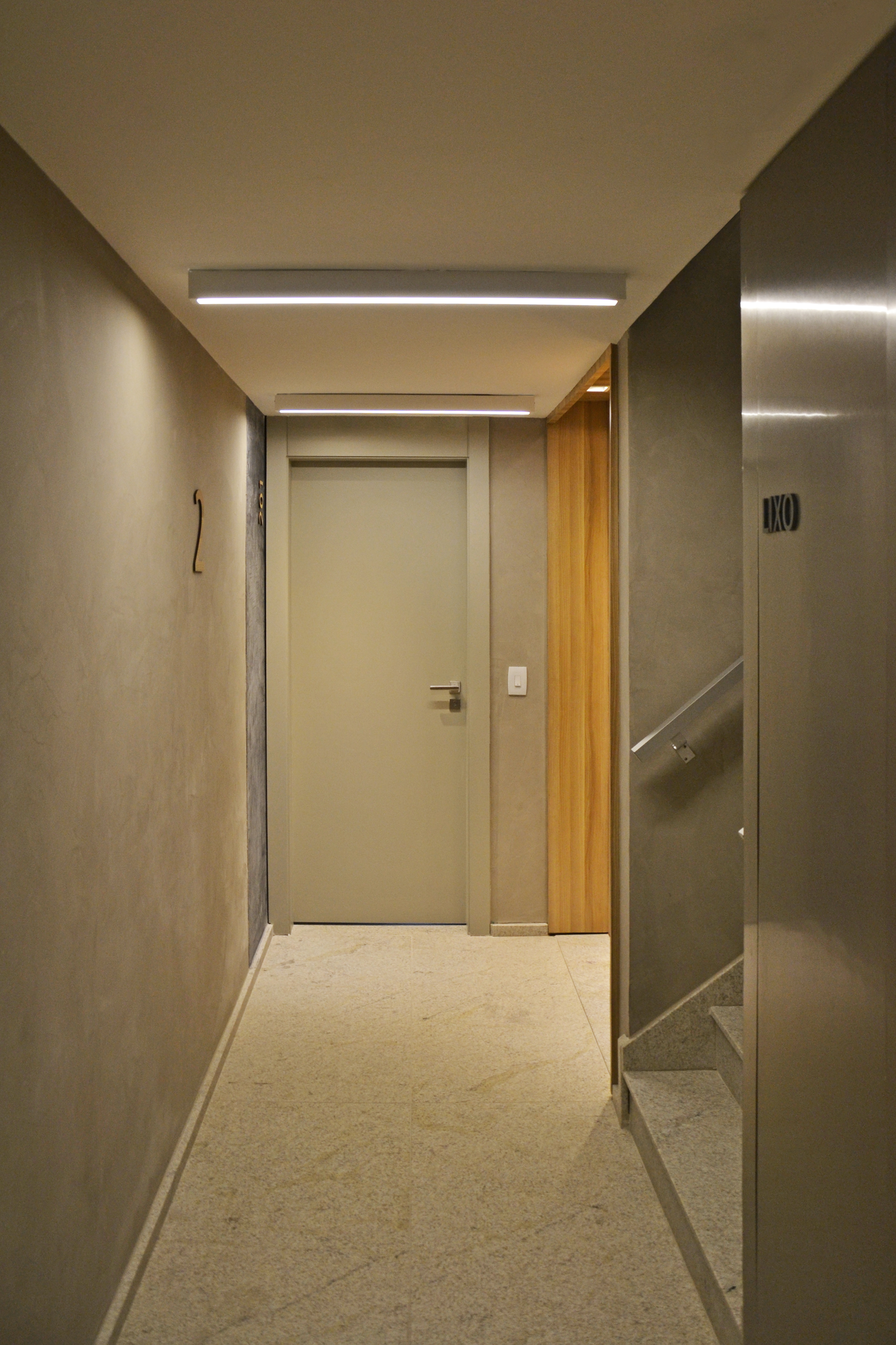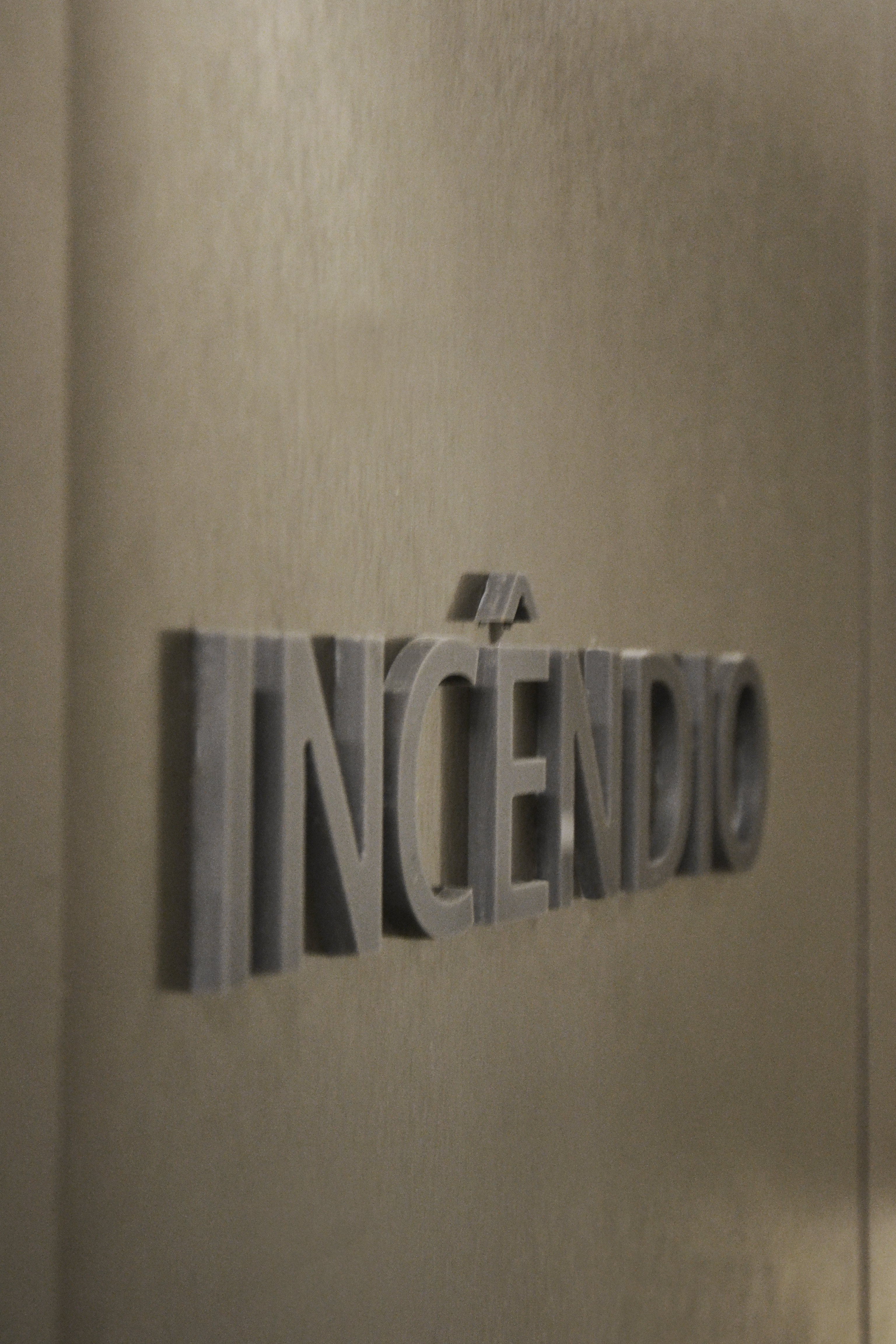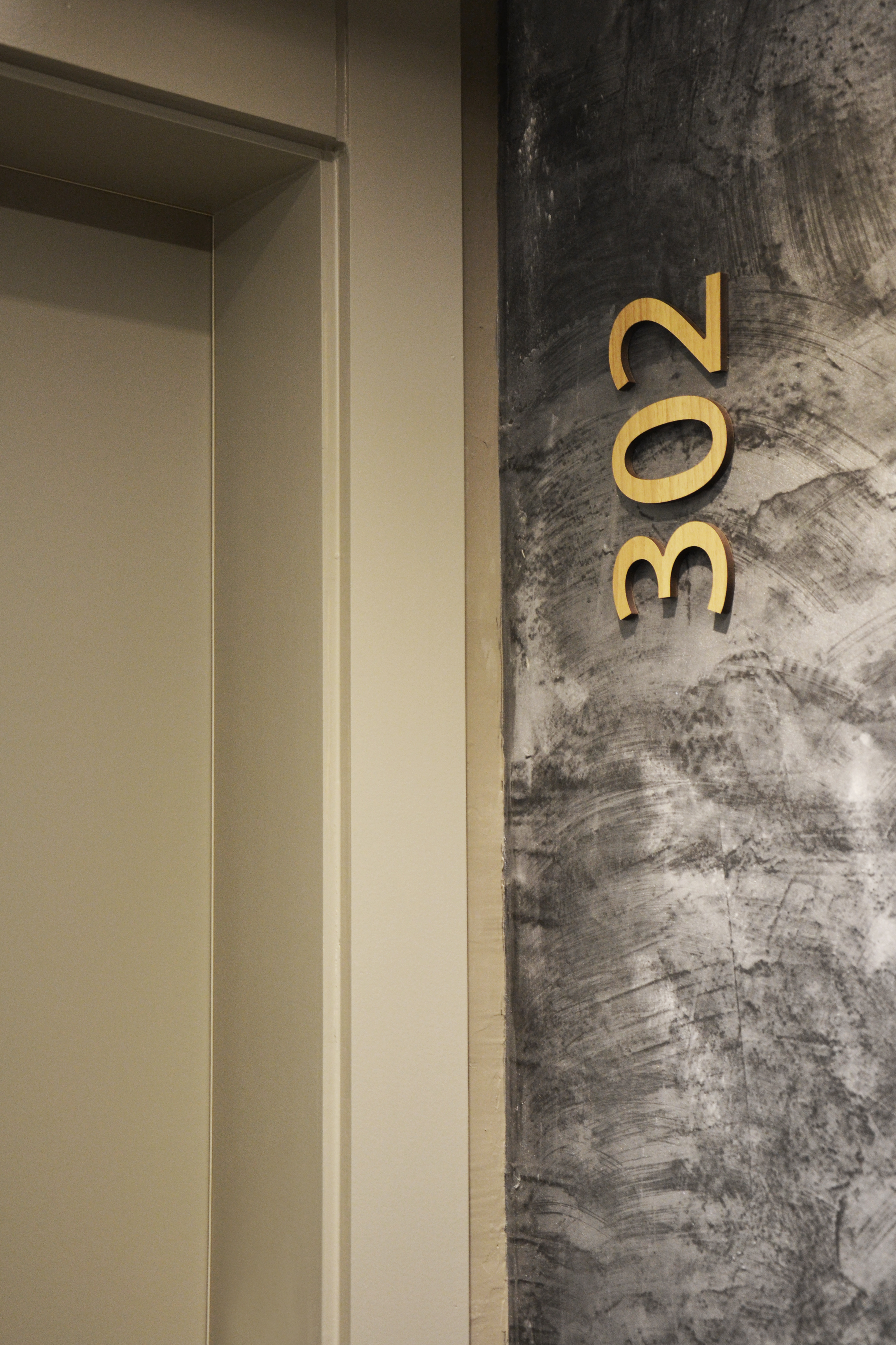 Por isso, optamos por uma sinalização com o mínimo de interferência na arquitetura, utilizando apenas letras destacadas com a mesma madeira das paredes nos corredores dos andares. Para indicar os apartamentos, a mesma textura foi mantida, mas sobre um fundo de cimento escuro, ideal para destacar o número da unidade de maneira sofisticada e simples.