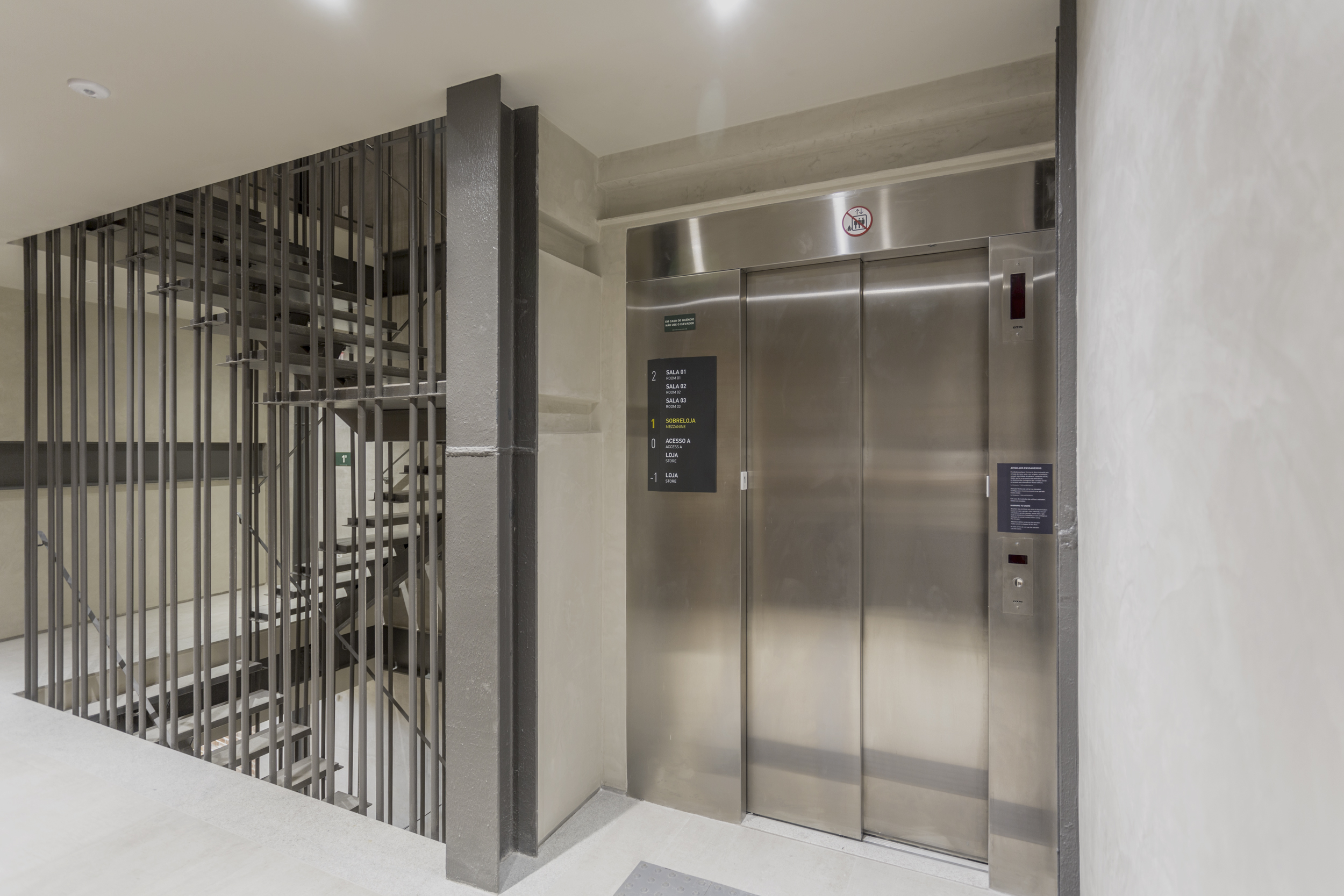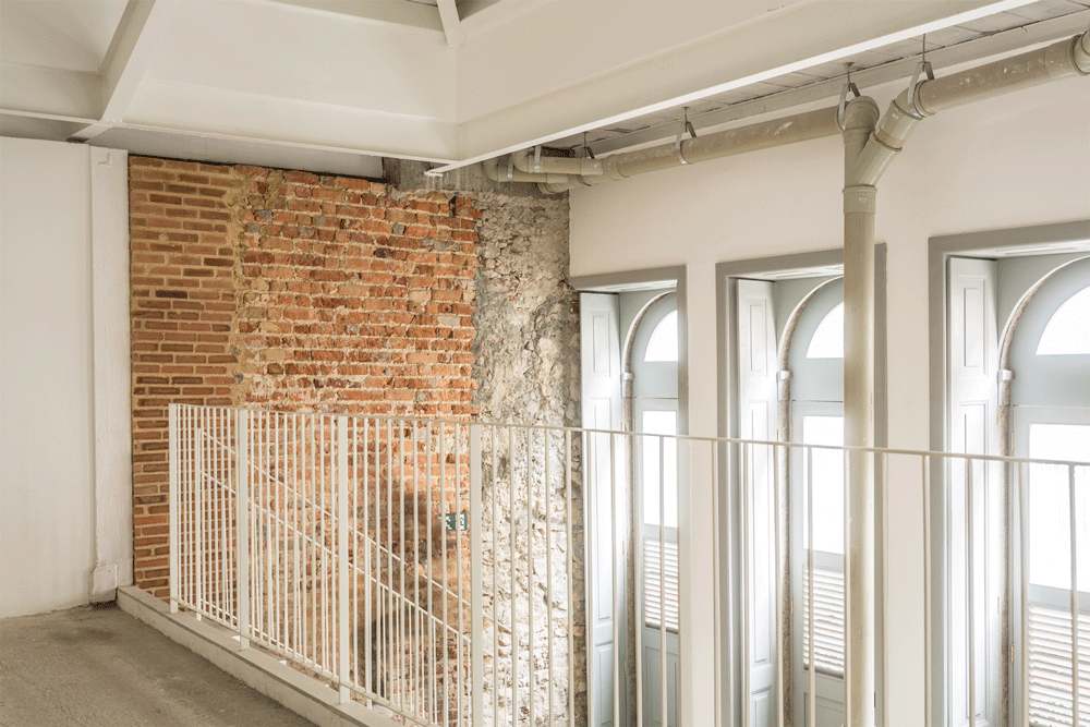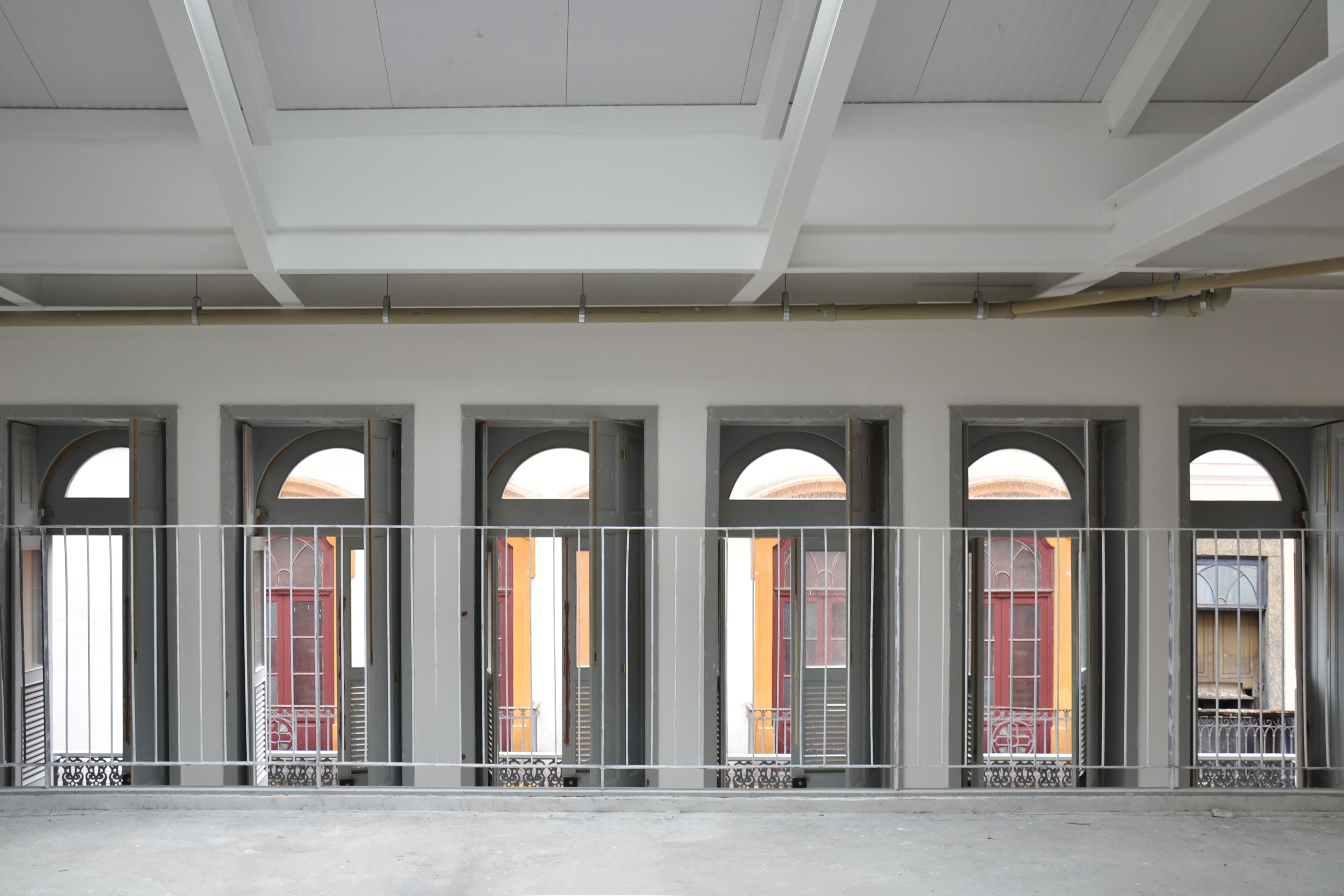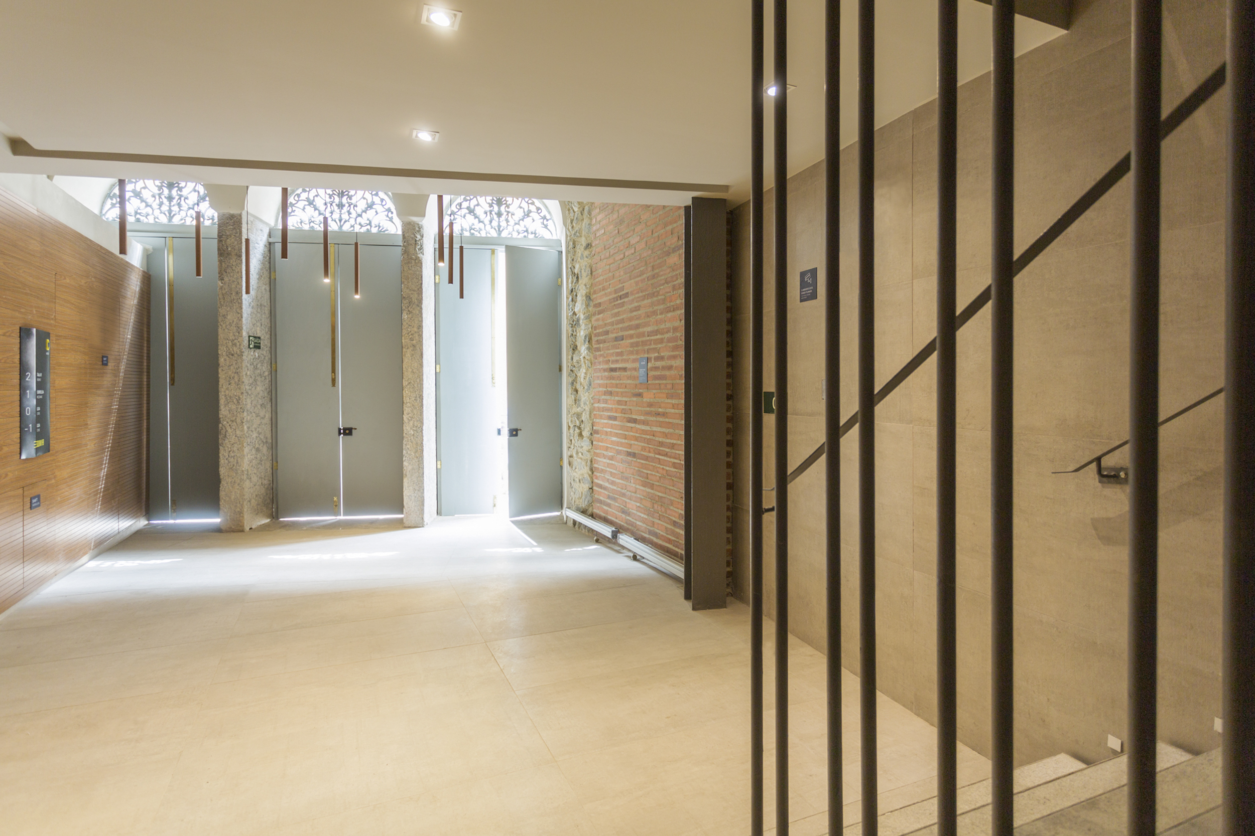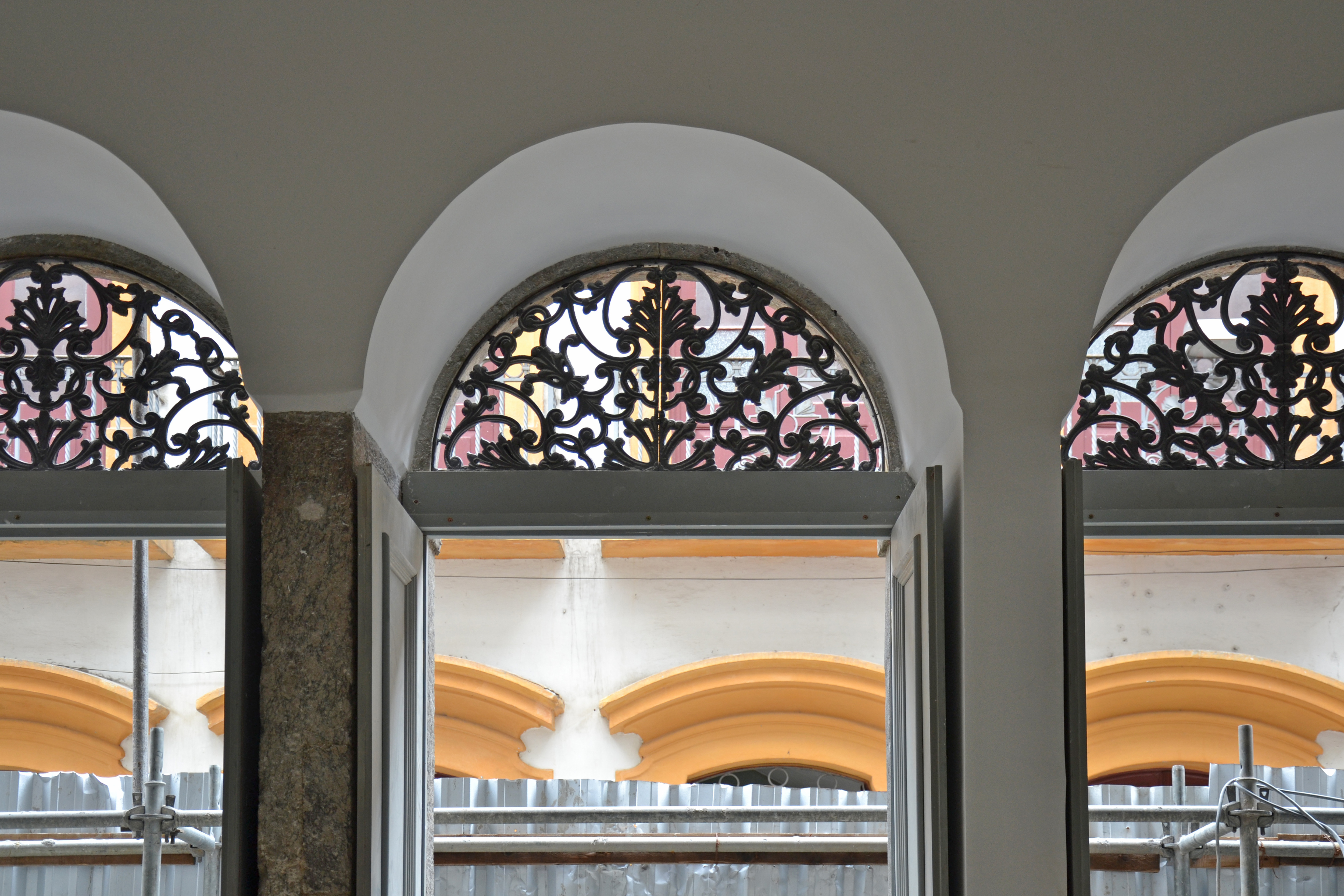 Determinantemente, tem-se a implementação da tecnologia no trato dos elementos arquitetônicos. A estrutura metálica foi pensada como redutor de esforços físicos incidentes nas fachadas históricas. Separando-se a estrutura das fachadas, permitiu sua recuperação e maior liberdade no trato do interior da edificação, implementando-se halls de acesso às circulações verticais e na conformação dos espaços das lojas e salas comerciais. As lojas são constituídas por subsolo, térreo e mezanino. A nova estrutura metálica possibilitou o implemento de um pavimento subsolo e também a perda do caráter estrutural dos baldrames originais. Permitiu-se assim a conservação dos mesmos, destacando o seu valor histórico de duas maneiras: a manutenção in loco dos baldrames, estruturados por pilares metálicos, e o acondicionamento dos mesmos em invólucros no piso, de onde abrem-se janelas para sua. A parte desmontada dos baldrames foi reaproveitada na composição de novas paredes, criando uma textura nova que, no entanto, remete aos materiais do passado. Otimizaram-se os espaços, resultando num total de quatro pavimentos, em contraposição aos dois originais. Para o pavimento superior, composto pelas sete salas comerciais, foi proposto o rebaixo da laje do pavimento próxima às fachadas, de modo a se permitir o acesso das fenestras e sacadas históricas, garantindo o seu uso diante da reconversão da edificação. A concepção de uma claraboia além de remeter estilo da época dos sobrados interage com o mezanino e vãos de fachada favorecendo à circulação da luz natural.