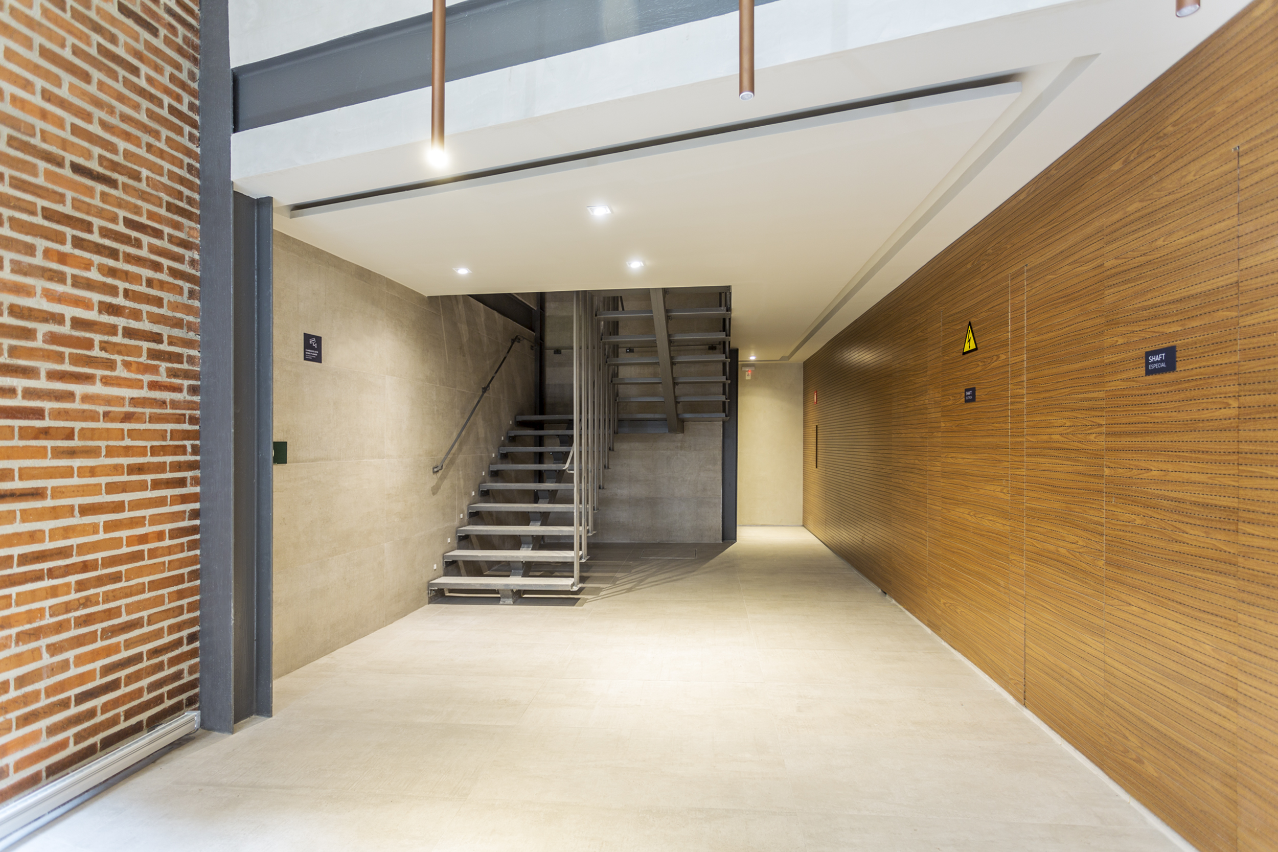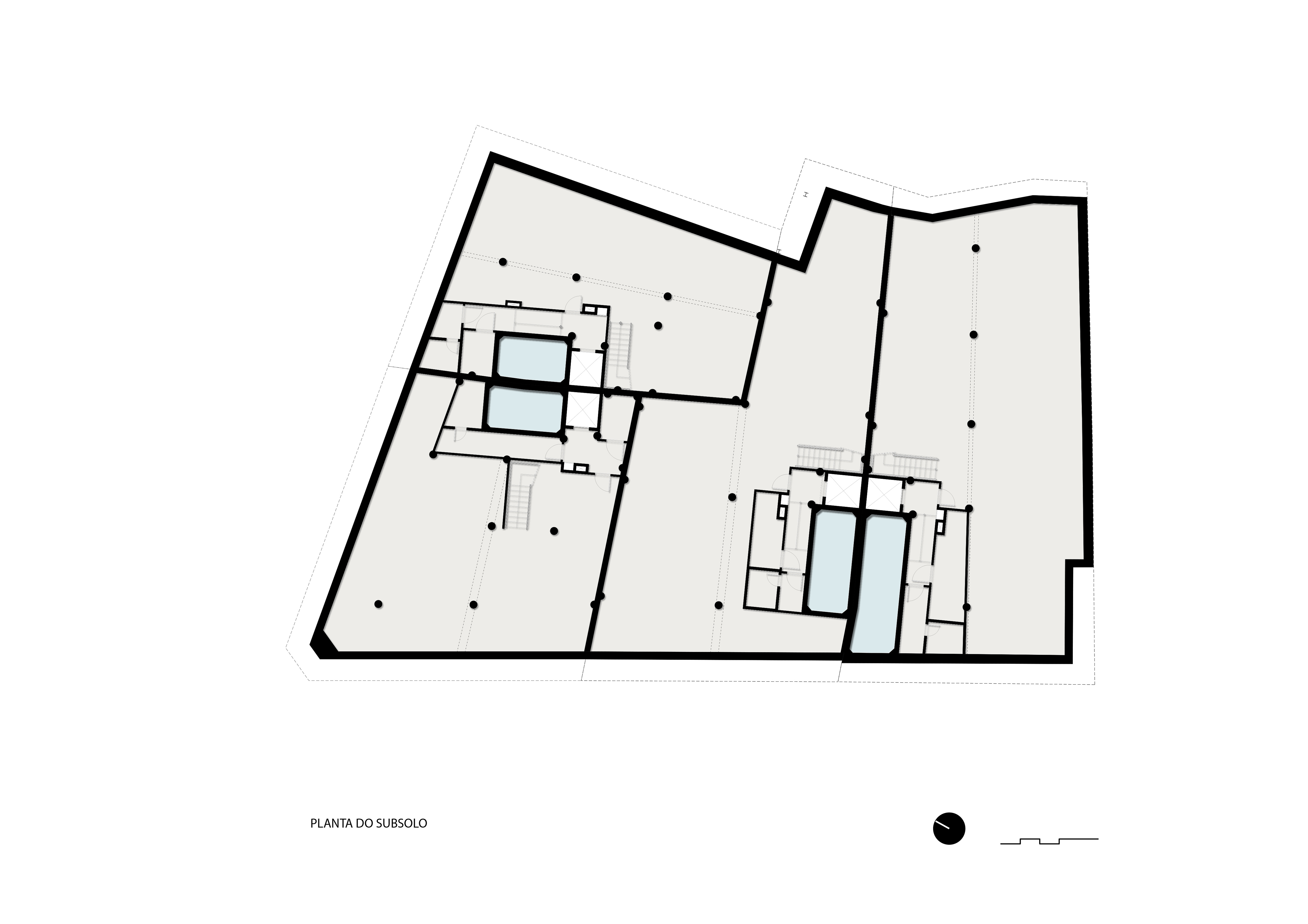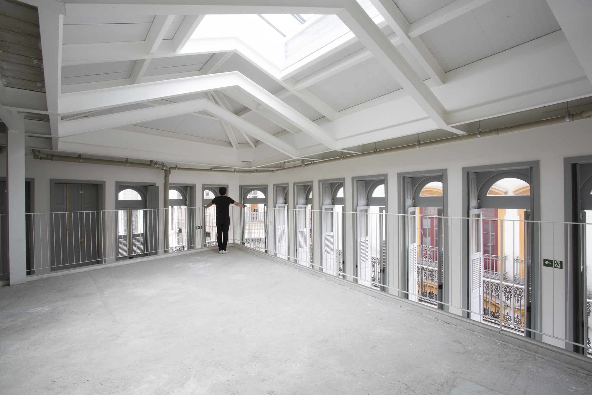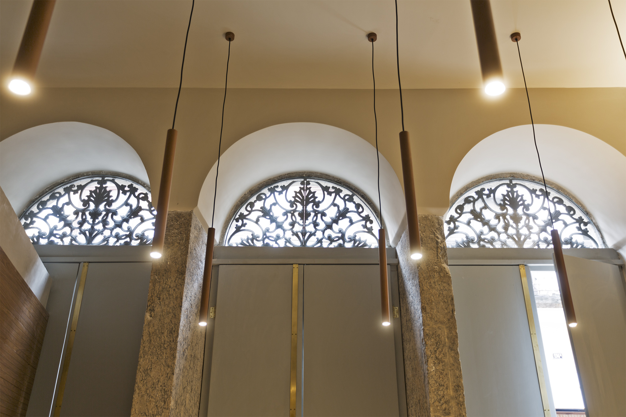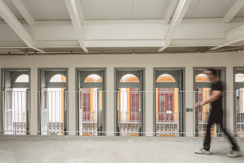 Determinantemente, tem-se a implementação da tecnologia no trato dos elementos arquitetônicos. A estrutura metálica foi pensada como redutor de esforços físicos incidentes nas fachadas históricas. Separando-se a estrutura das fachadas, permitiu sua recuperação e maior liberdade no trato do interior da edificação, implementando-se halls de acesso às circulações verticais e na conformação dos espaços das lojas e salas comerciais. As lojas são constituídas por subsolo, térreo e mezanino. A nova estrutura metálica possibilitou o implemento de um pavimento subsolo e também a perda do caráter estrutural dos baldrames originais. Permitiu-se assim a conservação dos mesmos, destacando o seu valor histórico de duas maneiras: a manutenção in loco dos baldrames, estruturados por pilares metálicos, e o acondicionamento dos mesmos em invólucros no piso, de onde abrem-se janelas para sua. A parte desmontada dos baldrames foi reaproveitada na composição de novas paredes, criando uma textura nova que, no entanto, remete aos materiais do passado. Otimizaram-se os espaços, resultando num total de quatro pavimentos, em contraposição aos dois originais. Para o pavimento superior, composto pelas sete salas comerciais, foi proposto o rebaixo da laje do pavimento próxima às fachadas, de modo a se permitir o acesso das fenestras e sacadas históricas, garantindo o seu uso diante da reconversão da edificação. A concepção de uma claraboia além de remeter estilo da época dos sobrados interage com o mezanino e vãos de fachada favorecendo à circulação da luz natural.