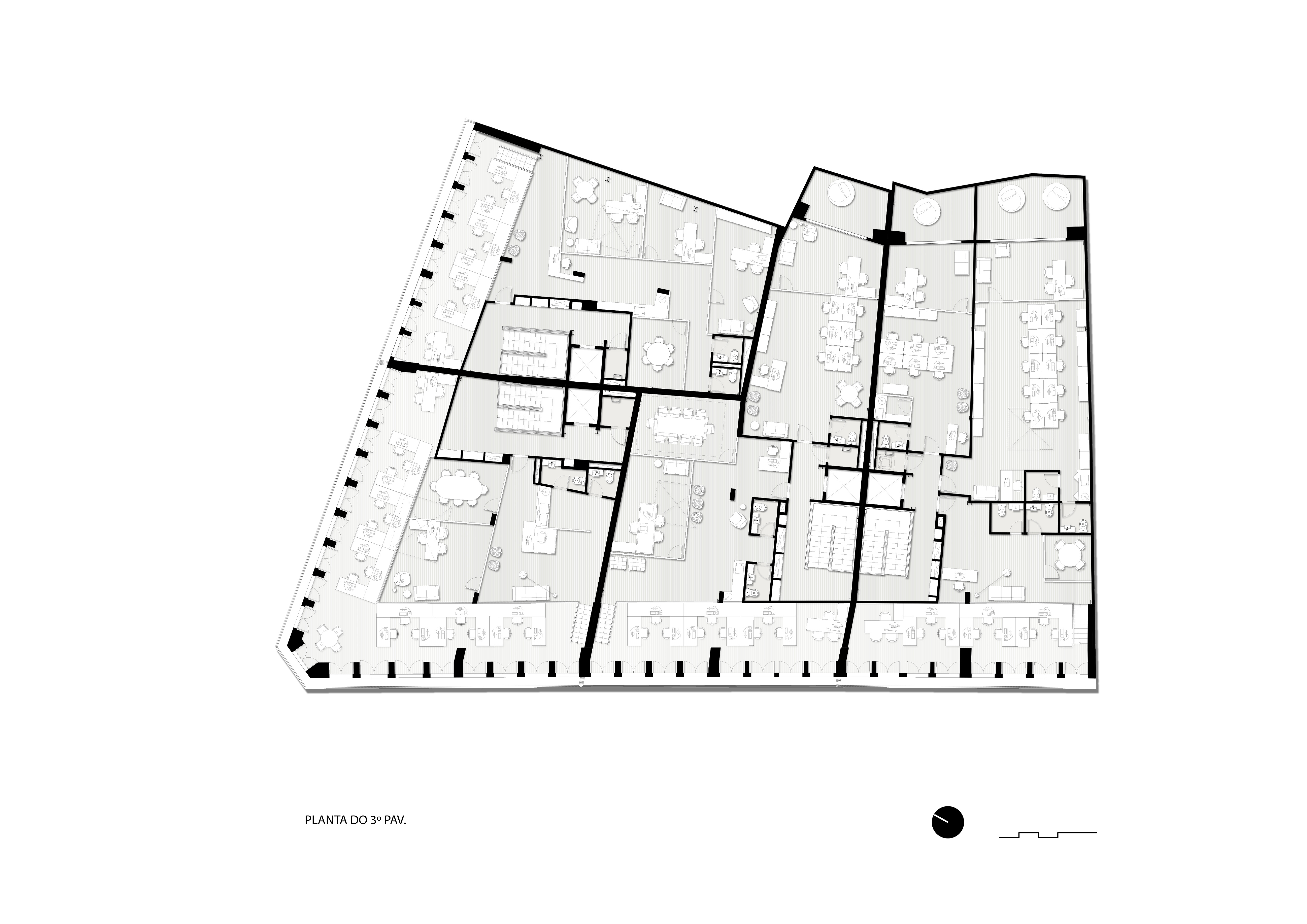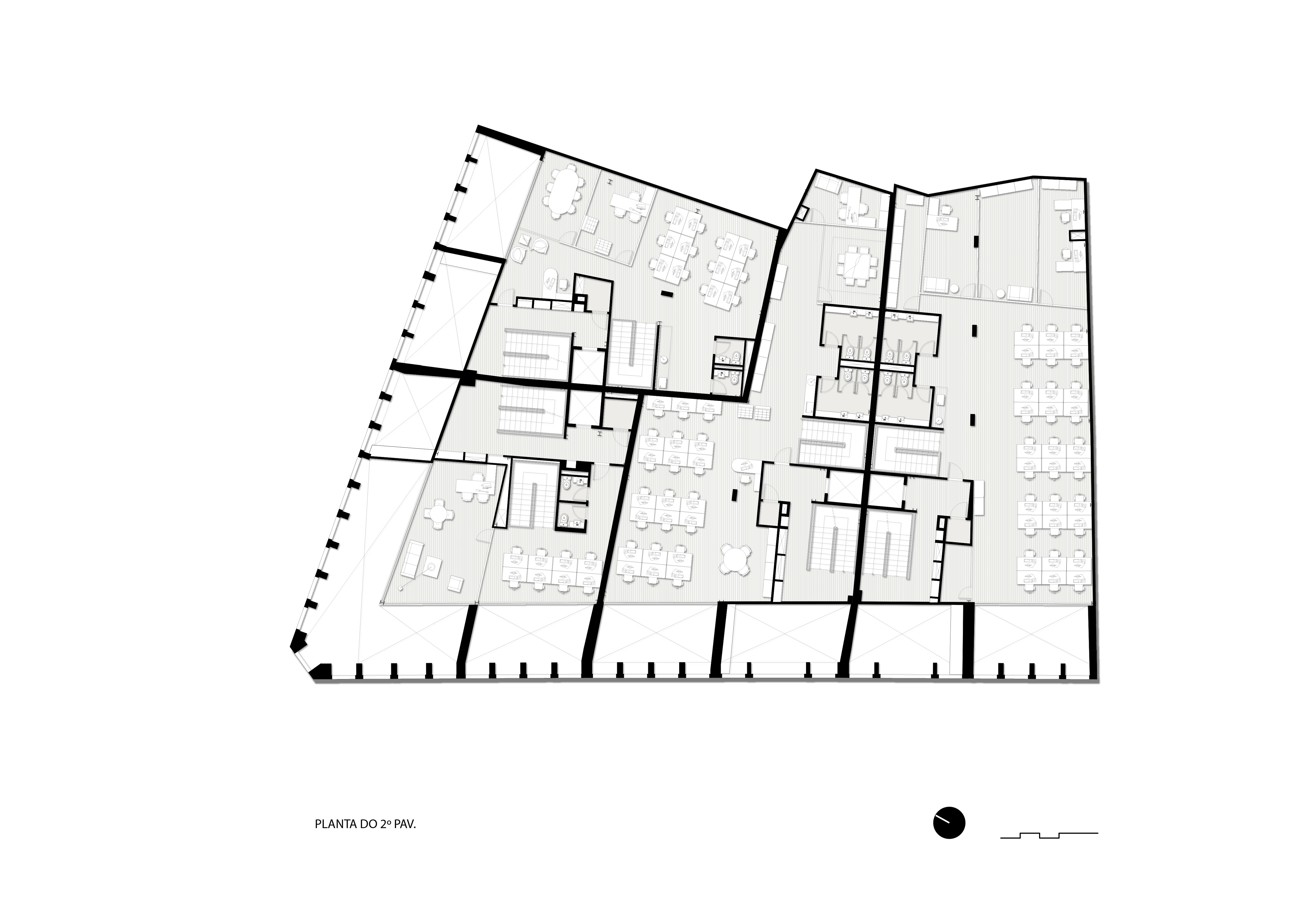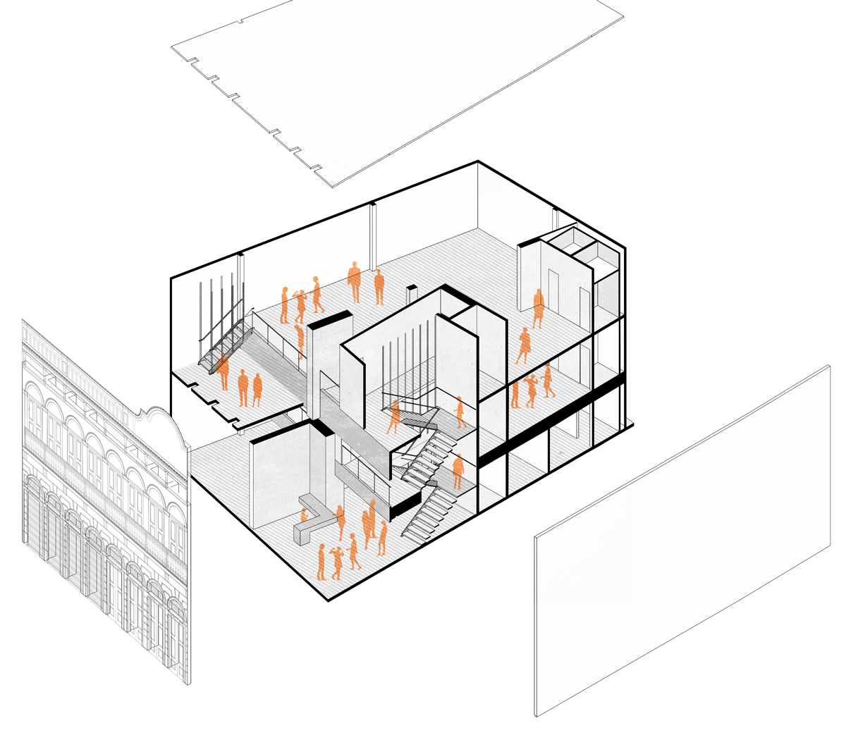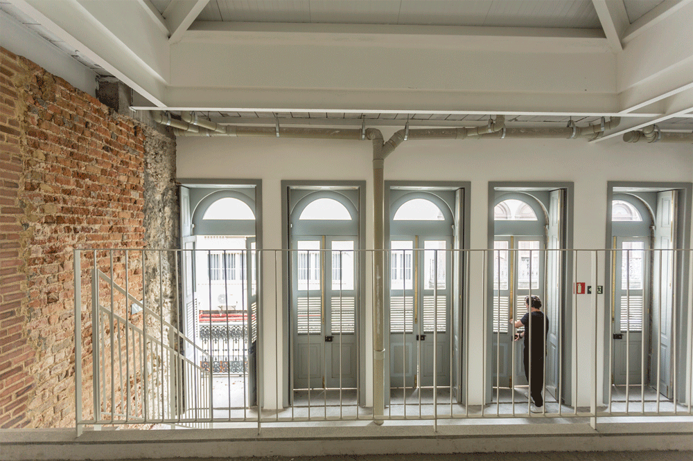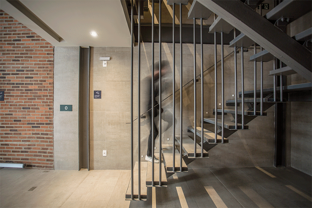 Determinantemente, tem-se a implementação da tecnologia no trato dos elementos arquitetônicos. A estrutura metálica foi pensada como redutor de esforços físicos incidentes nas fachadas históricas. Separando-se a estrutura das fachadas, permitiu sua recuperação e maior liberdade no trato do interior da edificação, implementando-se halls de acesso às circulações verticais e na conformação dos espaços das lojas e salas comerciais. As lojas são constituídas por subsolo, térreo e mezanino. A nova estrutura metálica possibilitou o implemento de um pavimento subsolo e também a perda do caráter estrutural dos baldrames originais. Permitiu-se assim a conservação dos mesmos, destacando o seu valor histórico de duas maneiras: a manutenção in loco dos baldrames, estruturados por pilares metálicos, e o acondicionamento dos mesmos em invólucros no piso, de onde abrem-se janelas para sua. A parte desmontada dos baldrames foi reaproveitada na composição de novas paredes, criando uma textura nova que, no entanto, remete aos materiais do passado. Otimizaram-se os espaços, resultando num total de quatro pavimentos, em contraposição aos dois originais. Para o pavimento superior, composto pelas sete salas comerciais, foi proposto o rebaixo da laje do pavimento próxima às fachadas, de modo a se permitir o acesso das fenestras e sacadas históricas, garantindo o seu uso diante da reconversão da edificação. A concepção de uma claraboia além de remeter estilo da época dos sobrados interage com o mezanino e vãos de fachada favorecendo à circulação da luz natural.