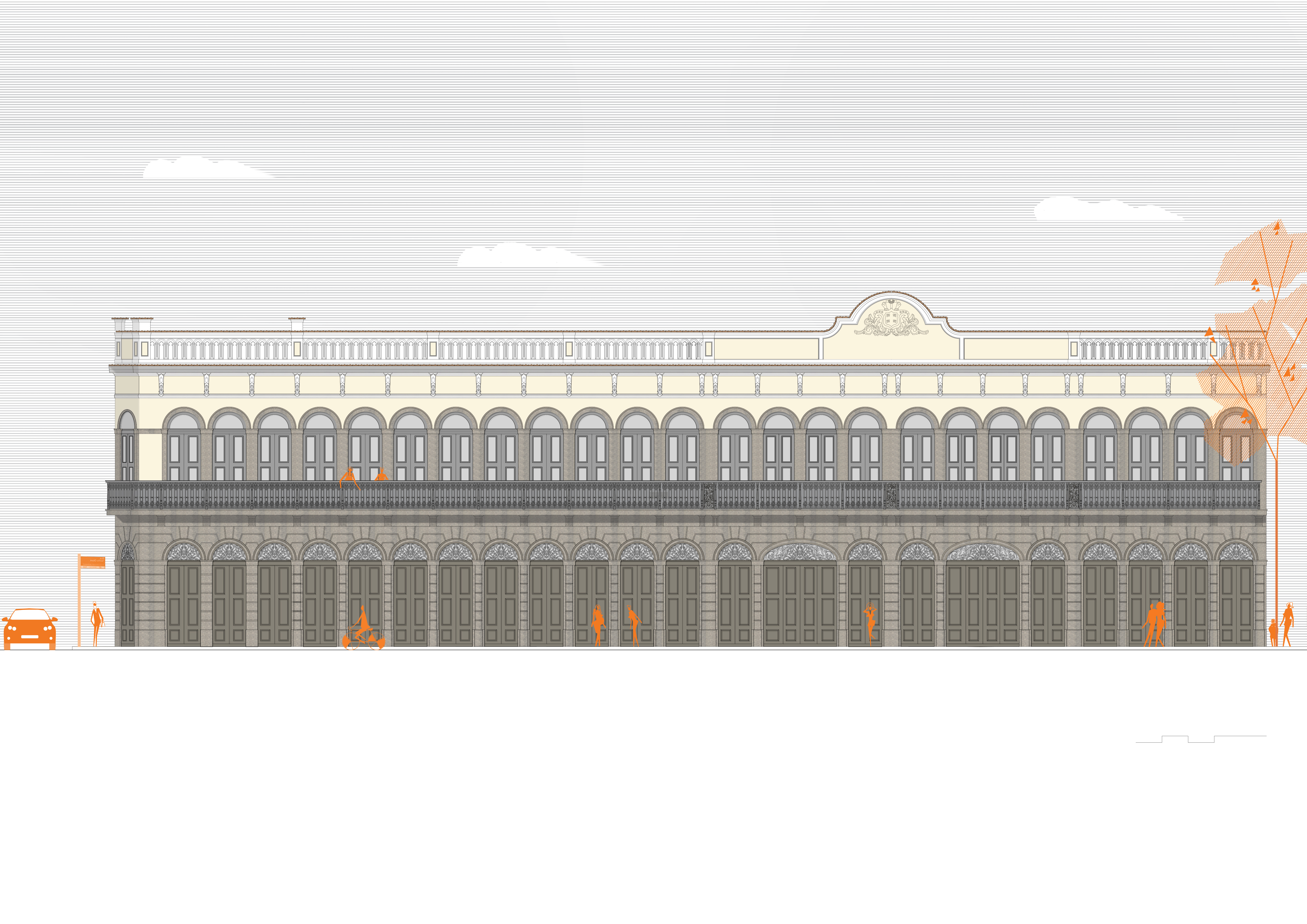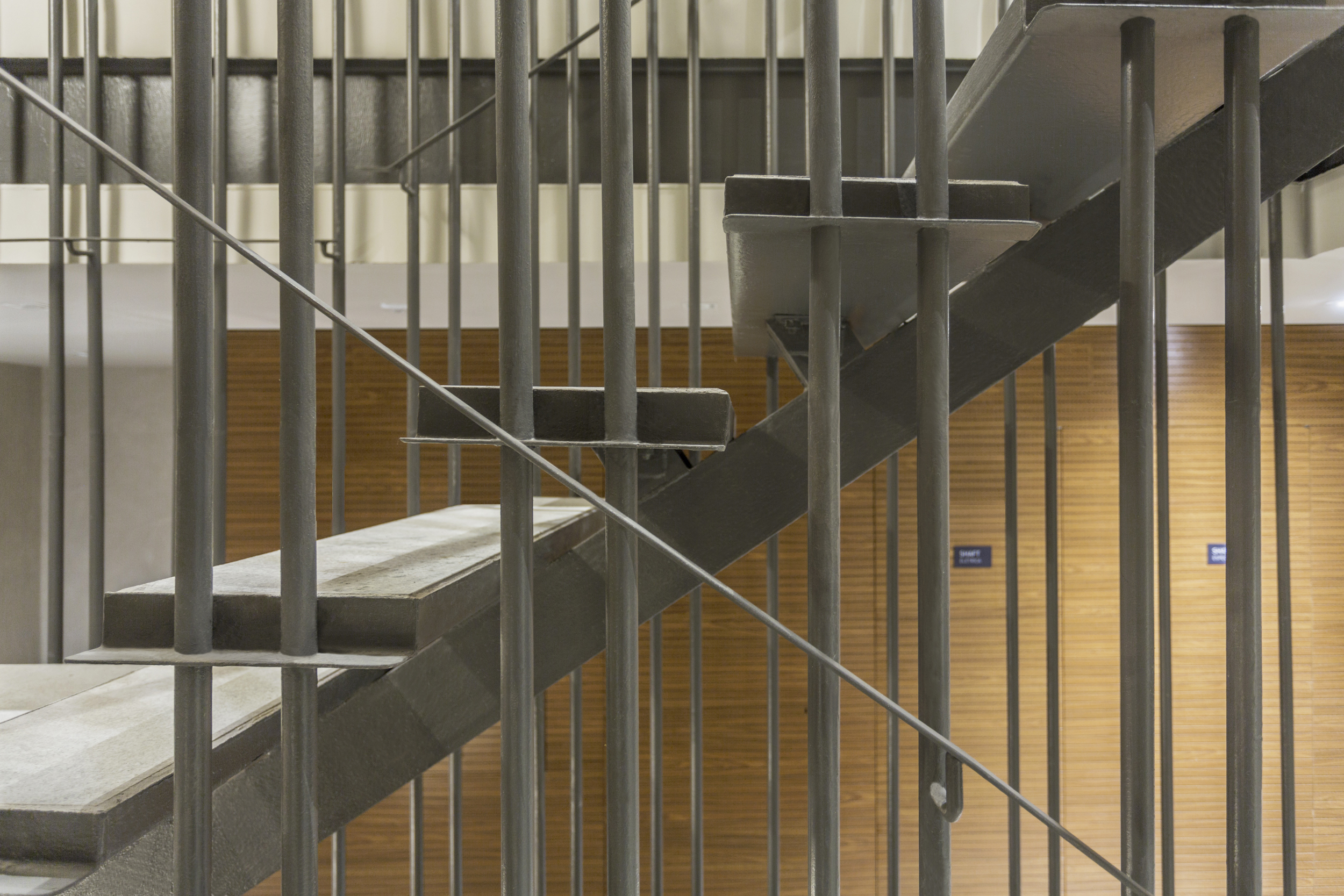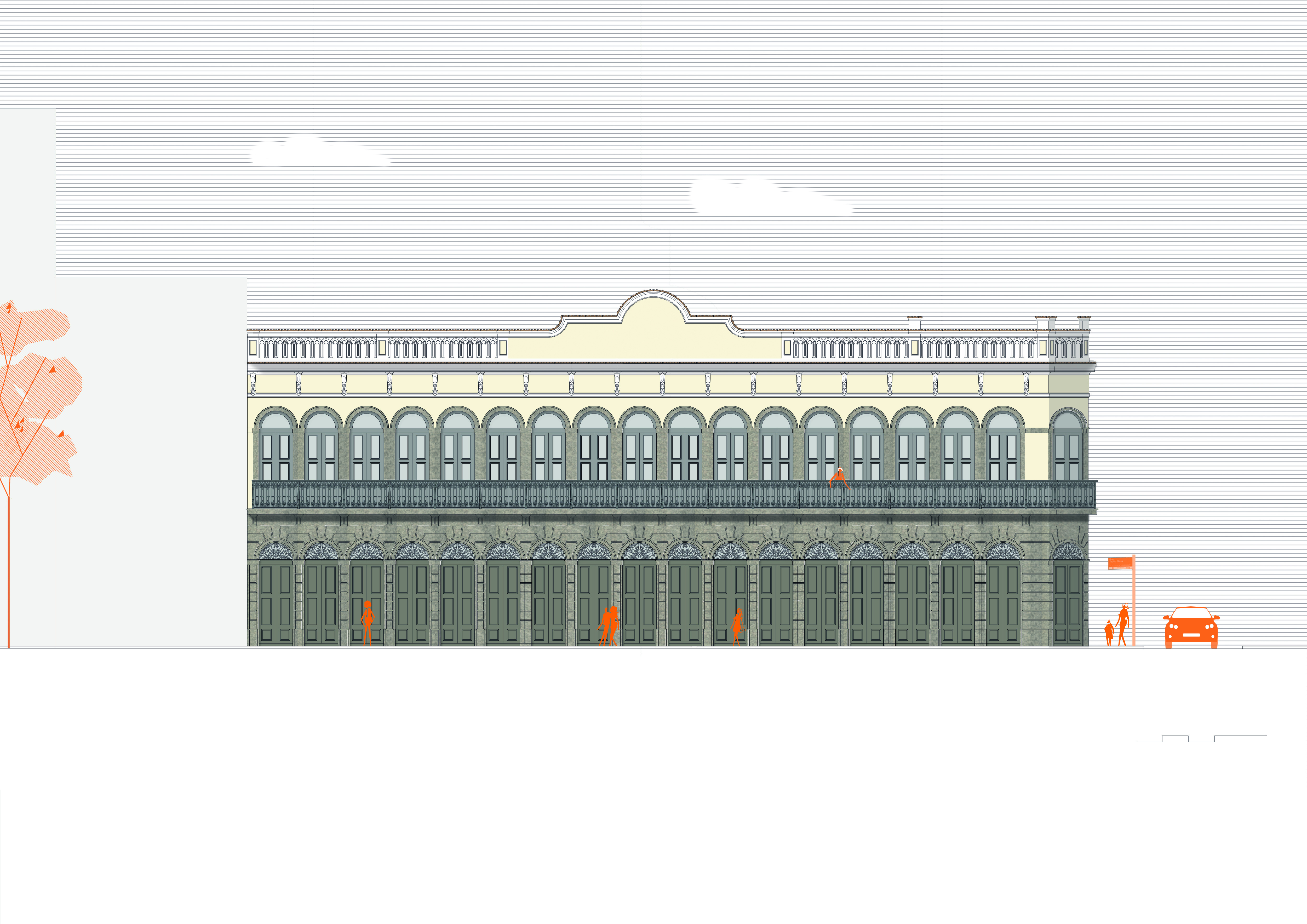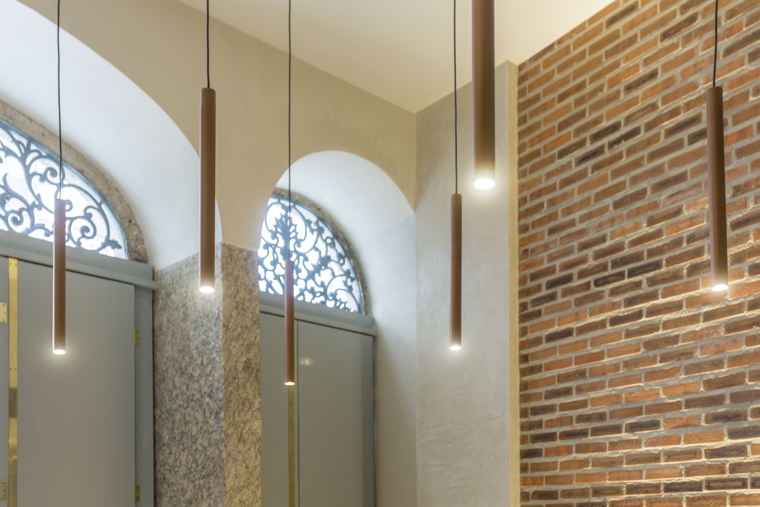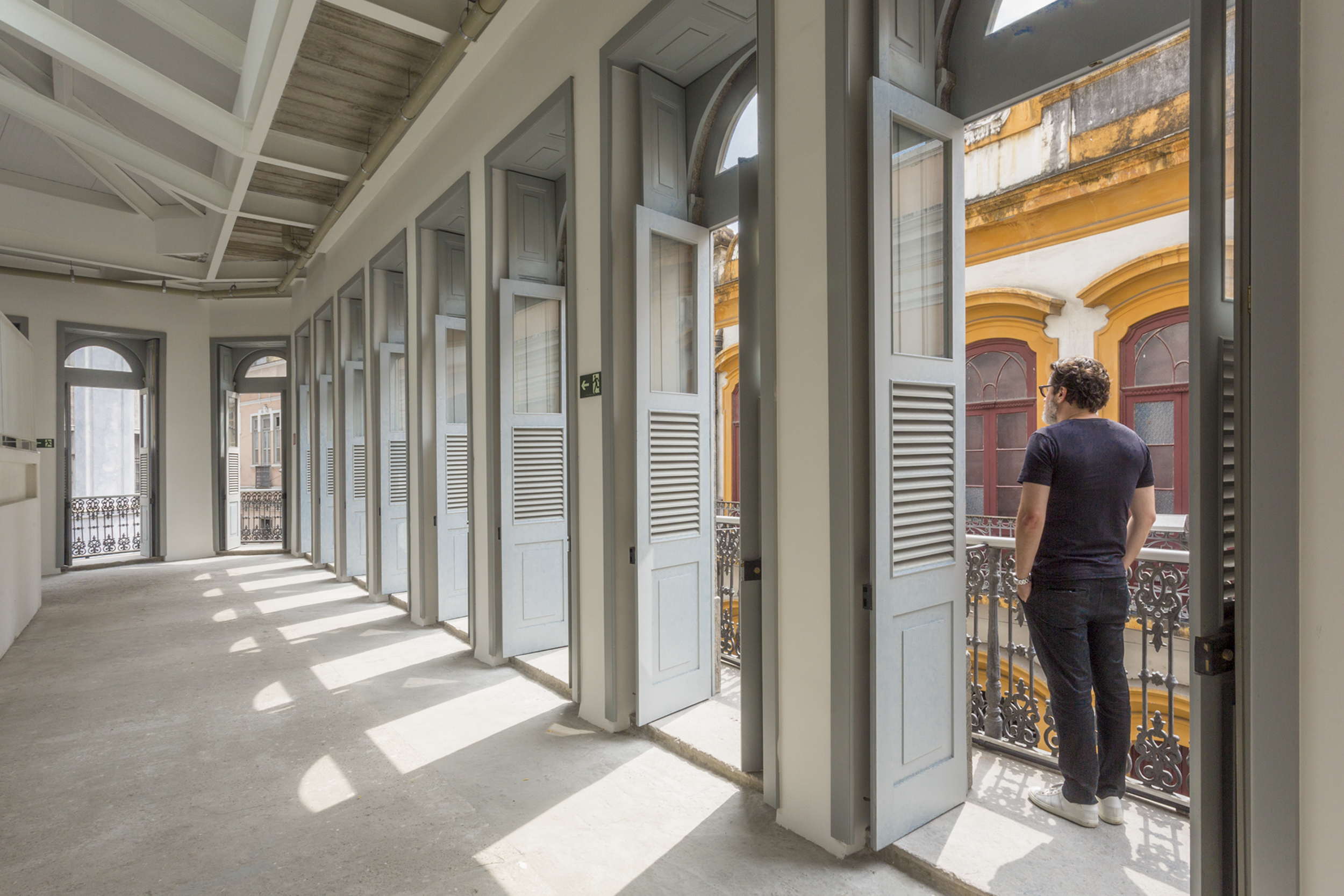 Determinantemente, tem-se a implementação da tecnologia no trato dos elementos arquitetônicos. A estrutura metálica foi pensada como redutor de esforços físicos incidentes nas fachadas históricas. Separando-se a estrutura das fachadas, permitiu sua recuperação e maior liberdade no trato do interior da edificação, implementando-se halls de acesso às circulações verticais e na conformação dos espaços das lojas e salas comerciais. As lojas são constituídas por subsolo, térreo e mezanino. A nova estrutura metálica possibilitou o implemento de um pavimento subsolo e também a perda do caráter estrutural dos baldrames originais. Permitiu-se assim a conservação dos mesmos, destacando o seu valor histórico de duas maneiras: a manutenção in loco dos baldrames, estruturados por pilares metálicos, e o acondicionamento dos mesmos em invólucros no piso, de onde abrem-se janelas para sua. A parte desmontada dos baldrames foi reaproveitada na composição de novas paredes, criando uma textura nova que, no entanto, remete aos materiais do passado. Otimizaram-se os espaços, resultando num total de quatro pavimentos, em contraposição aos dois originais. Para o pavimento superior, composto pelas sete salas comerciais, foi proposto o rebaixo da laje do pavimento próxima às fachadas, de modo a se permitir o acesso das fenestras e sacadas históricas, garantindo o seu uso diante da reconversão da edificação. A concepção de uma claraboia além de remeter estilo da época dos sobrados interage com o mezanino e vãos de fachada favorecendo à circulação da luz natural.