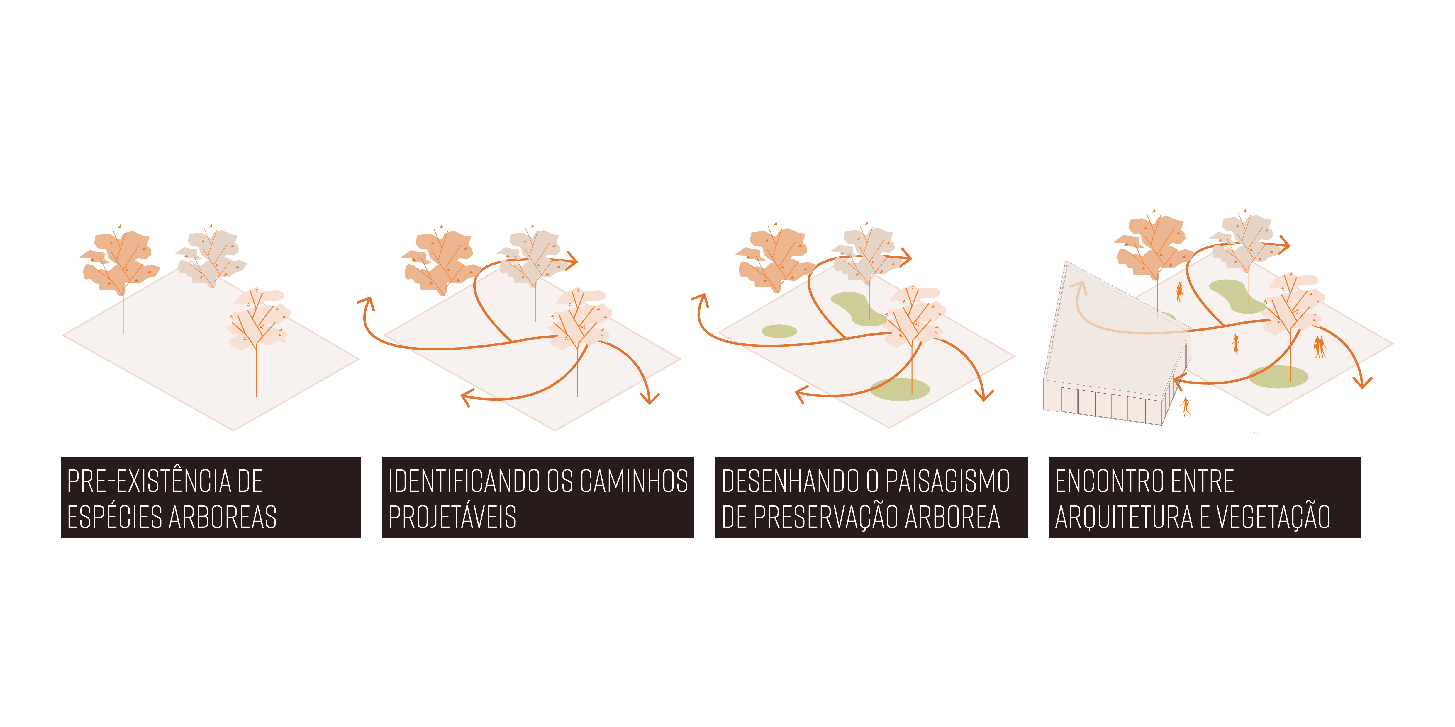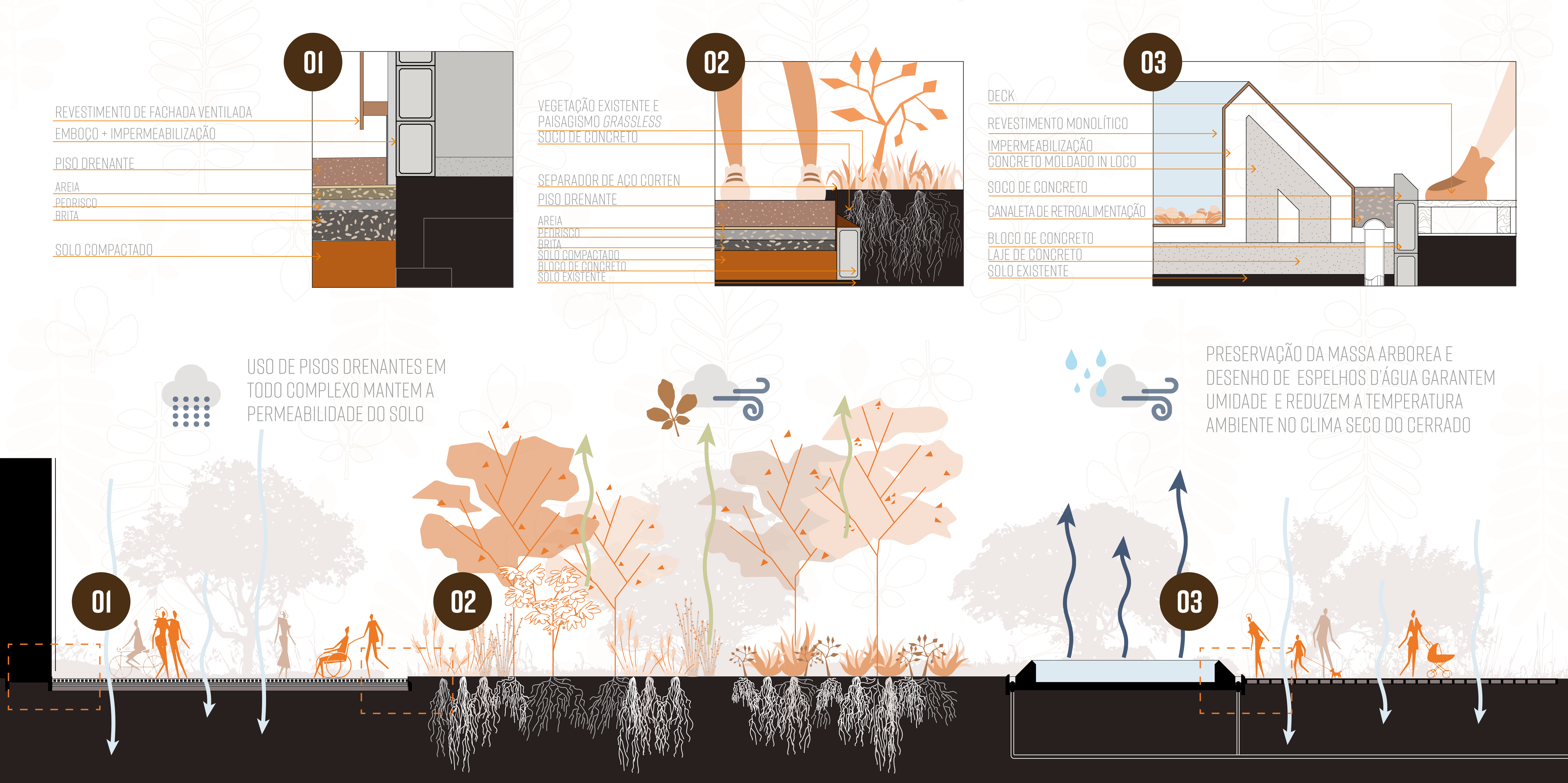 O projeto, que se espraia sobre o terreno criando espaços amplos e fluídos, permeados pela iluminação natural e pela ventilação cruzada, manteve grande parte da vegetação nativa local e capturou nos seus elementos as texturas e colorações do cerrado. A sua principal âncora não é uma loja, mas um parque de dez mil metros quadrados, com mais de mil árvores nativas preservadas, um verdadeiro “passeio público” entremeado por uma diversidade de usos em relação estreita com o ar livre. No seu paisagismo, as formas sinuosas na pavimentação e do mobiliário se inspiram nas trilhas que cortam as chapadas, no seu relevo e nas formações rochosas, buscando amplitude visual e diversidade espacial.