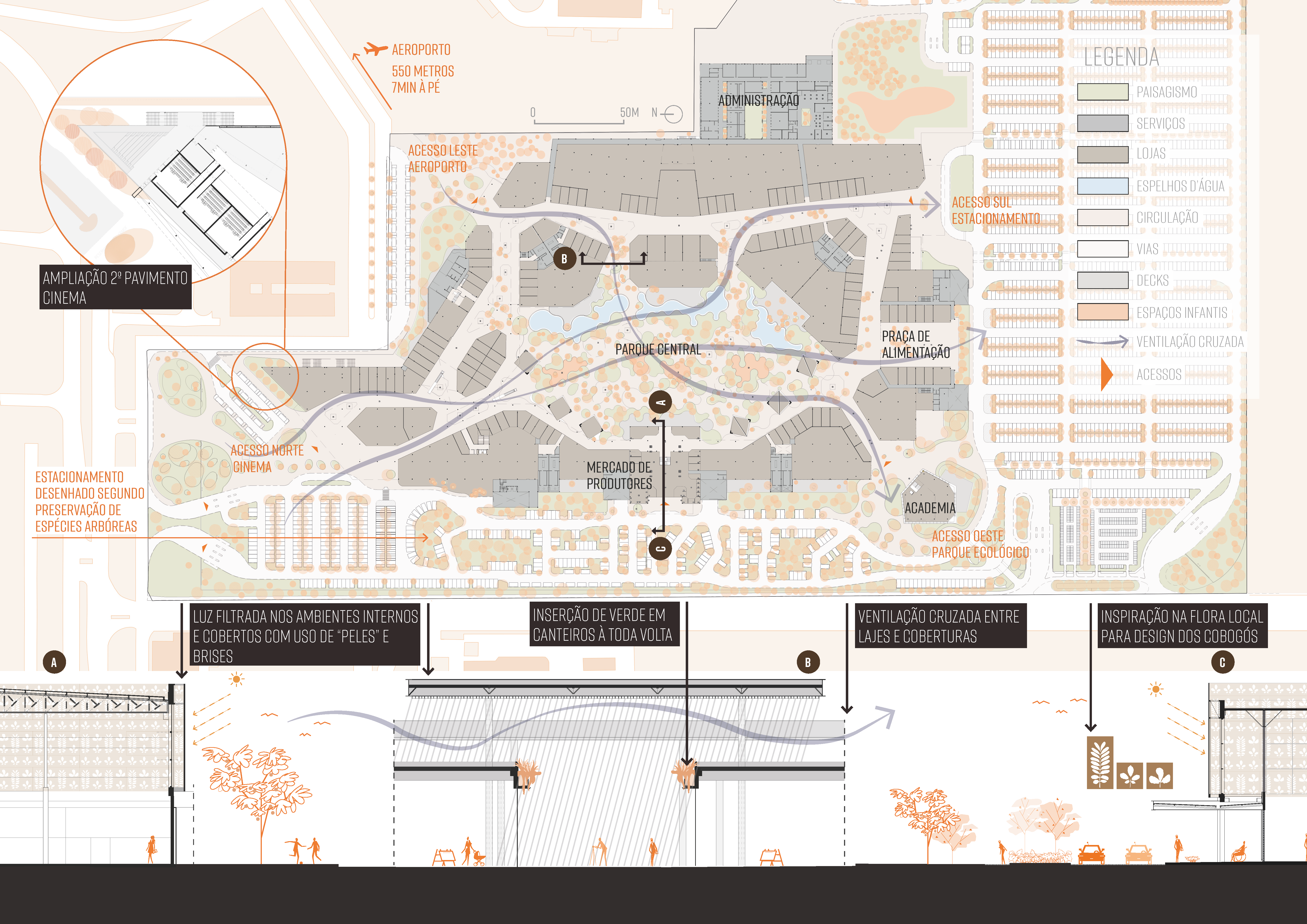 O empreendimento complementa o polo de infraestrutura urbana já existente, formado pelo Aeroporto e pelo parque comercial que se estabeleceu no seu entorno imediato. Ele foi planejado de modo que as operações comerciais e de lazer ofereçam, além da variedade de opções, uma organização espacial estruturada a partir de um percurso atrativo, em permanente contato com a natureza. A poesia da percepção das diferentes intensidades da luz natural no decorrer das fases do dia faz desse lugar um verdadeiro passeio ao ar livre, confluindo a experiência sensorial ao uso comercial.