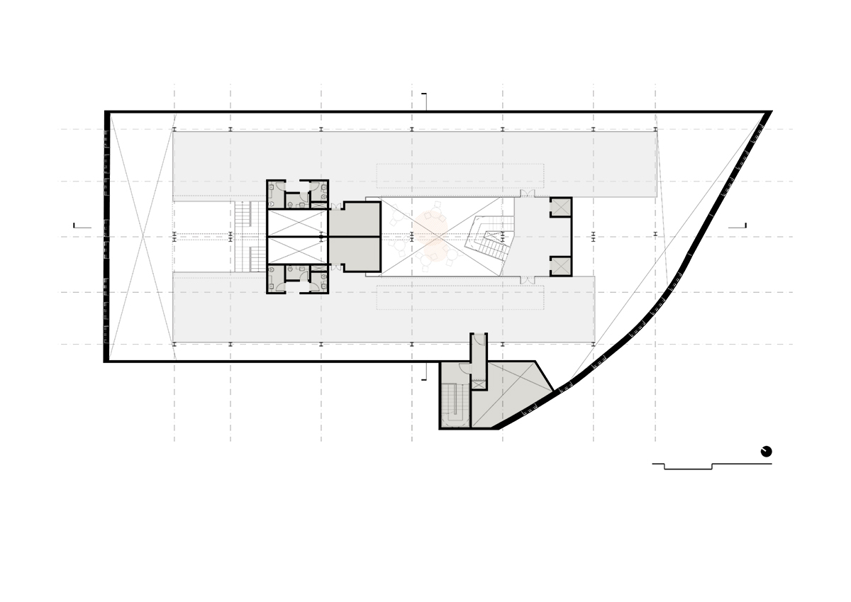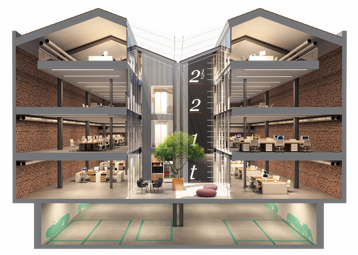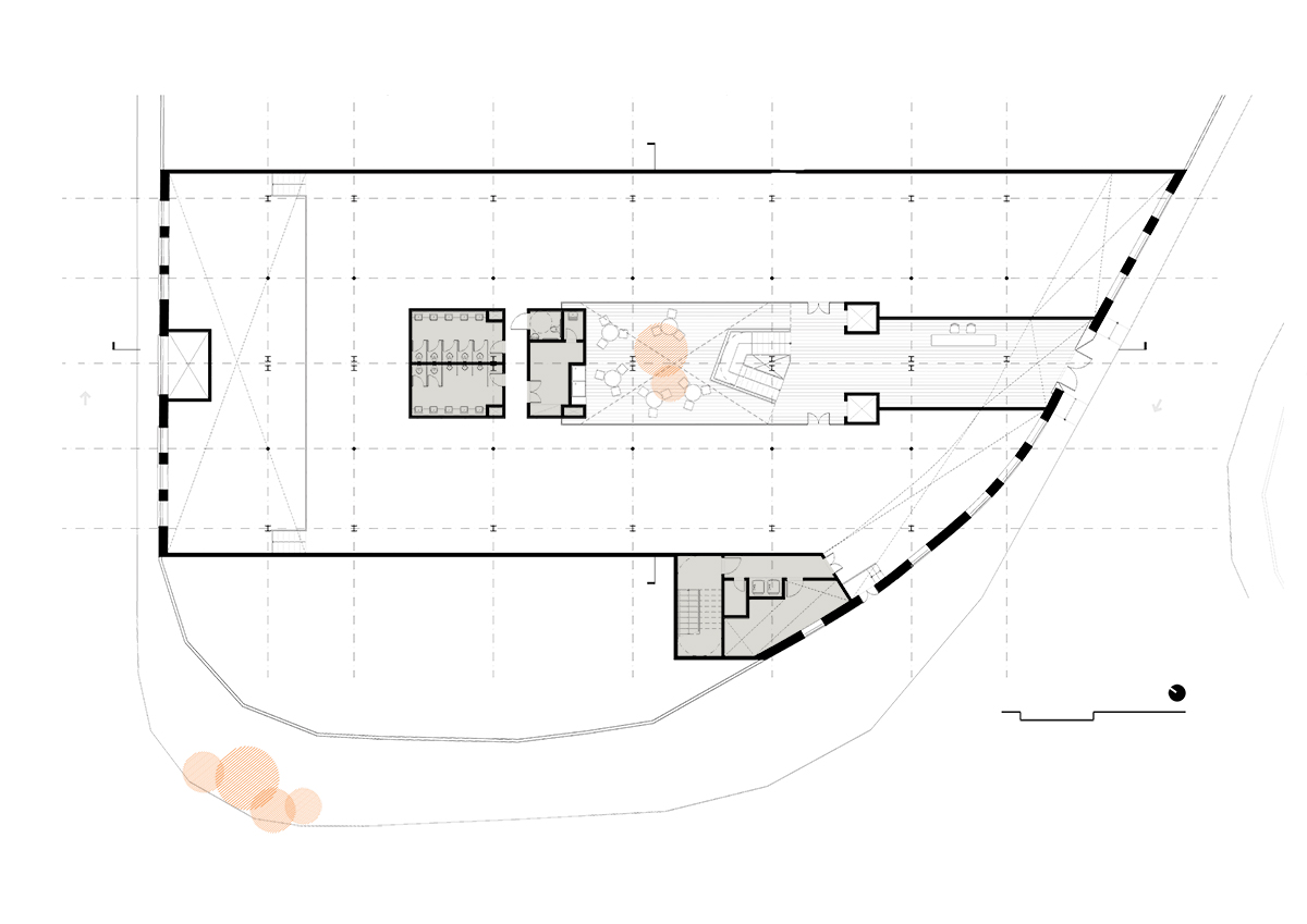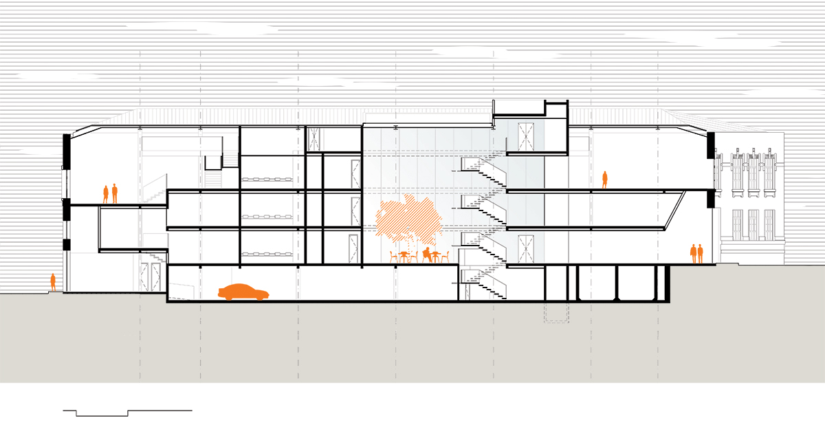 O projeto se desenvolve ao redor de um pátio central, cuja função é múltipla. O pátio permite a iluminação natural das amplas áreas, recebendo luz zenital por uma grande claraboia; oferece continuidade visual, luminosidade e melhor arejamento do edifício. Mantendo o pé direito total do edifício, permite conservar uma ligação direta com as dimensões originais do prédio, apesar da divisão em diferentes pavimentos. Do ponto de vista urbano, o pátio configura um espaço de transição entre a rua e as salas, oferecendo a possibilidade de um espaço de convivência que favorece a relação do prédio com o bairro circundante.