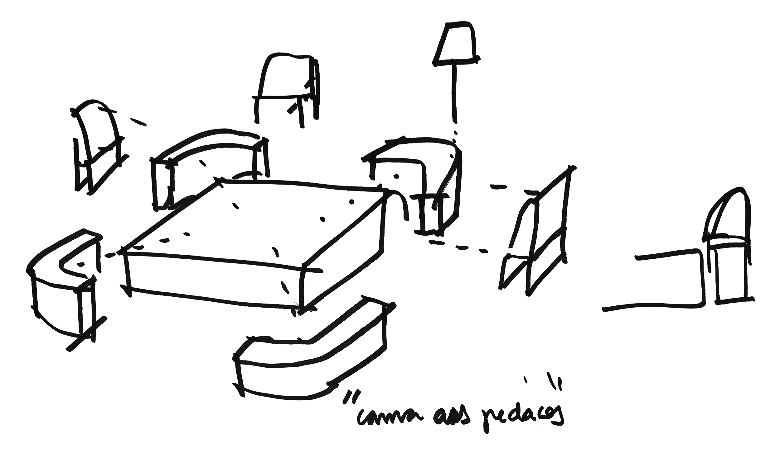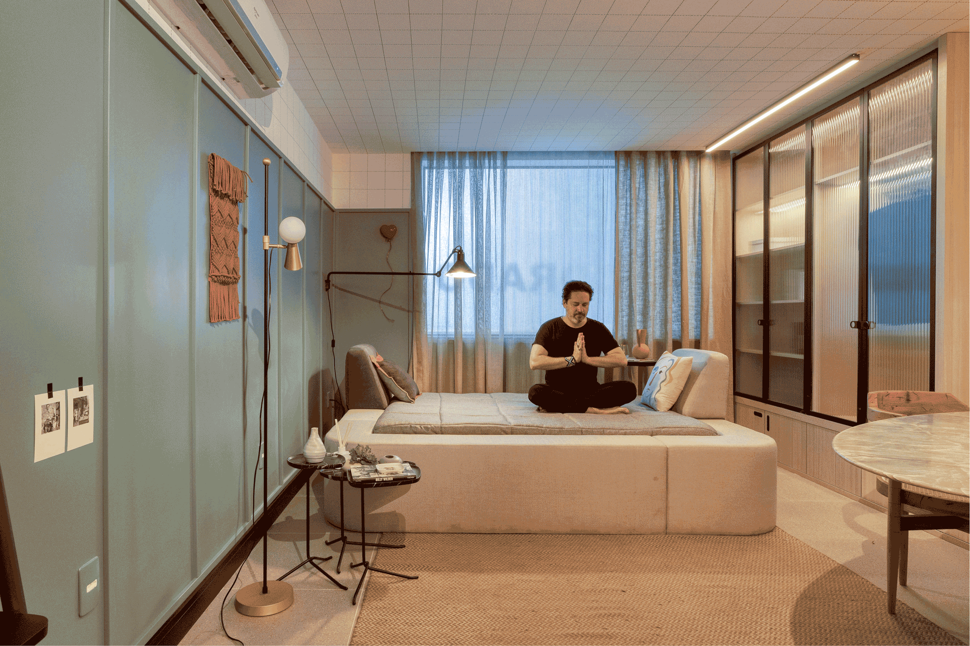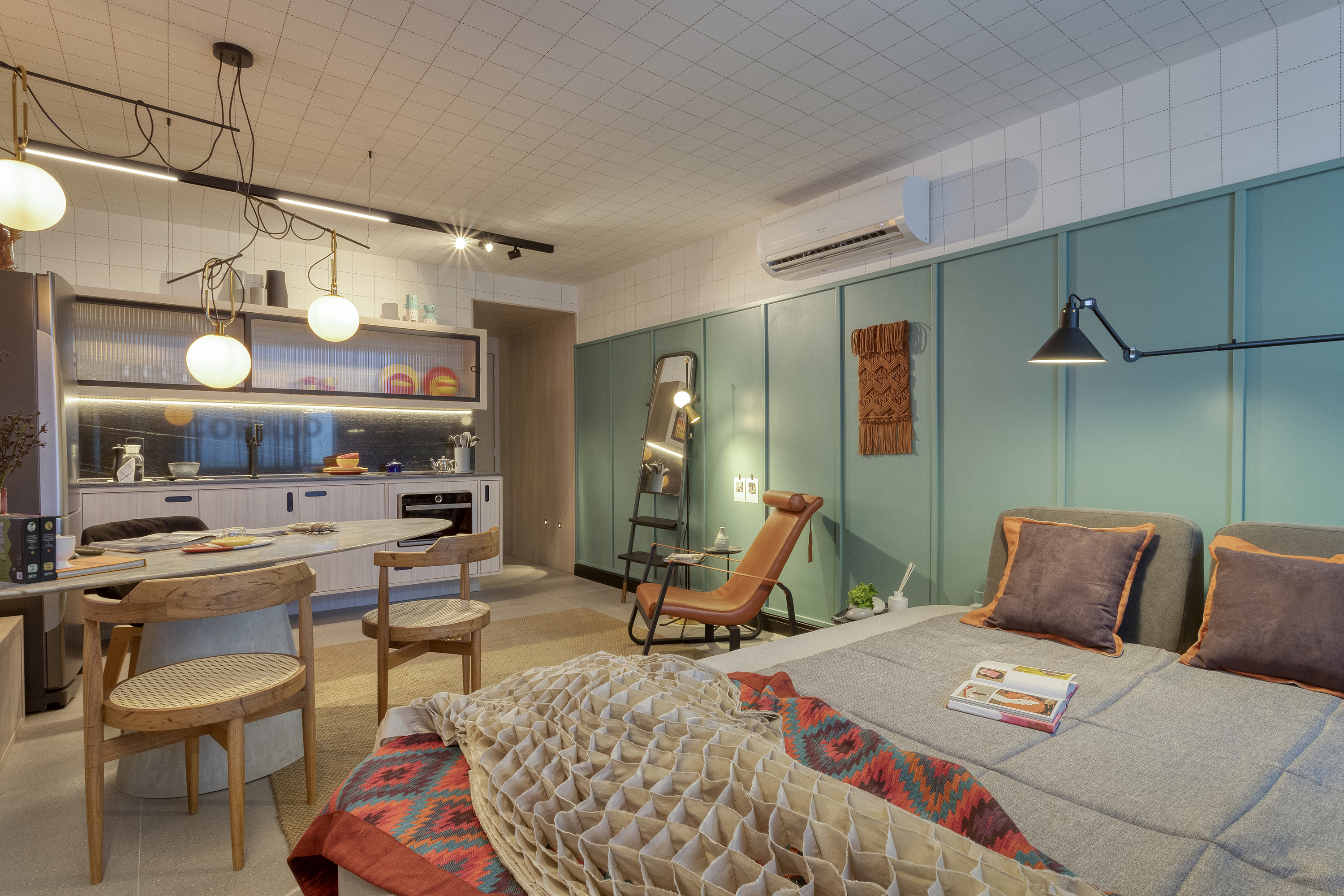 A cama, um desenho da Cité em parceria com a LZ Studio, foi o ponto central do processo criativo. A ideia foi criar um mobiliário versátil, com encostos (soltos e modulados) distintos e móveis que permitissem a multiplicidade de usos, não se limitando à sua função tradicional e podendo ser usada como um espaço de trabalho mais confortável e inesperado. A posição da televisão em relação à mesa de jantar e à cama, por exemplo, permite que ela seja usada como espelhamento do computador para apresentações e, também, para assistir televisão da cama. Já o aparador, pode ser um complemento de assentos para mesa de jantar.