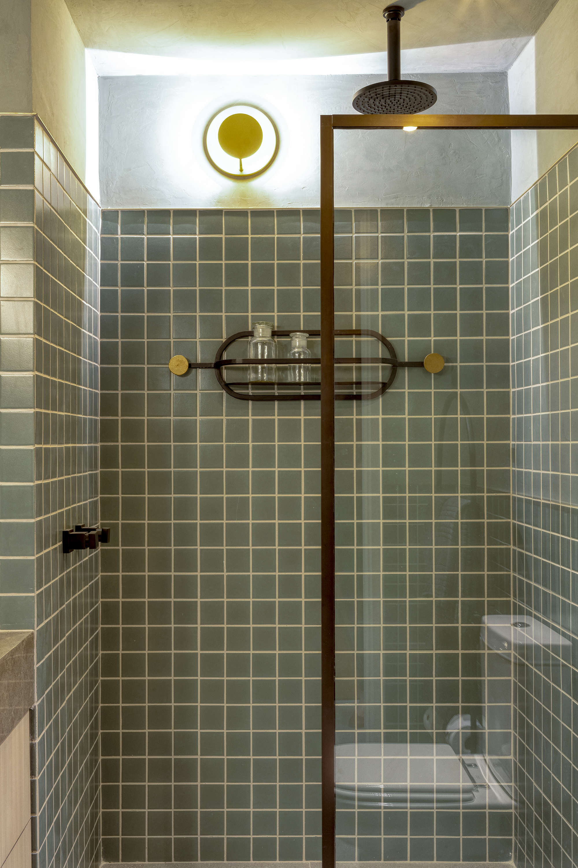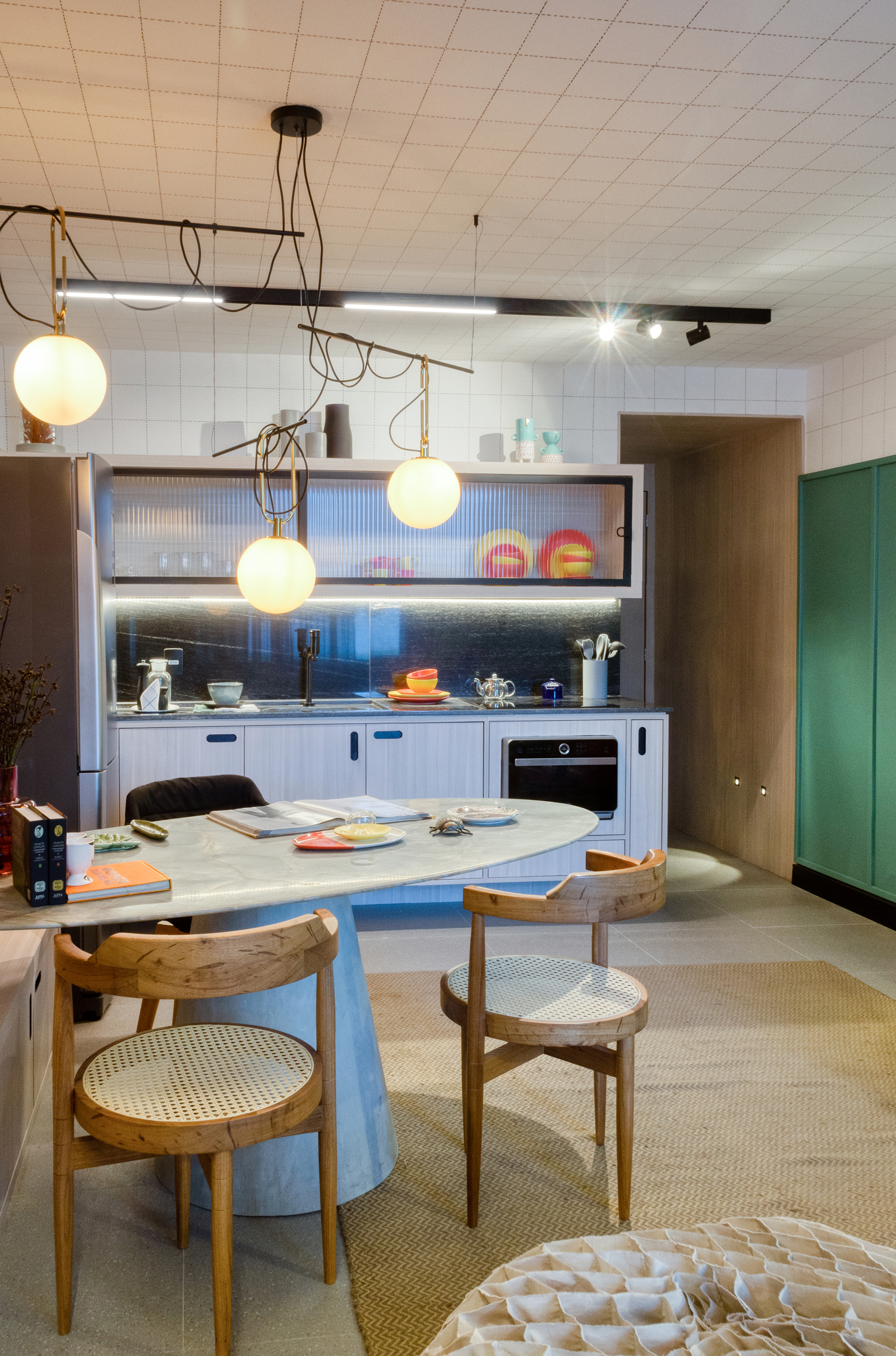 Essa mesa de jantar pode ainda ser usada como mesa trabalho ou como bancada auxiliar da cozinha, por isso, foi feita em pedra quartzito para ser resistente às suas múltiplas utilidades. Além disso, uma das cadeiras da mesa de jantar é hibrida: além de poltrona de jantar funciona como cadeira de escritório. Destaque para a marcenaria multifuncional, o painel boaserie em laca verde e para as paredes revestidas em marcenaria detalhada até os últimos detalhes, como no caso dos puxadores. O teto foi desenhado e pintado à mão para se tornar mais real e dar uma sensação de perspectiva, revelando uma imagem de um papel milimetrado, algo que suscita o desenhar dos sonhos.