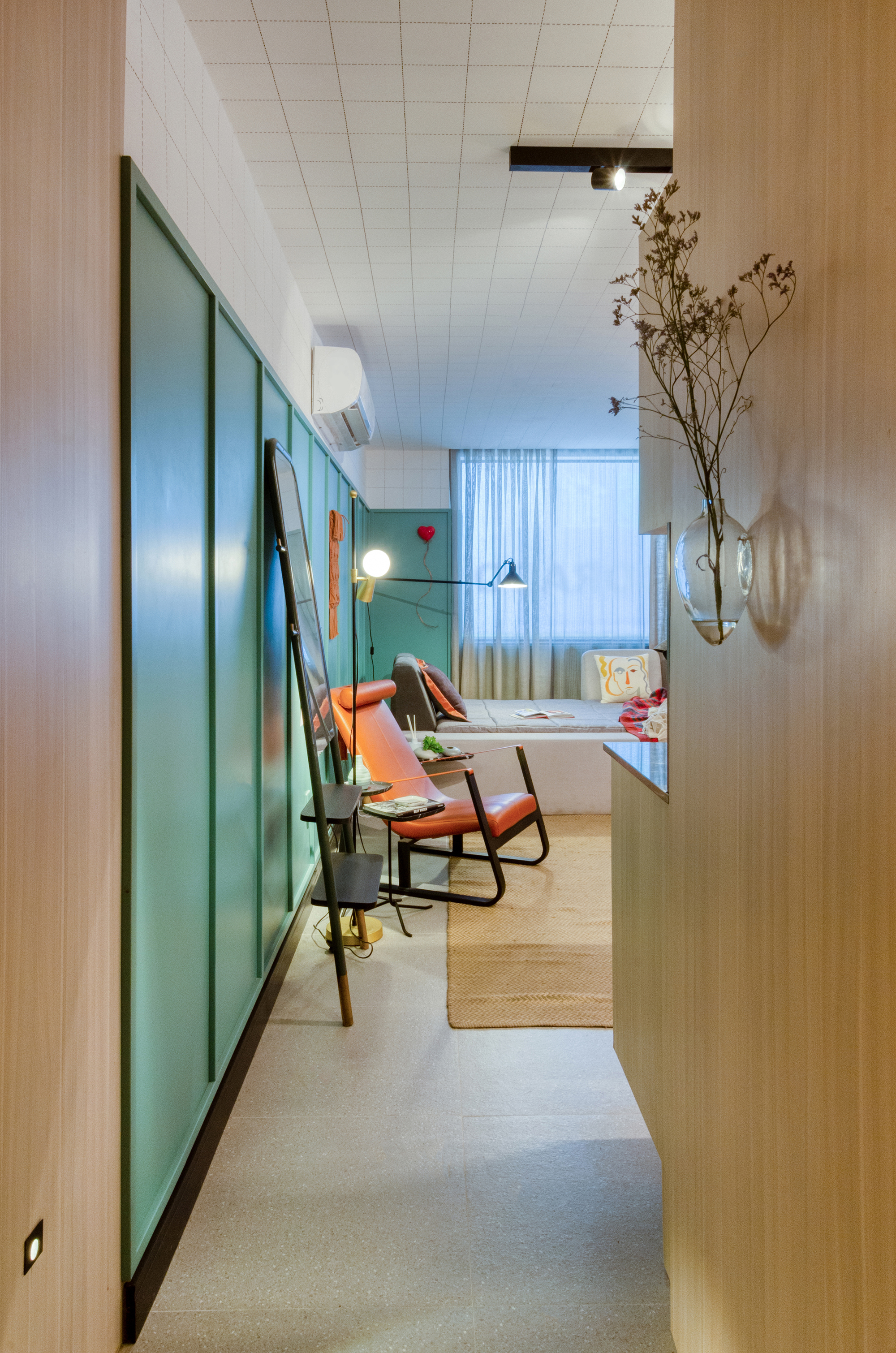 Como a janela, de proporções ampliadas e que ocupa quase toda extensão do apartamento, garante ao espaço uma melhor iluminação, optou-se por escolher móveis mais baixos, que não impedissem a generosa entrada luz. Na iluminação, foi utilizado um trilho multifuncional. O caráter escultórico dessa peça garante um atributo a mais, sem perder a funcionalidade. A luminária da cama pode ser pendente e quando movimentada funciona como luz de leitura.