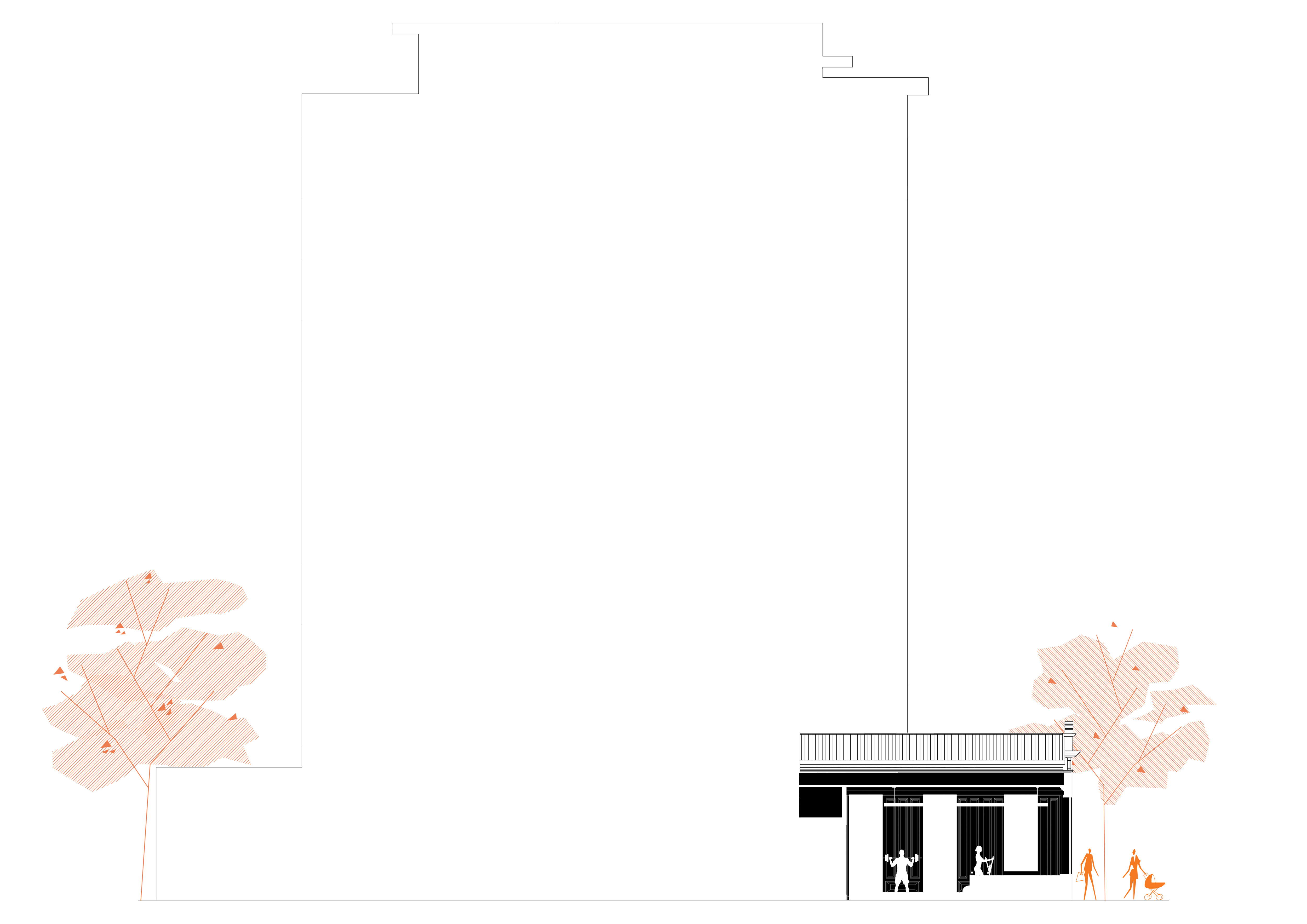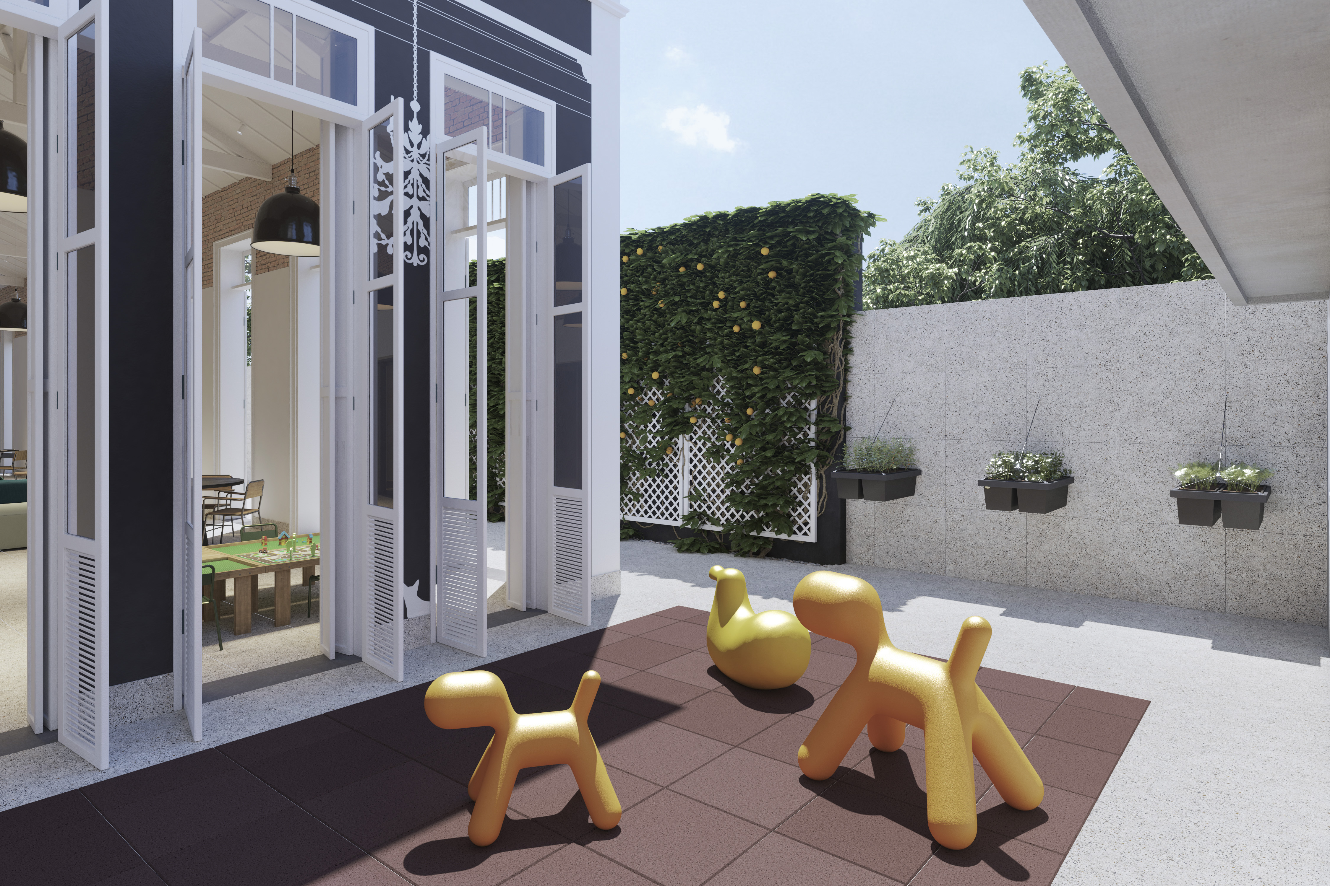 Nos dois sobrados, foram distribuídos os ambientes recreativos, em que os novos usos de lazer em conjunto com elementos clássicos, como lustres antigos, foram retratados nas fachadas como uma espécie de “raio-x” de seu interior, onde passado e presente se unem. É o que chamamos de um relato gráfico e arquitetônico na escala do pedestre, que permite a compreensão desses tempos distintos aos moradores e passantes. Concebido como um espaço integrado, onde os usos se mesclam, os interiores da área de lazer foram pensados com base em valores de compartilhamento e reunião. Valores esses que incentivaram a criação de outros atributos de projeto, como a horta urbana e a disposição de um carro compartilhado para uso dos moradores. Este é o primeiro empreendimento imobiliário do Rio de Janeiro a oferecer este tipo de serviço com incentivo à redução de carros na cidade.