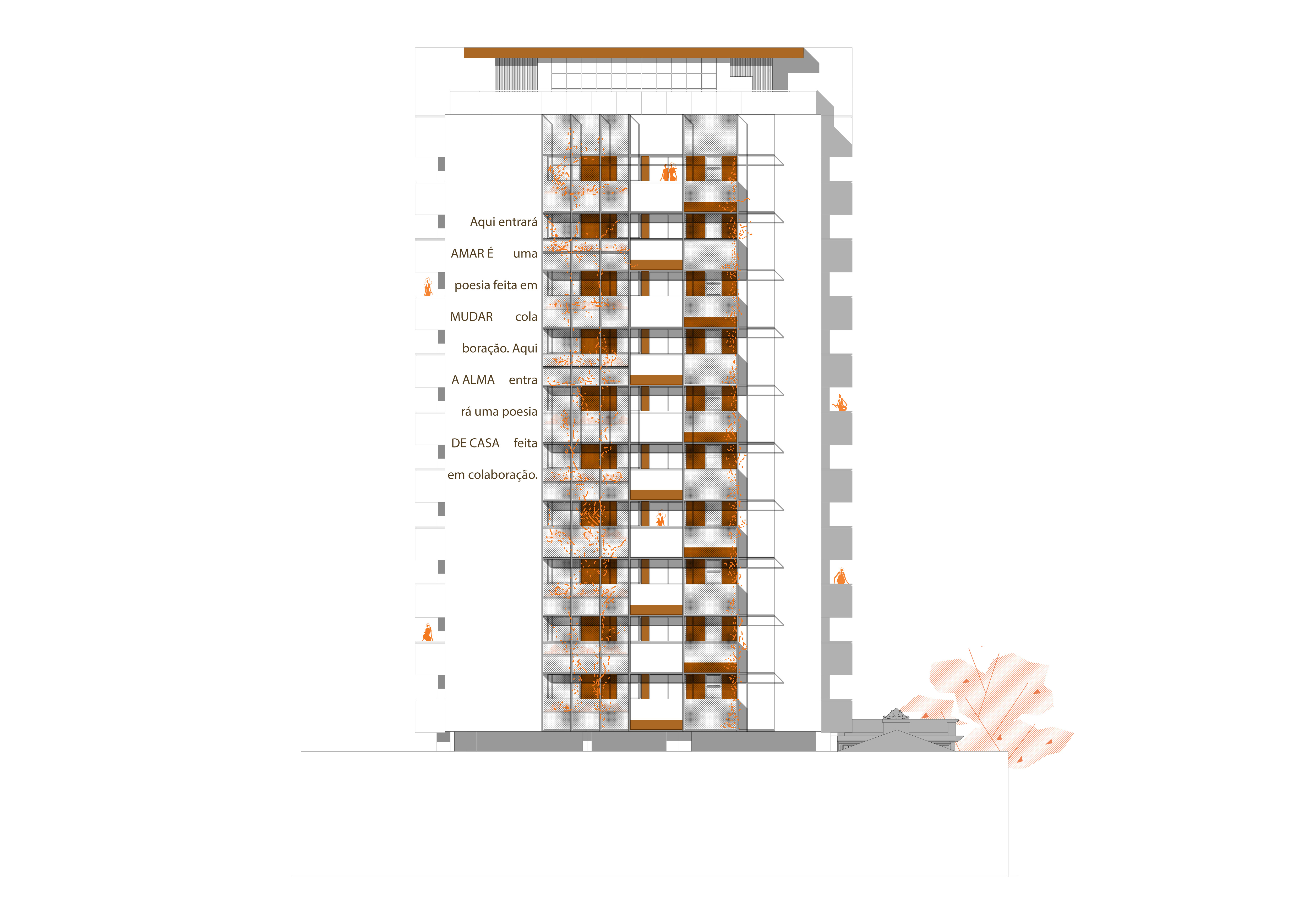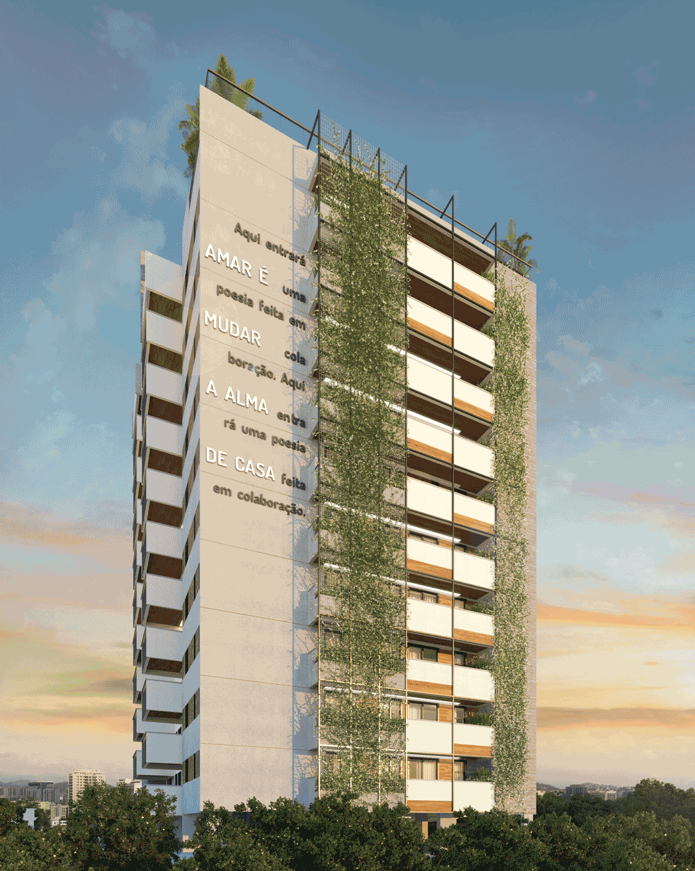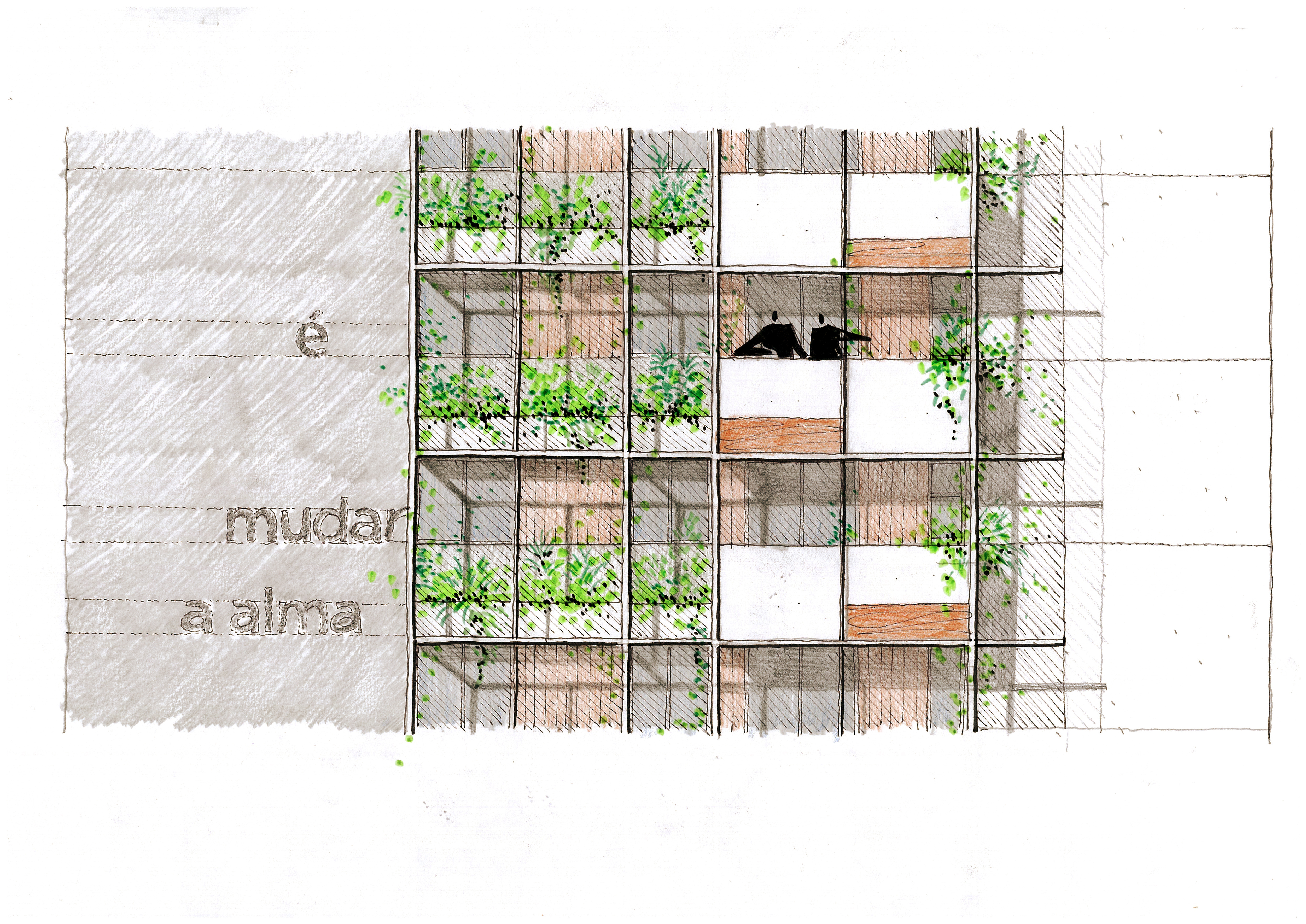 Na torre, o volume de 12 pavimentos possui elementos mais neutros, através do uso de concreto, de revestimentos brancos e cinzas e dos detalhes em madeira, para destacar a pele verde na fachada voltada para o Viaduto Paulo de Frontin. Assim, a neutralidade do corpo principal do edifício respeita e valoriza seu embasamento e os sobrados. Outro caráter explorado no projeto foi a generosidade urbana de oferecer à cidade a delicadeza da pele verde junto à sutileza da poesia escrita na fachada, com mensagens pensadas para funcionar durante o dia e durante a noite. Dessa maneira, a própria arquitetura estimula poética e visualmente quem transita pela cidade, em especial àqueles que passam apressados pelo Viaduto Paulo de Frontin.