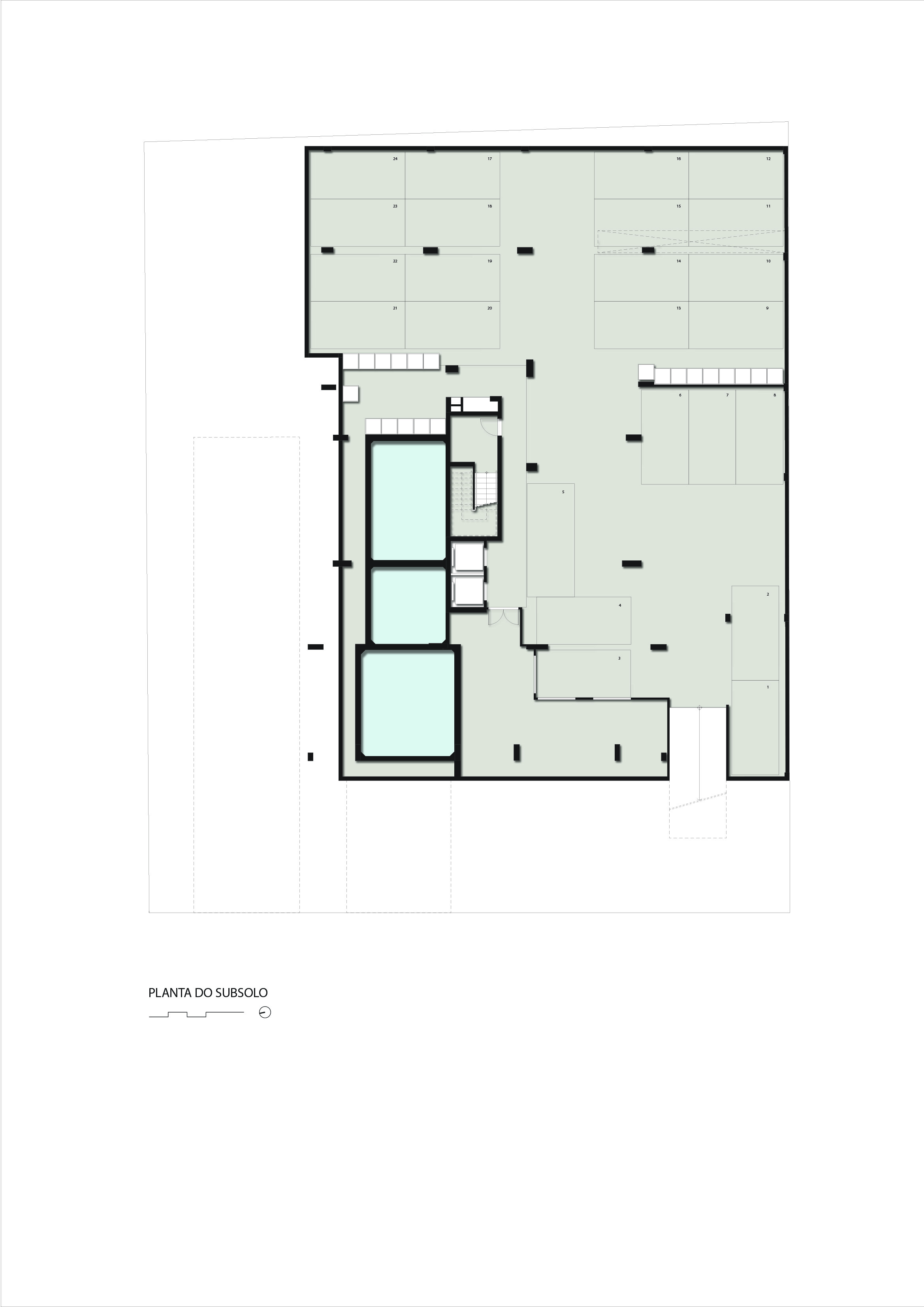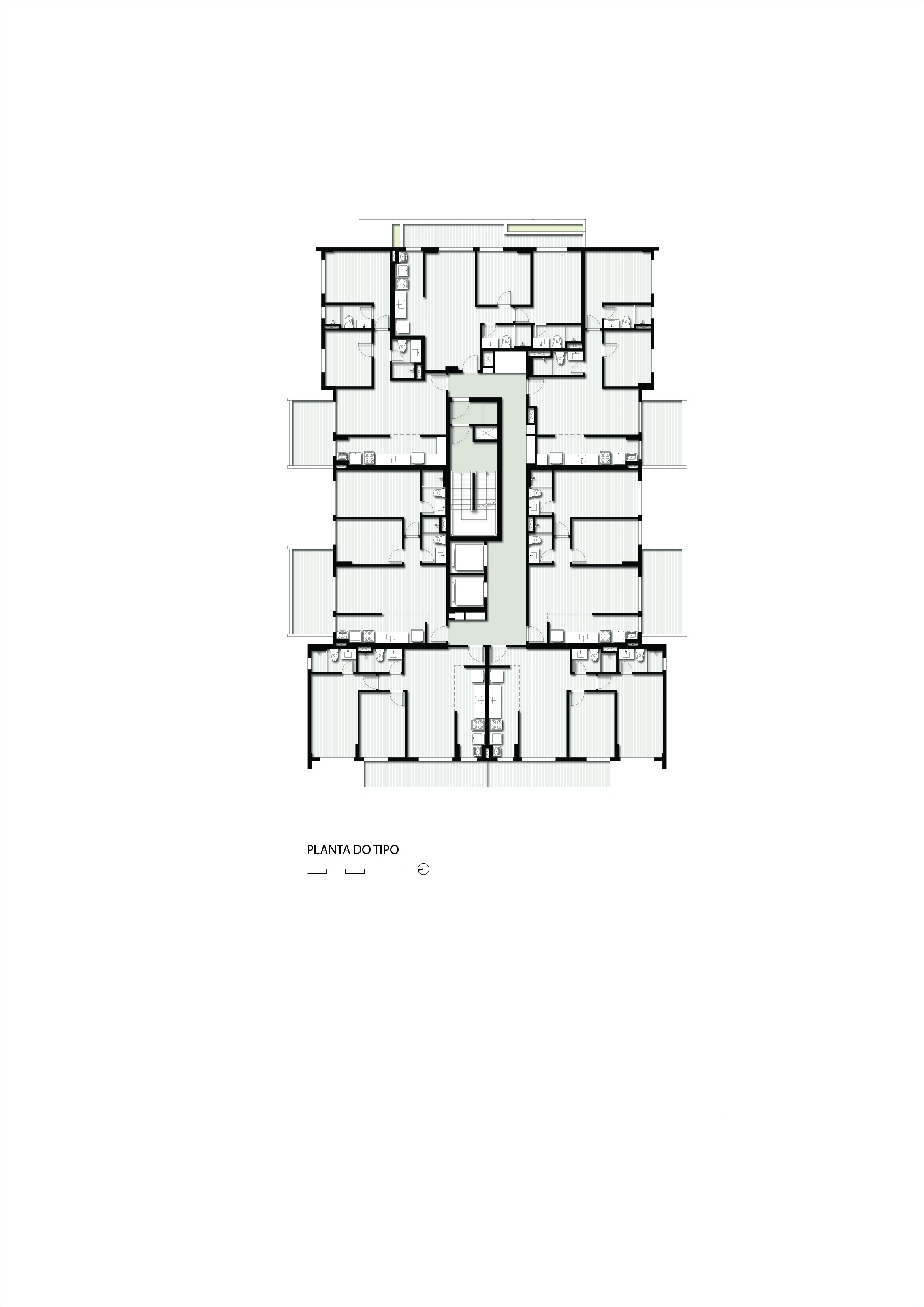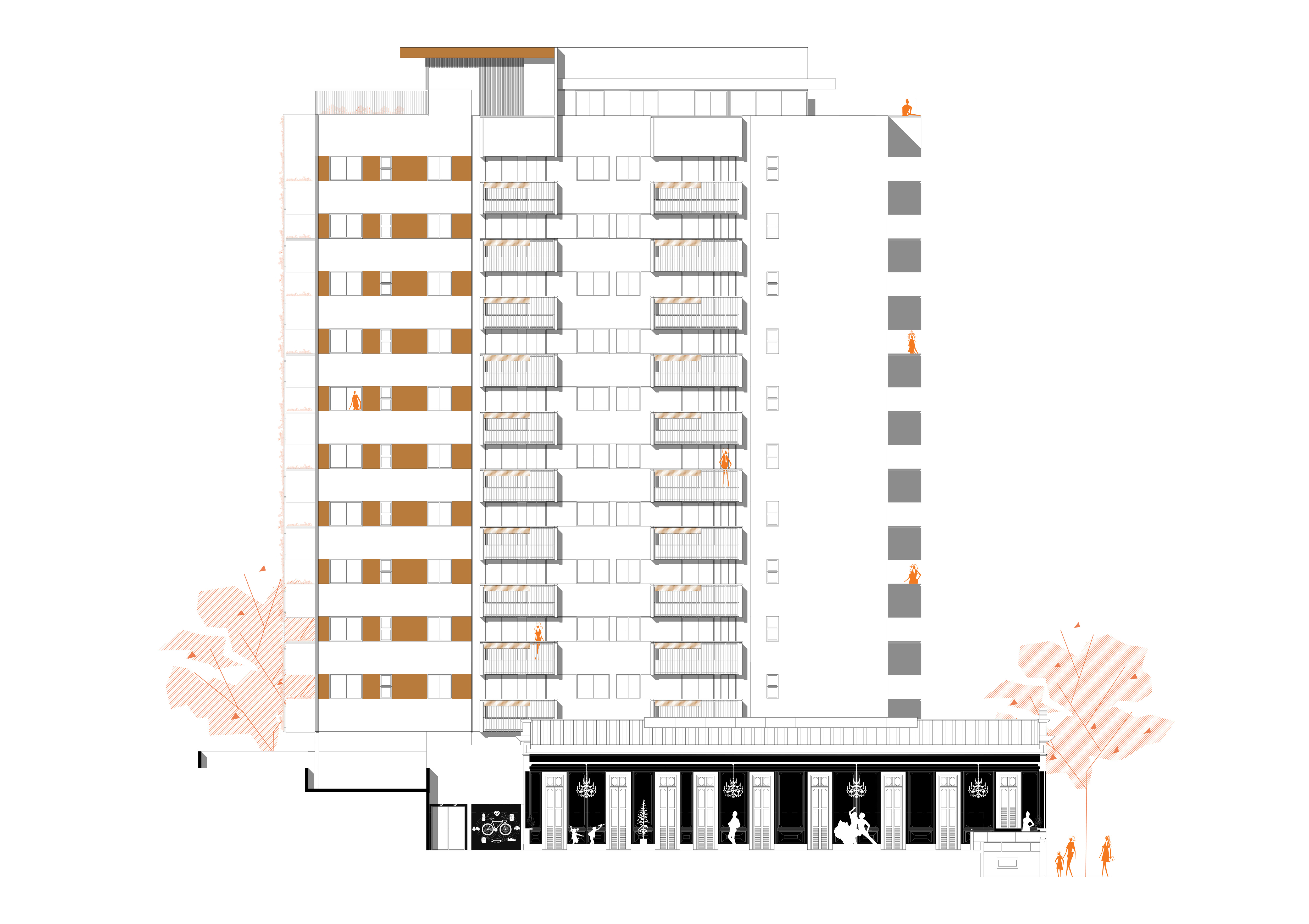 Com a premissa da integração entre passado e presente, elaboramos proposições diferentes para cada uma das três partes que compõem o projeto. No embasamento, espaço conector entre os sobrados e o novo edifício, foram distribuídas as funções mais utilitárias e necessárias a um prédio residencial. A exemplo do acesso principal, que se revela através do avanço de um pórtico perfurado para além do limite da fachada e da colocação do nome do empreendimento, sinalizando a entrada do edifício.