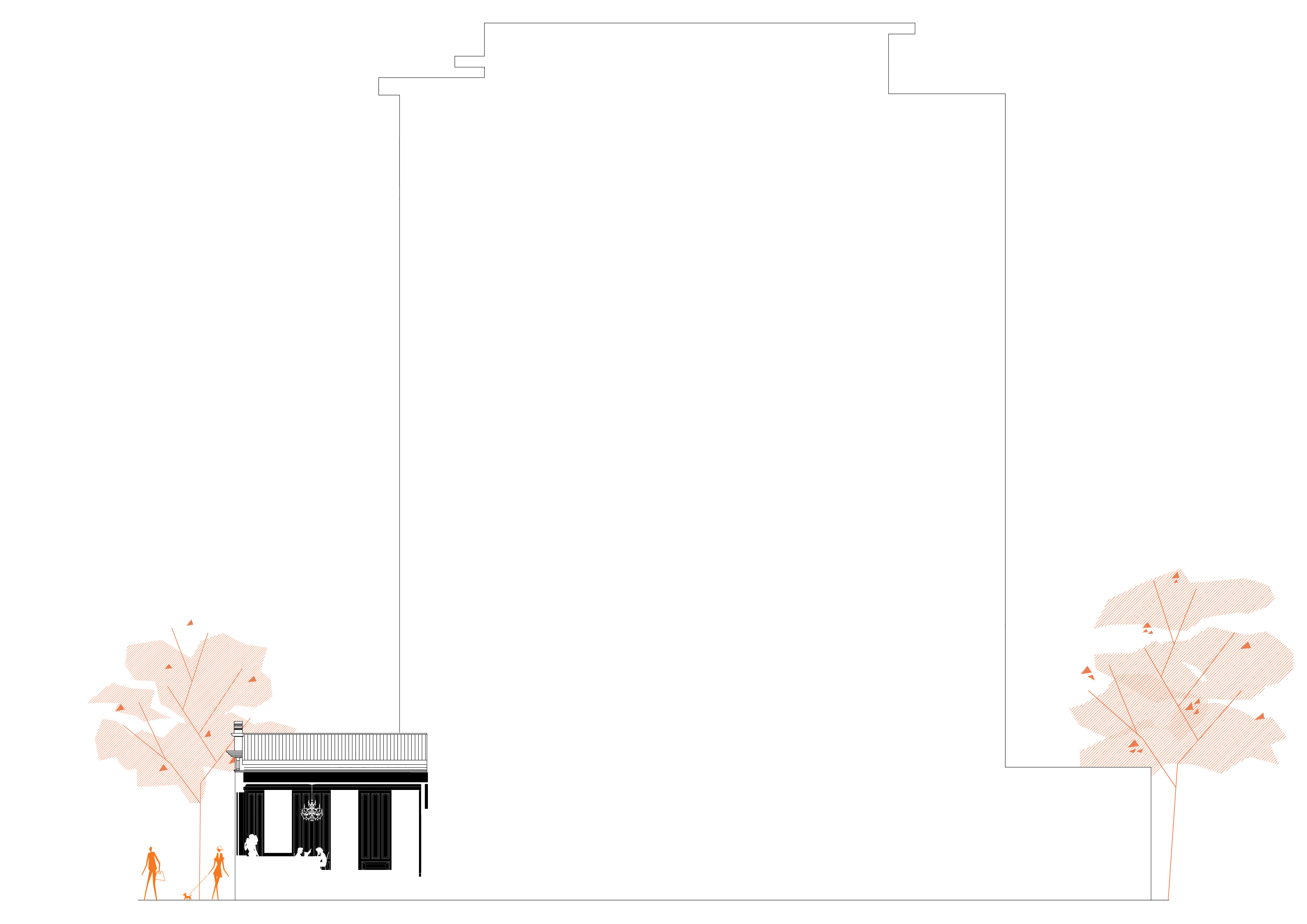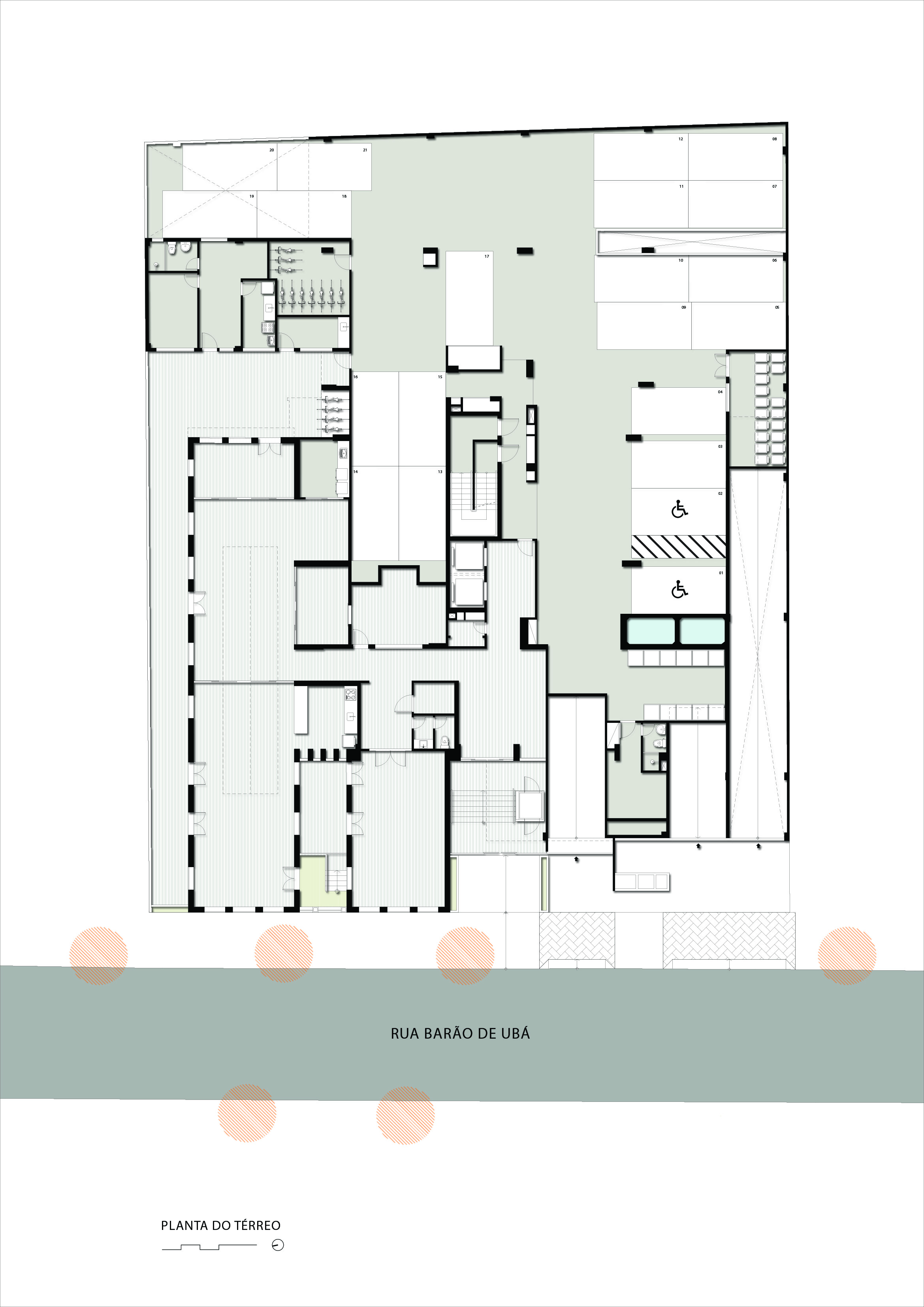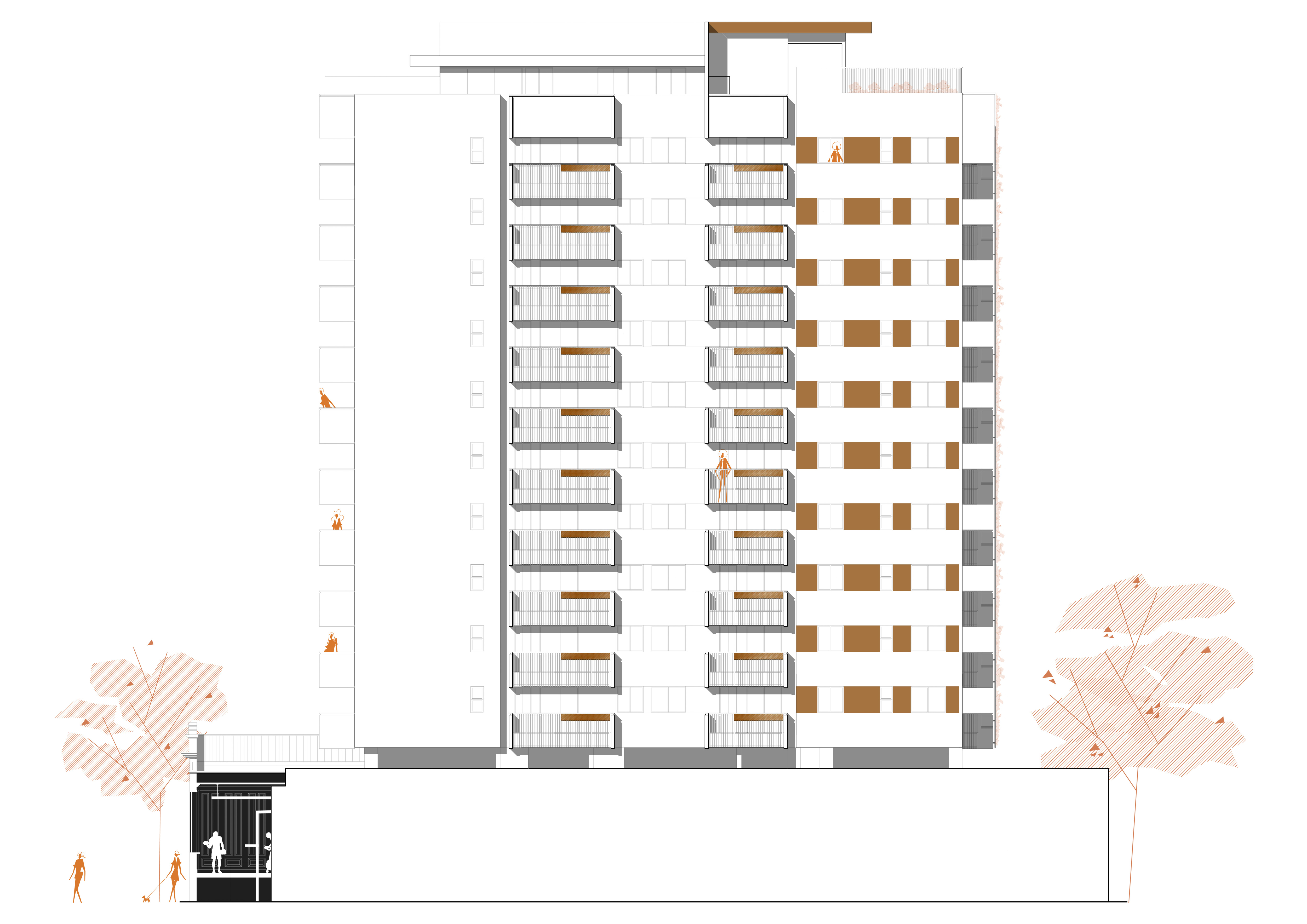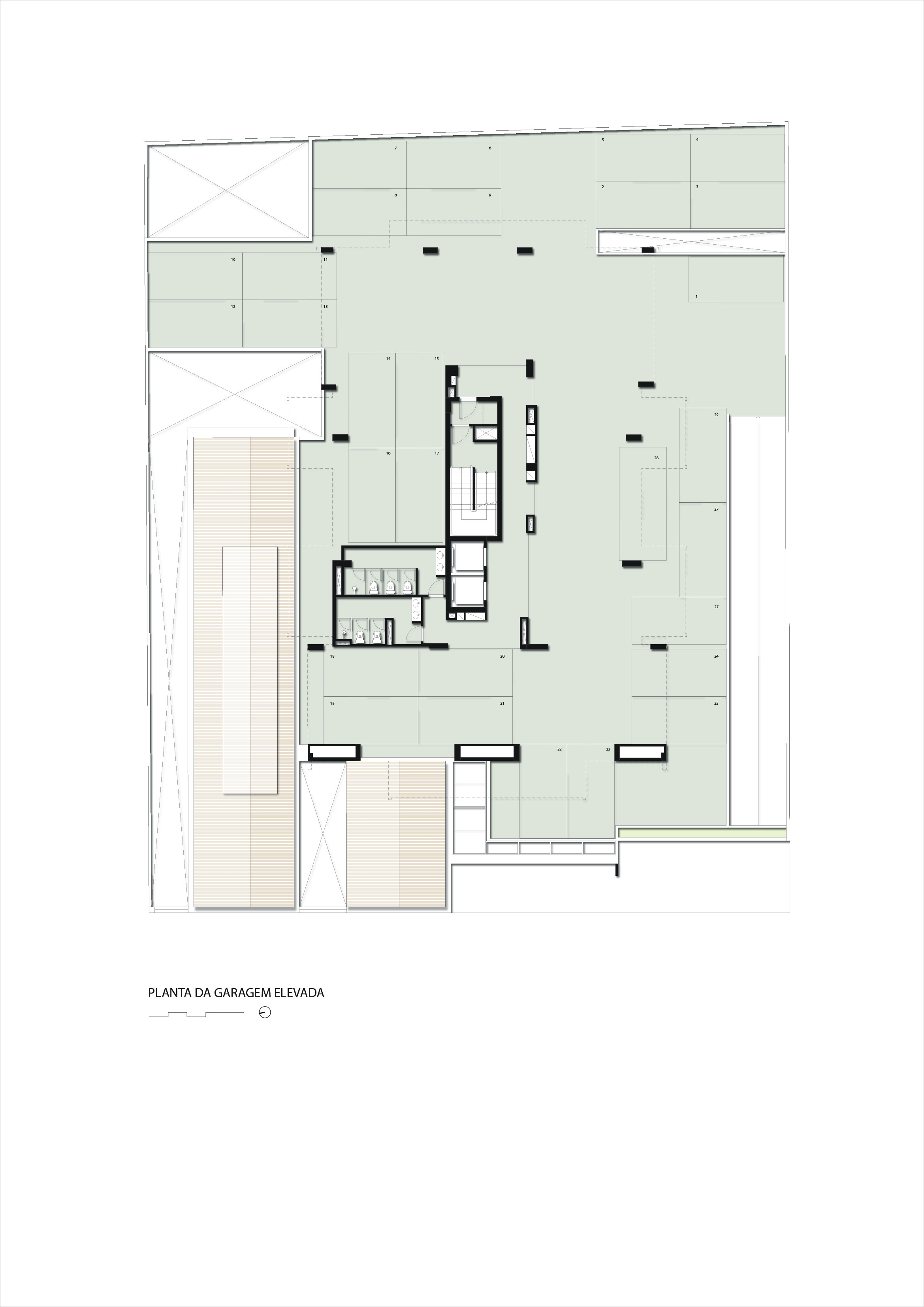 Com a premissa da integração entre passado e presente, elaboramos proposições diferentes para cada uma das três partes que compõem o projeto. No embasamento, espaço conector entre os sobrados e o novo edifício, foram distribuídas as funções mais utilitárias e necessárias a um prédio residencial. A exemplo do acesso principal, que se revela através do avanço de um pórtico perfurado para além do limite da fachada e da colocação do nome do empreendimento, sinalizando a entrada do edifício.